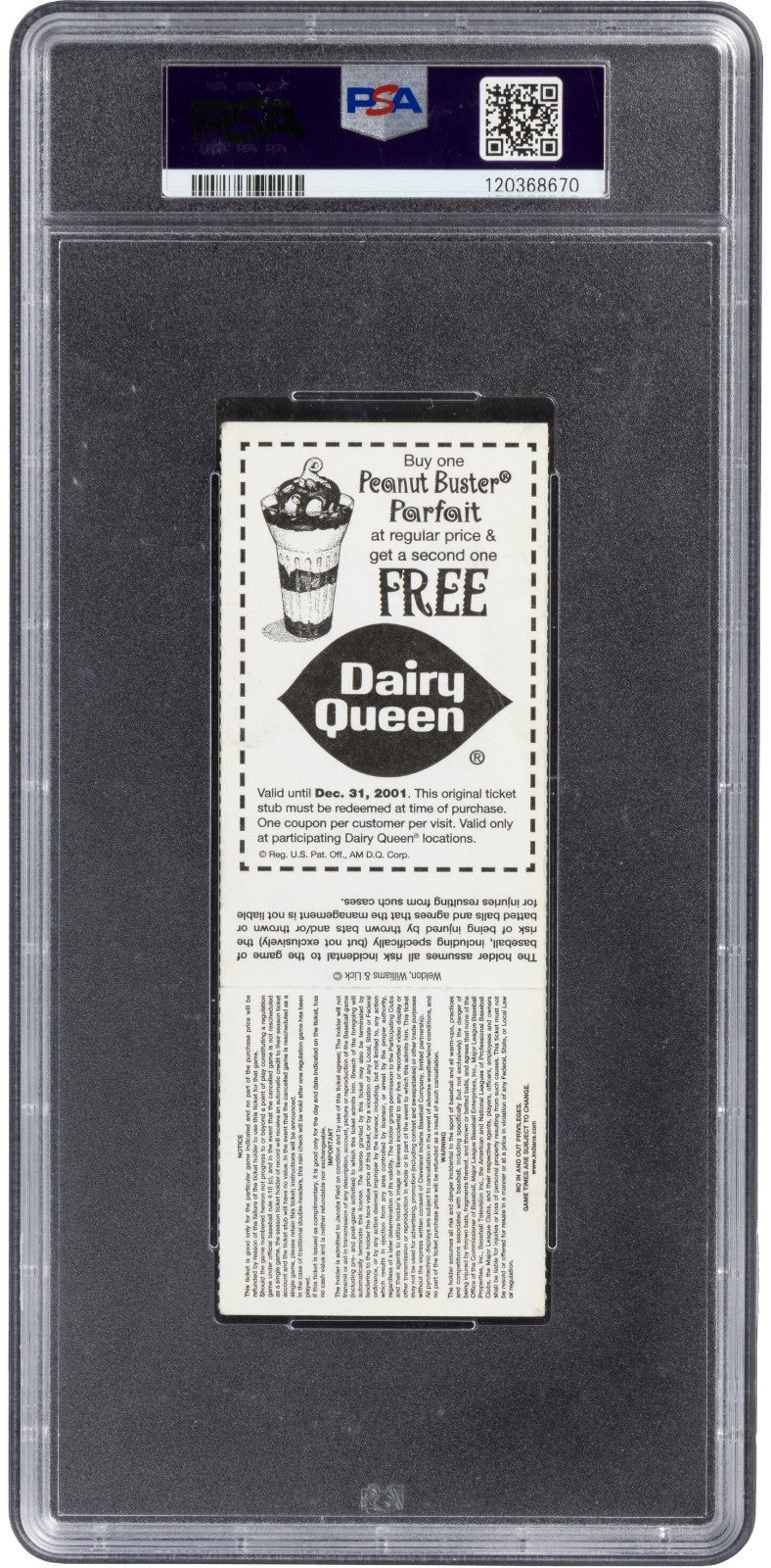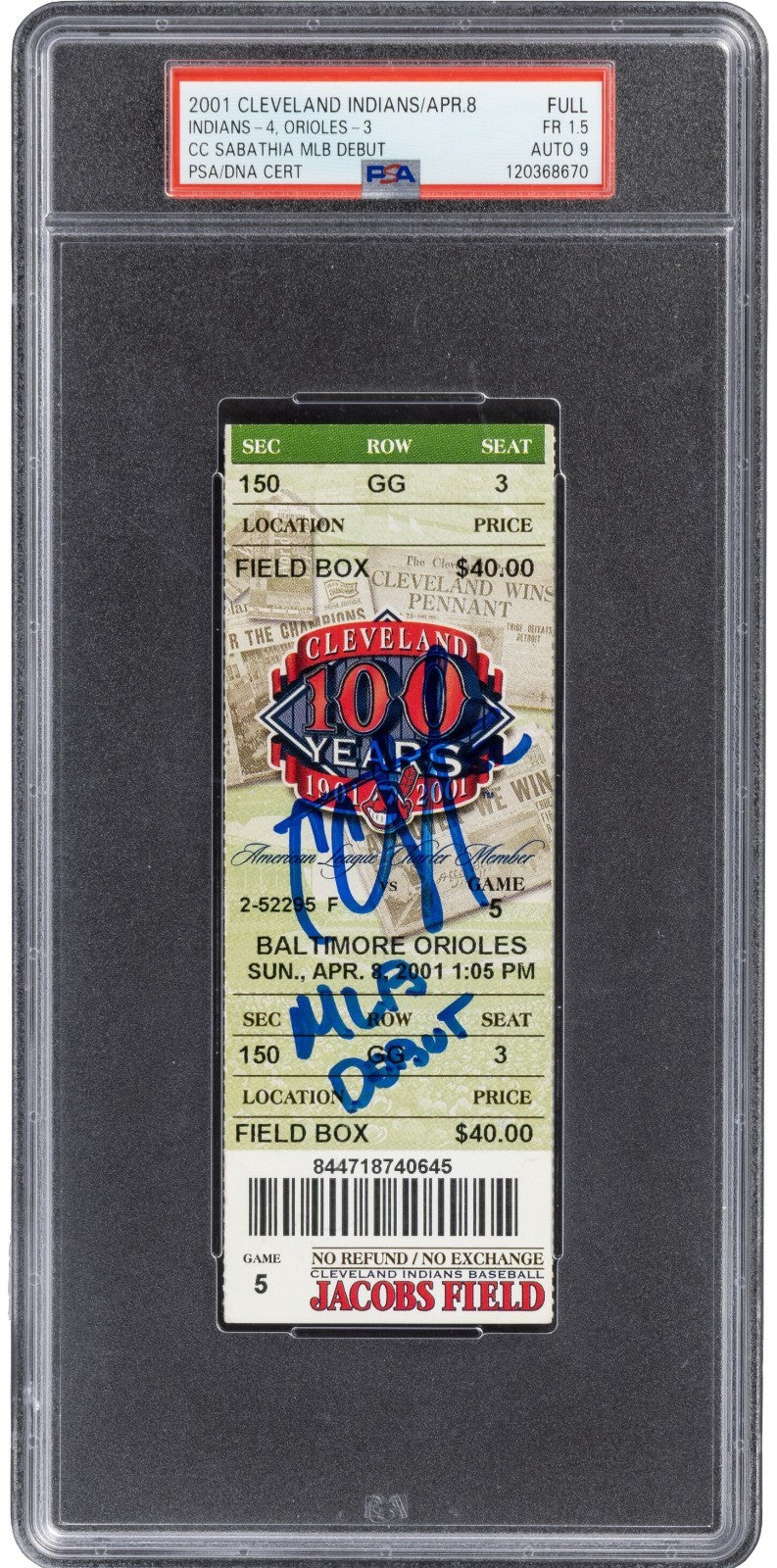 2001 C.C. Sabathia Signed MLB Debut Full Ticket, PSA/DNA FR 1.5 Auto 9 - Pop 1 with 3 Higher. CC Sabathia was a dominant left-handed MLB pitcher, known for his power, leadership, and longevity. A six-time All-Star and 2009 World Series champion, he surpassed 3,000 career strikeouts. Here we offer a full ticket from his MLB that he has signed in Mint sharpie. Encapsulated by PSA/DNA, FR 1.5 Auto 9.