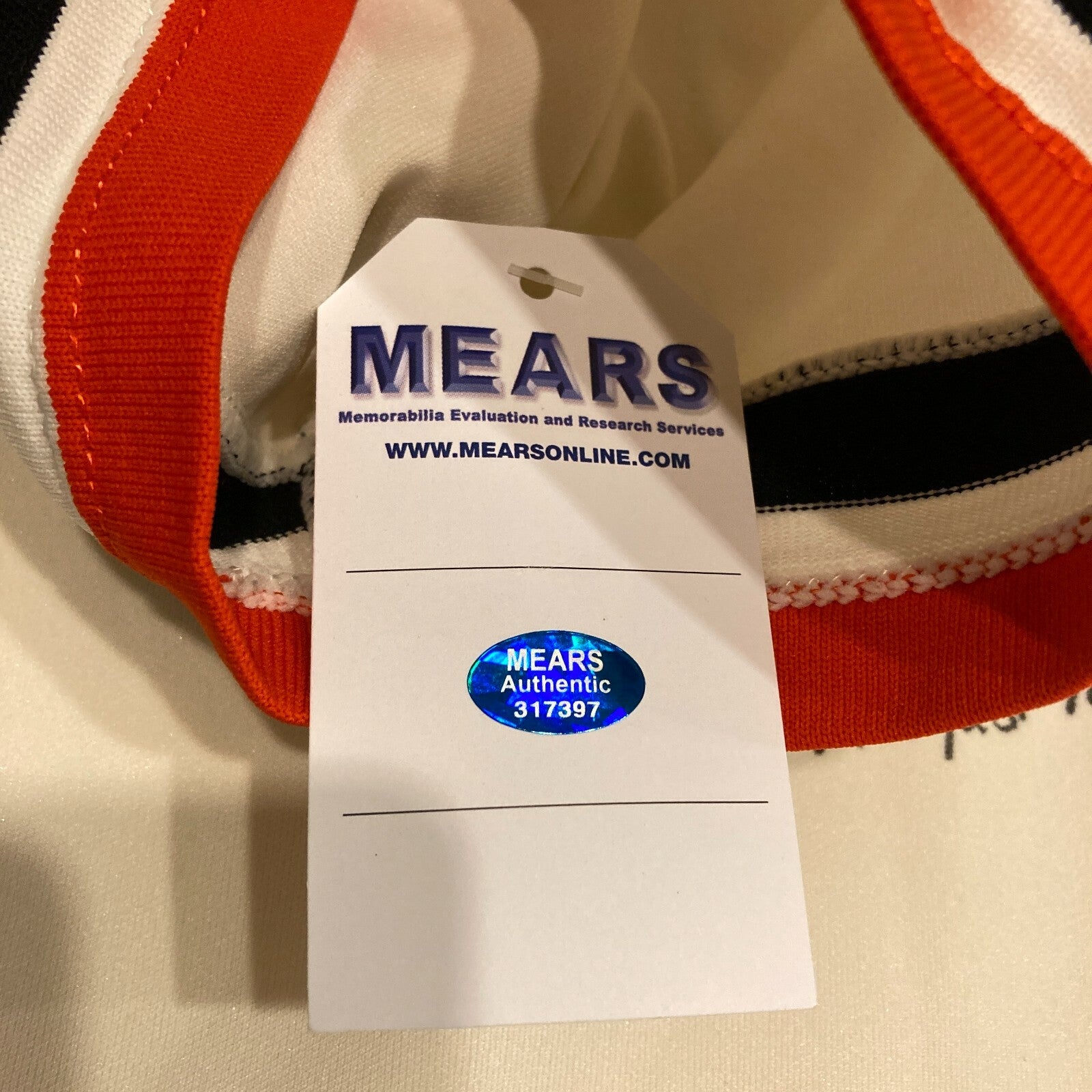 This home white jersey has “Orioles” across the chest in orange and black tackle twill script above his immortal number “8” in the same colors. The collar and sleeve openings are ringed in orange, black and white ribbing. A red size 42 Rawlings label is sewn inside the right front tail along with a “SET 1 1980” hang tag. The back has “RIPKEN” across the shoulders in orange and black tackle twill letters on a matching white nameplate. His number “8” is below in orange and black tackle twill. As befits the jersey of a rookie trying to prove himself, there are several stains and scuffs found throughout, most noticeably a stray mark beside the “R” in “RIPKEN” on the nameplate. The tackle twill shows puckering from laundering and light fading from age. The six buttons are intact and appear to be original to the jersey. A tremendous piece of the Ripken story, an historical artifact that was worn by one of baseball’s greatest heroes as he began the career that would see him breaking one of sport’s most untouchable records. Ripken signed the jersey and inscribed "My MLB Debut Game Used Jersey August 10, 1981". This jersey comes with a signed LOA from Cal Ripken, Jr. for the game use and a LOA from MEARS (317397) for the game use, who have graded this jersey its highest grade of A10. Full letter JSA COA for the autograph and inscriptions.