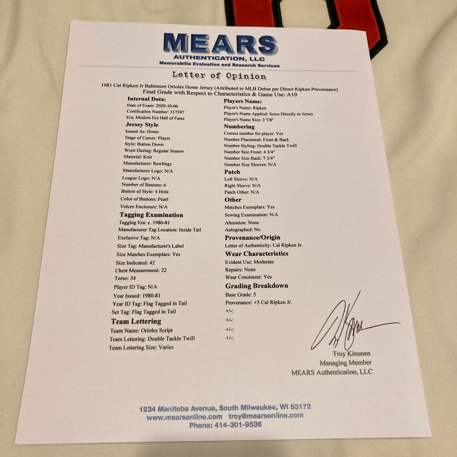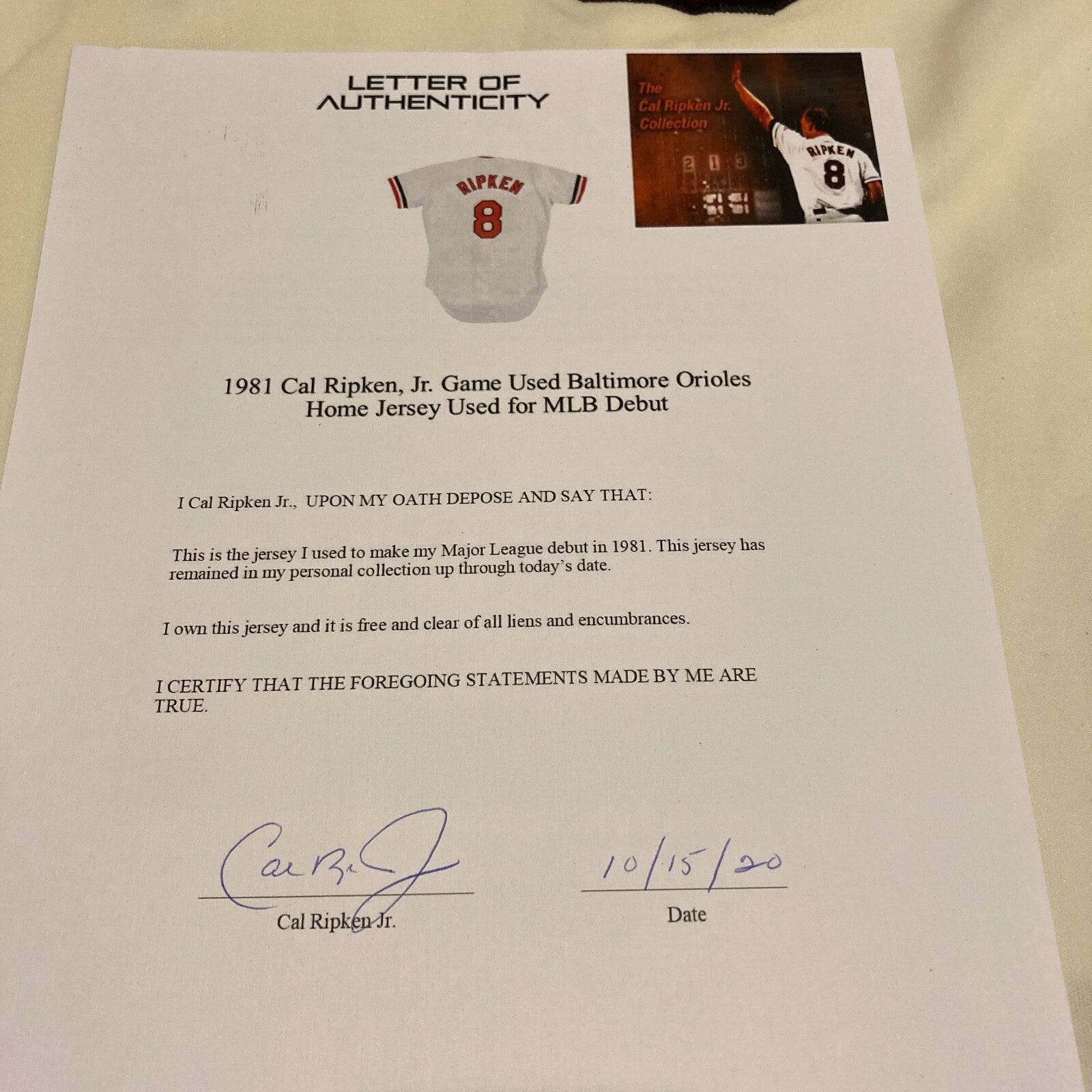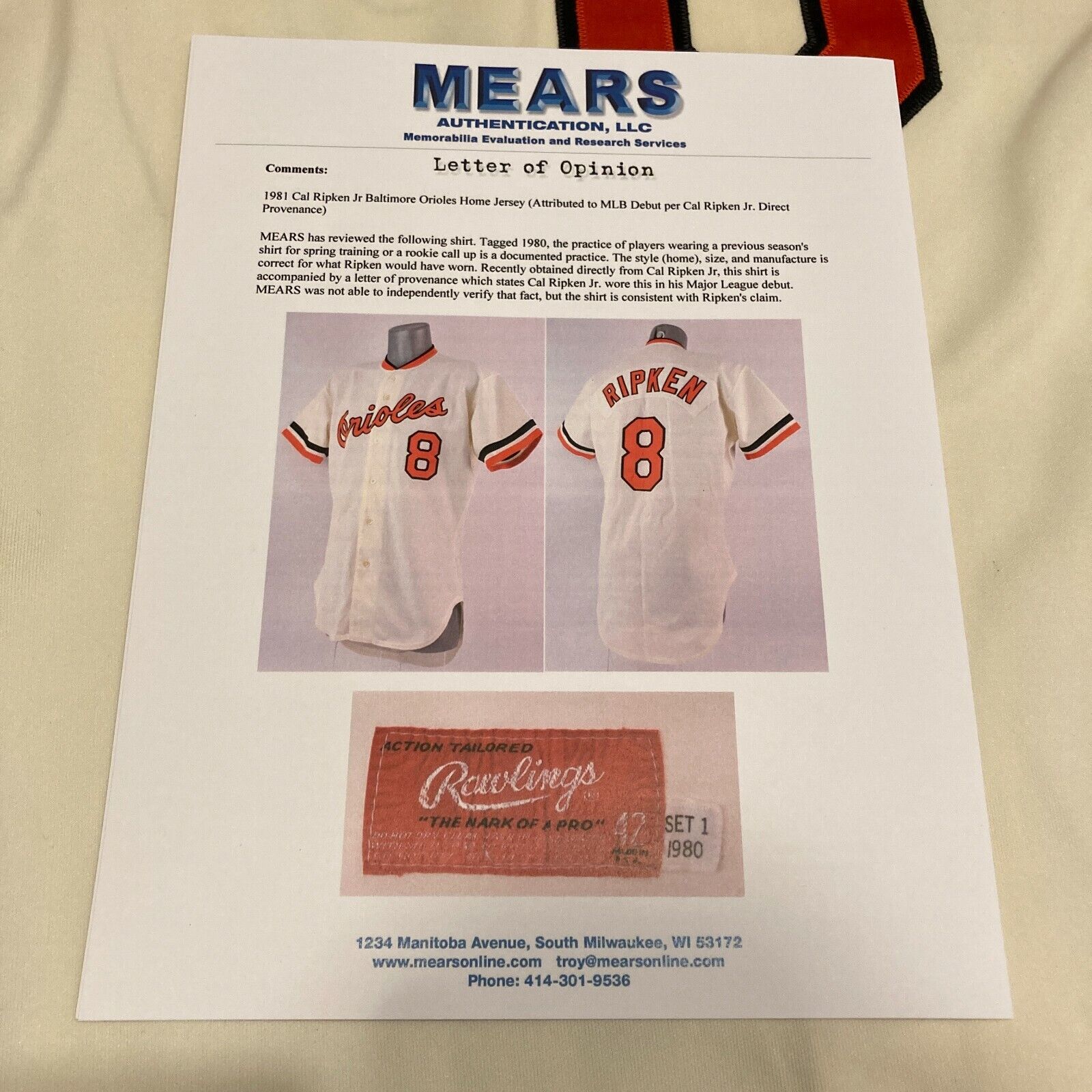 Cal Ripken Jr. 1981 Rookie MLB Debut Signed Game Used Jersey Mears 10 Ripken LOA