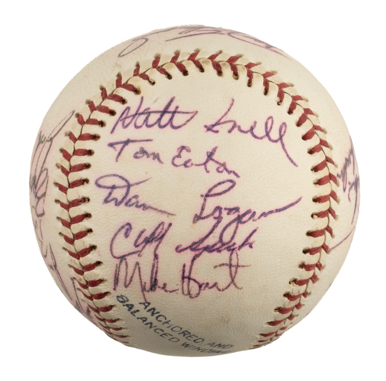 Historically significant Official International League baseball signed in black ink by 20 members of the Rochester Red Wings 1981 minor league team, including Doc Edwards (mgr., sweet spot), Cal Ripken Jr., Mike Boddicker, John Shelby, Bobby Bonner, Floyd Rayford, Chris Bourjois, Tom Chism, and Nate Snell. Ripken Jr. was called up from the Rochester farm team to join the Baltimore Orioles immediately following the 1981 players' strike and thus began his record-breaking streak of consecutive games played, long held by baseball's "Iron Horse," Lou Gehrig. A future first-ballot Hall of Famer, Ripken Jr. was voted Rookie of the Year in the International League during the 1981 season and was picked as the top major league prospect in a survey of league executives. The ball is overall in Excellent condition. Full LOA from James Spence/JSA.