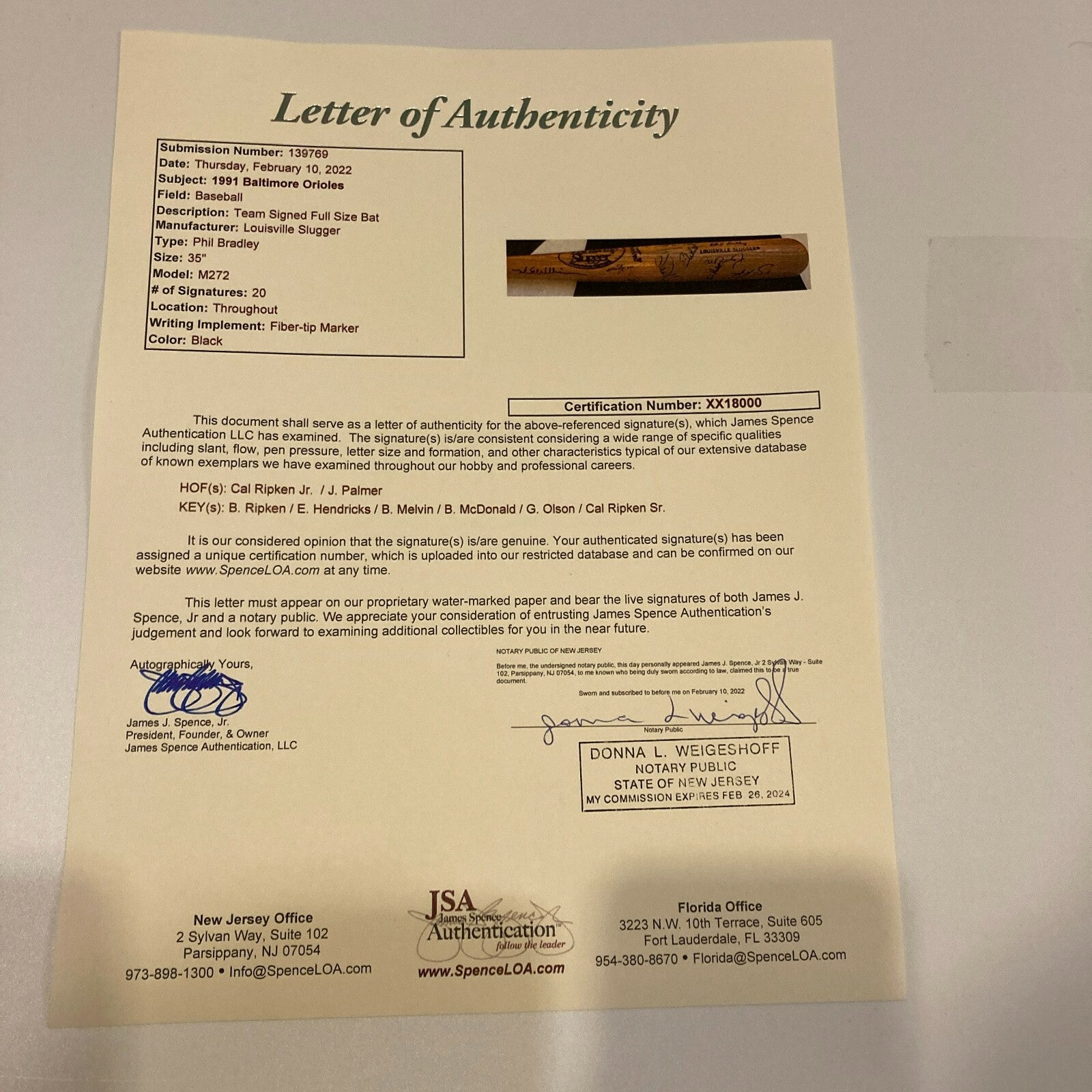 1990 Baltimore Orioles team signed Phil Bradley professional model baseball bat (EX). 35" Louisville Slugger M272 c.1989 Phil Bradley model bat signed by (22) members of the 1991 Orioles including broadcaster Jim Palmer, Cal Ripken Sr, Cal Ripken Jr, Billy Ripken, Ben McDonald, Mickey Tettleton, Gregg Olson, Mark Williamson, Dave Johnson, Tim Hulett, Sam Horn, Bob Melvin, and others.