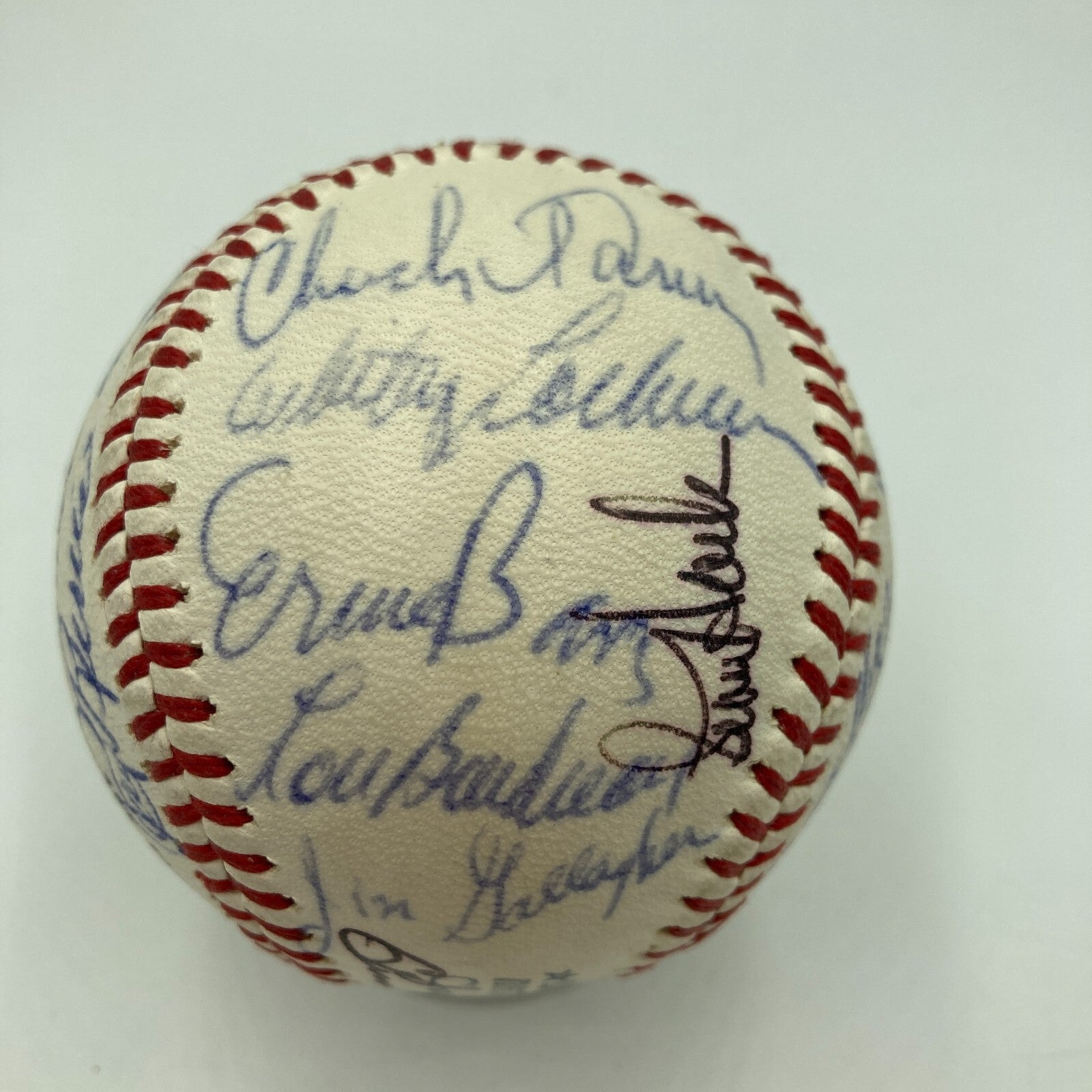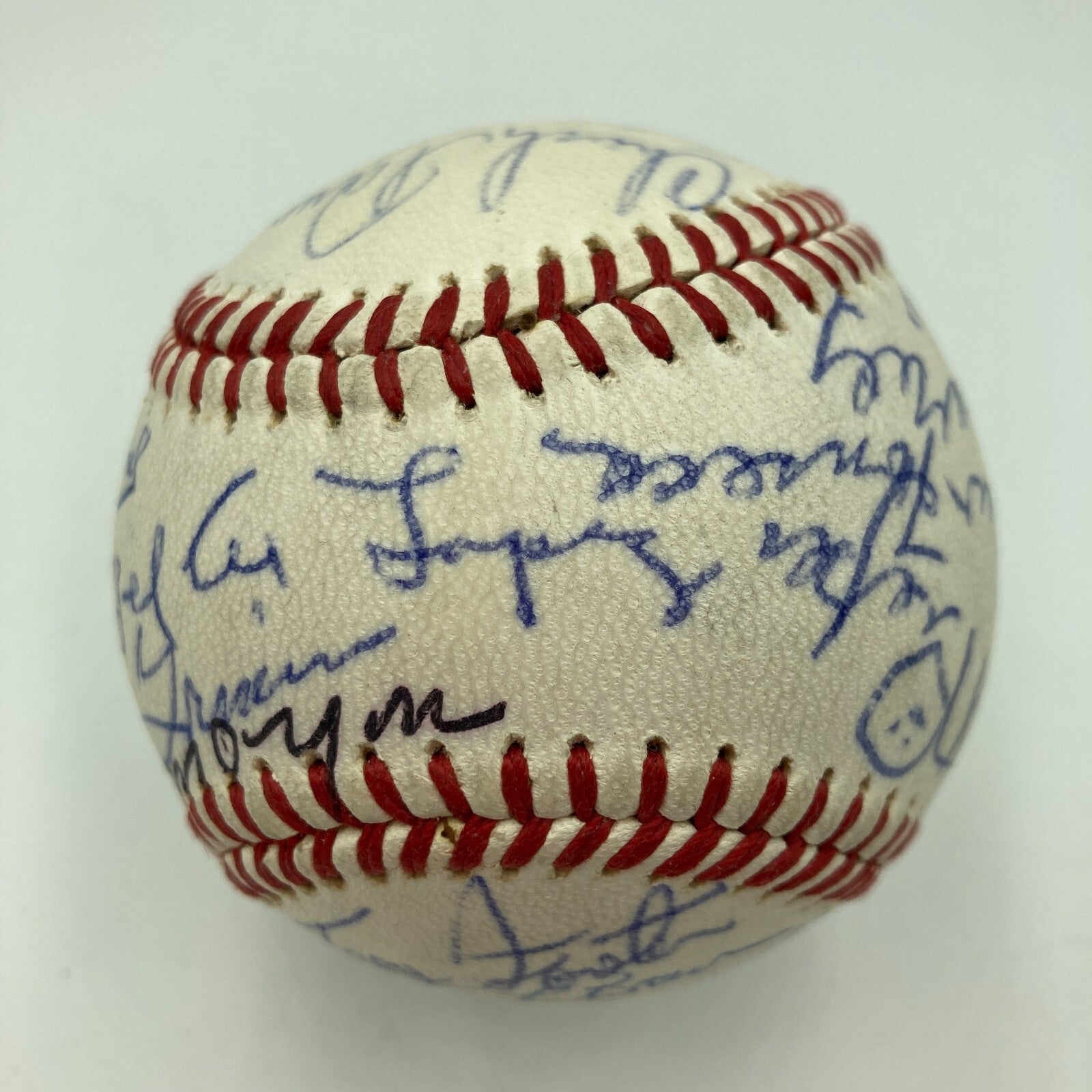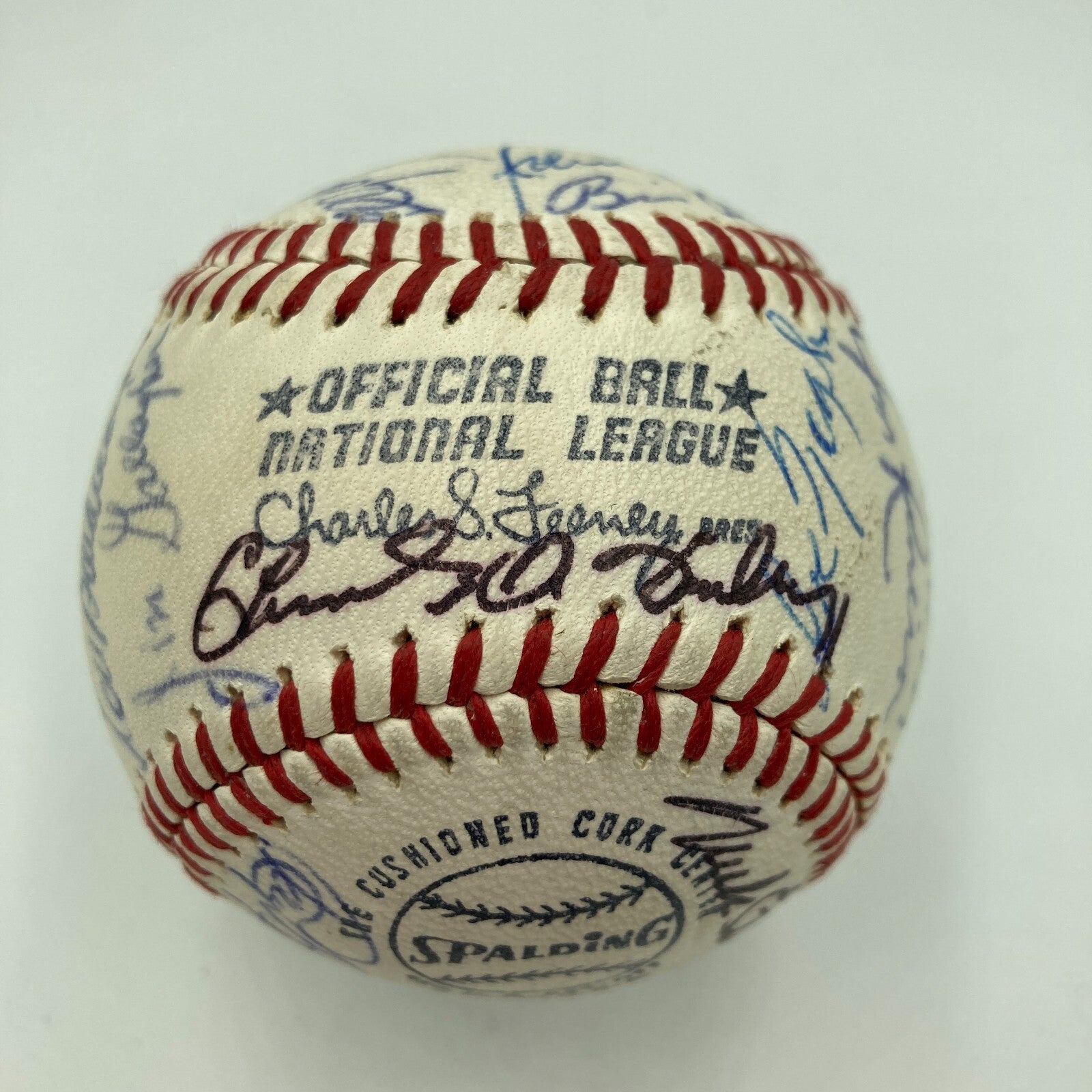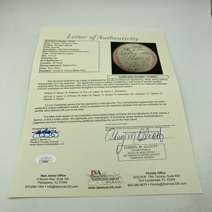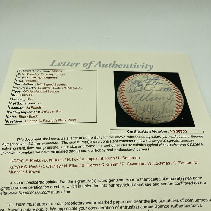 C.Feeney NL ball signed by (26) including Nelson Fox, Ernie Banks, Lou Boudreau, Al Lopez, Bowie Kuhn, Warren Giles, Charles O. Finley, Bill Pierce, Phil Cavarretta, Charlie Grimm, Chuck Tanner, Whitey Lockman, Stan Hack, Nick Etten, Lew Fonseca, Jim Gallagher, Moose Moryn, Jim Rivera, Joe L. Brown, Edgar Munzel, Pat Pieper, and others.