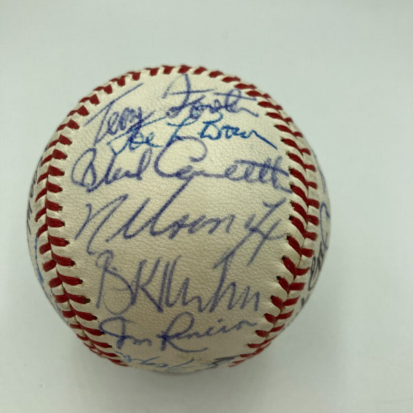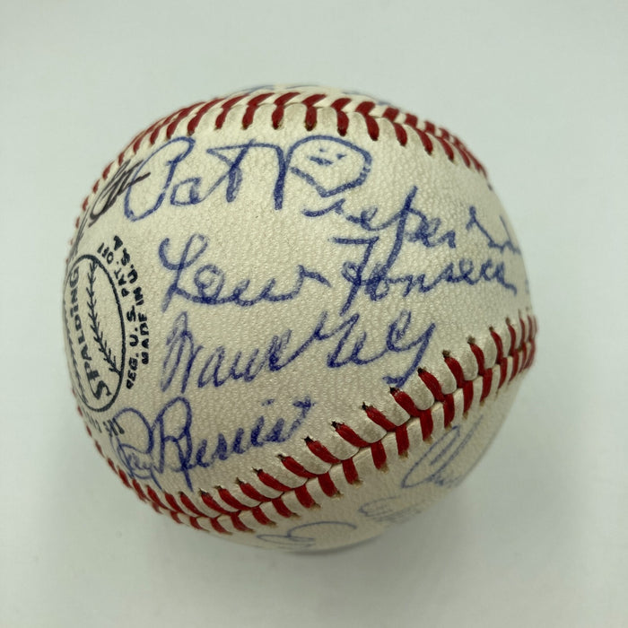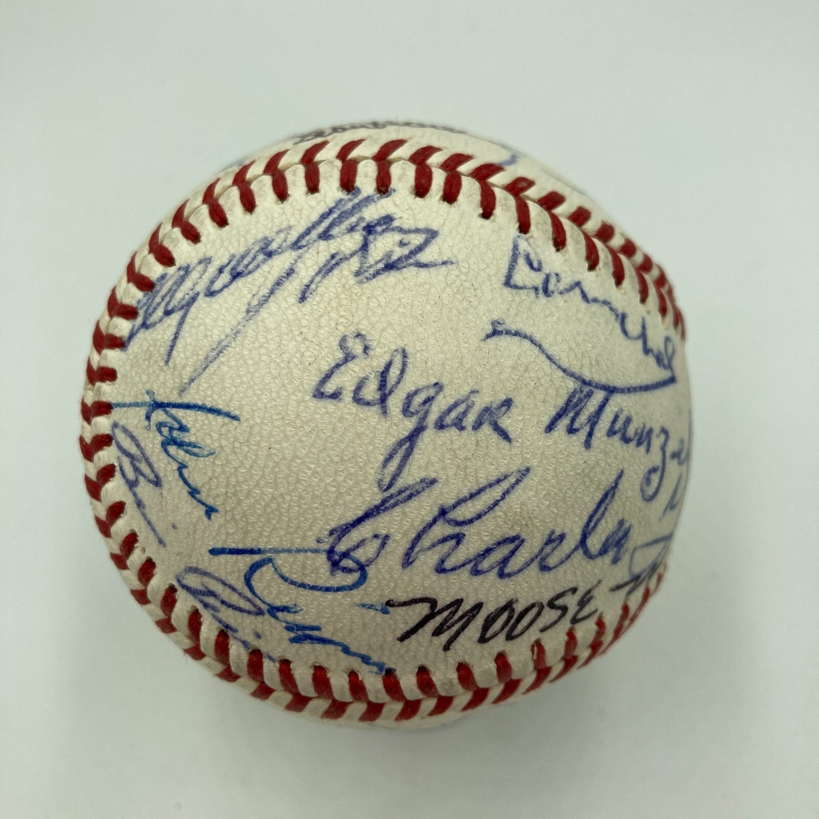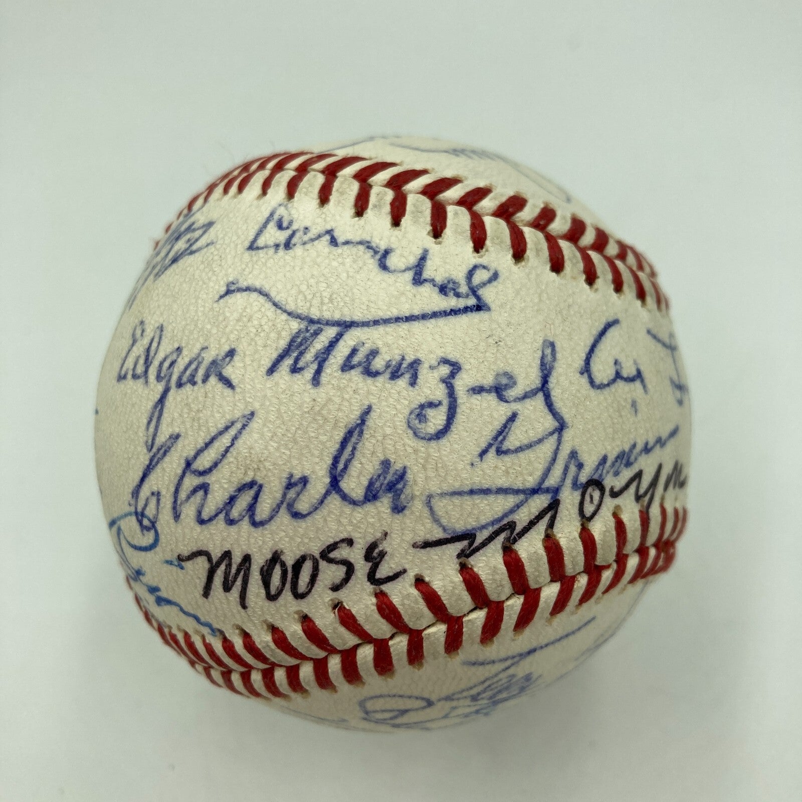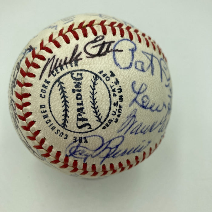 C.Feeney NL ball signed by (26) including Nelson Fox, Ernie Banks, Lou Boudreau, Al Lopez, Bowie Kuhn, Warren Giles, Charles O. Finley, Bill Pierce, Phil Cavarretta, Charlie Grimm, Chuck Tanner, Whitey Lockman, Stan Hack, Nick Etten, Lew Fonseca, Jim Gallagher, Moose Moryn, Jim Rivera, Joe L. Brown, Edgar Munzel, Pat Pieper, and others.