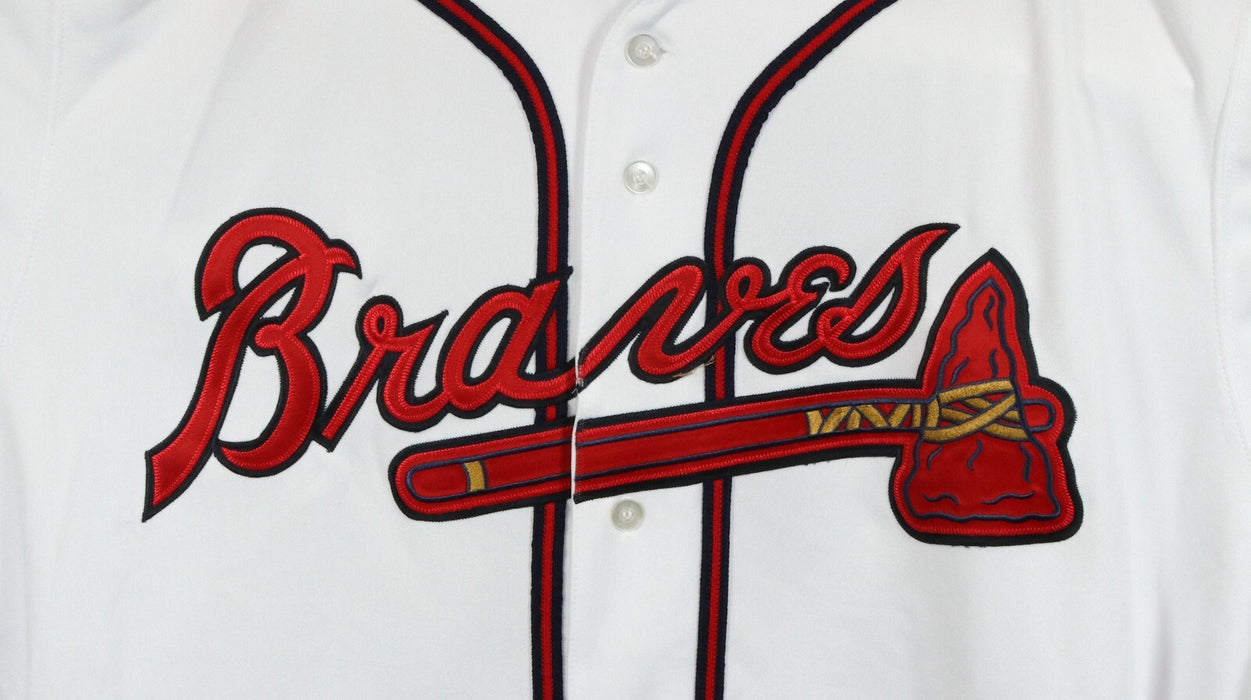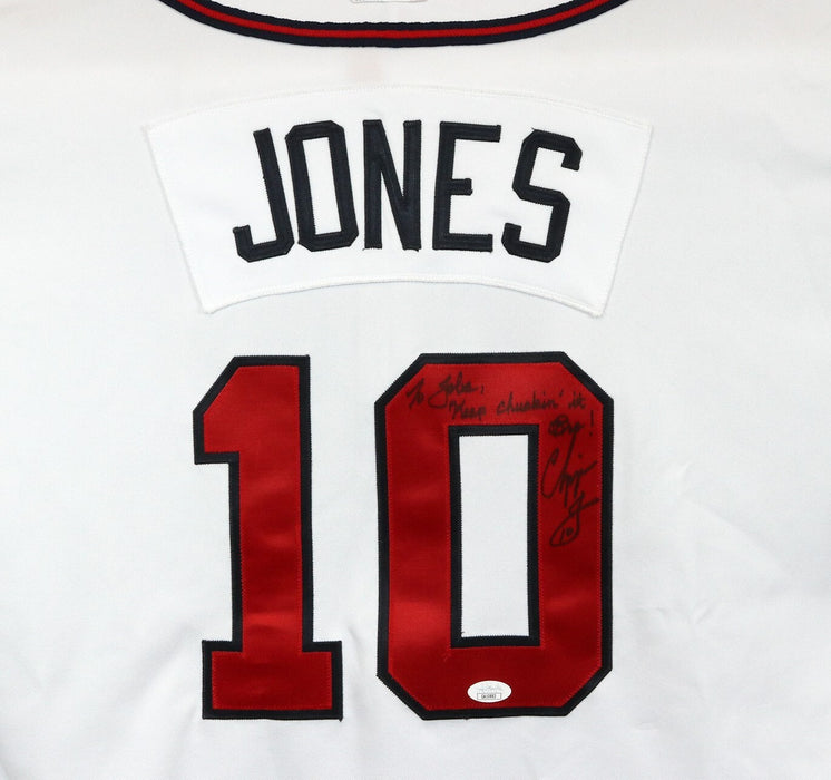 Classic white Atlanta Braves jersey with red and blue piping, signed and personalized by Chipper Jones (HOF) to Joba Chamberlain in black ink on the #10 numbers. Basic cert by James Spence Authentication.
