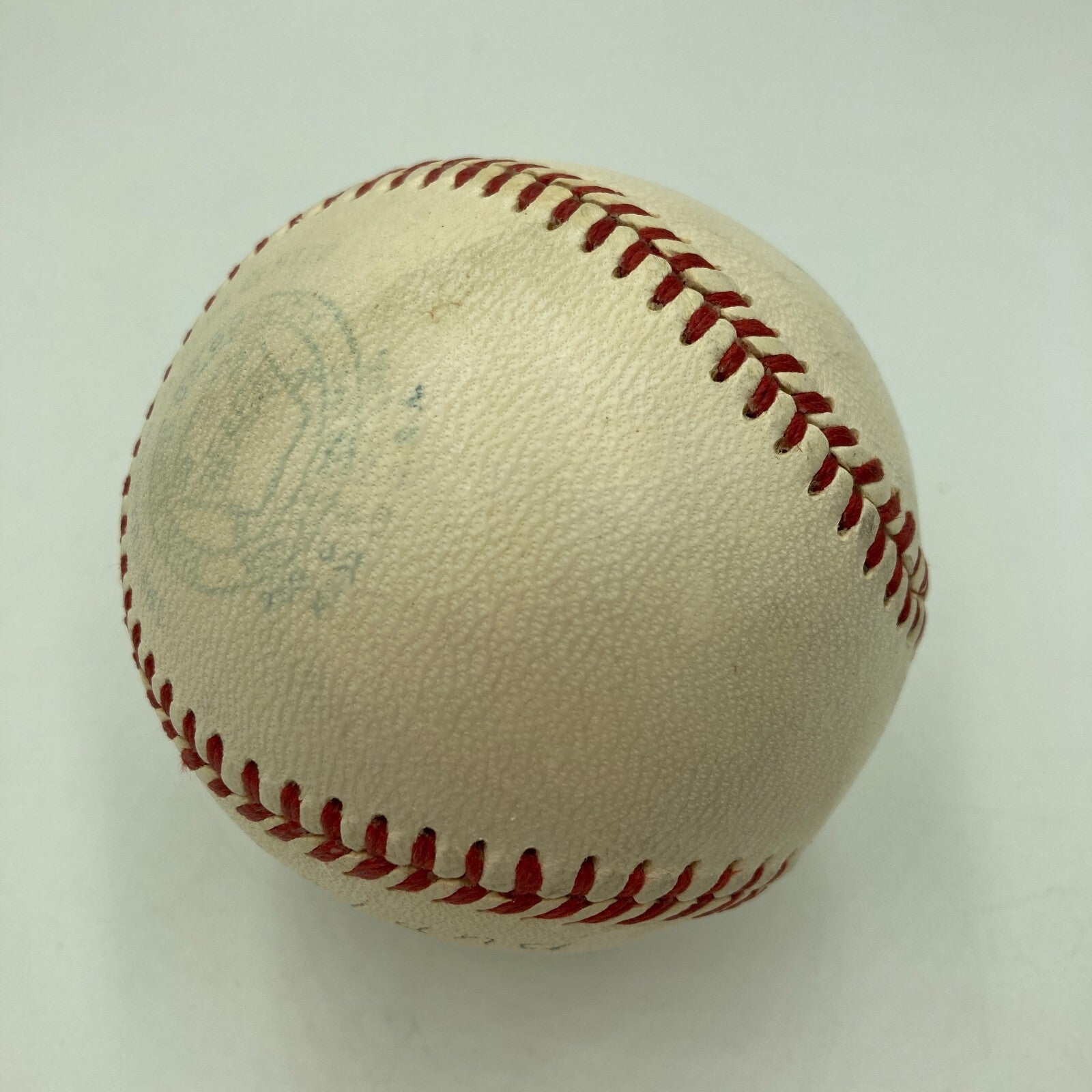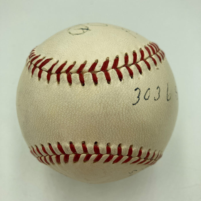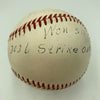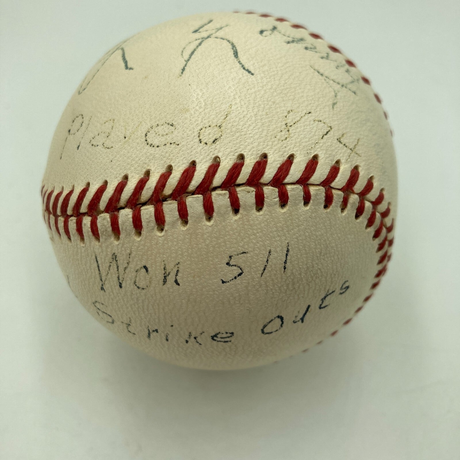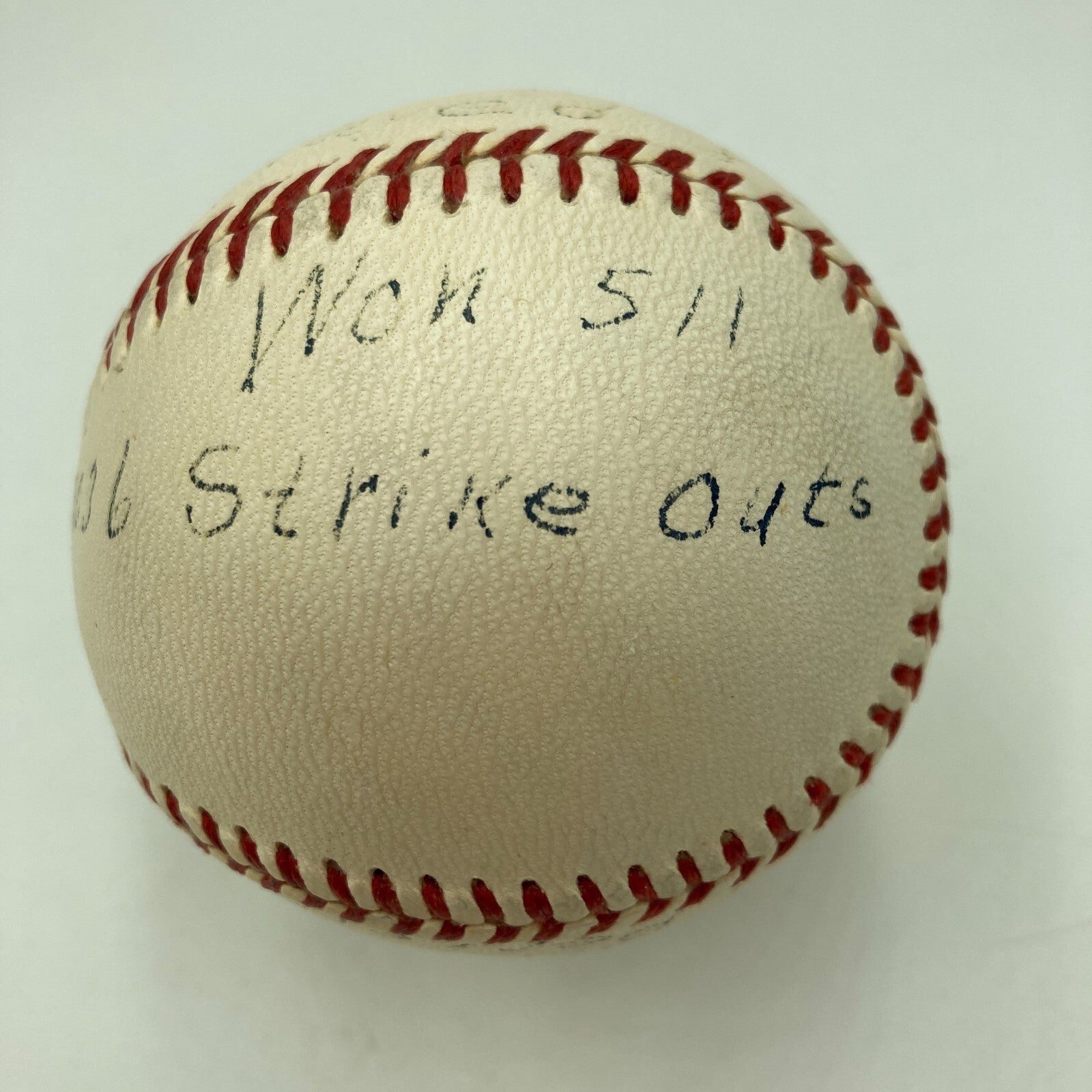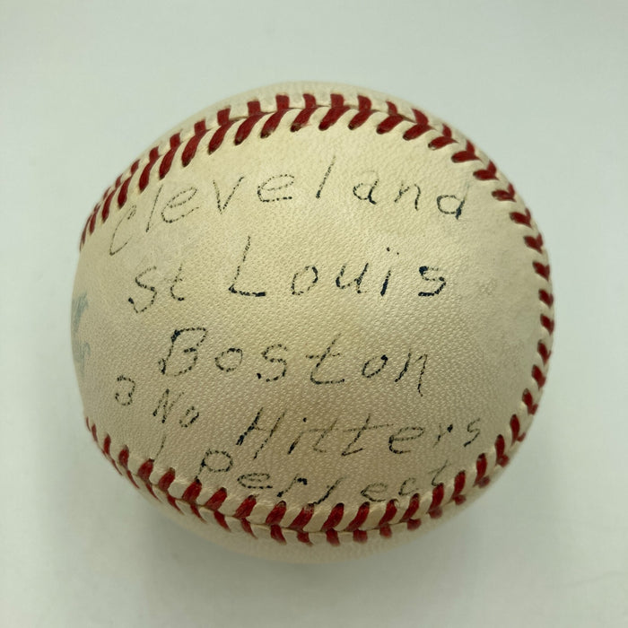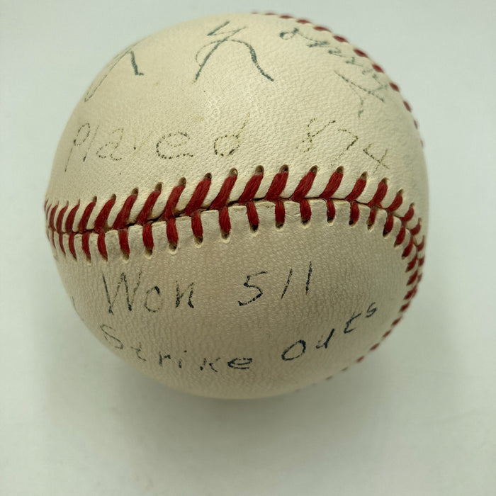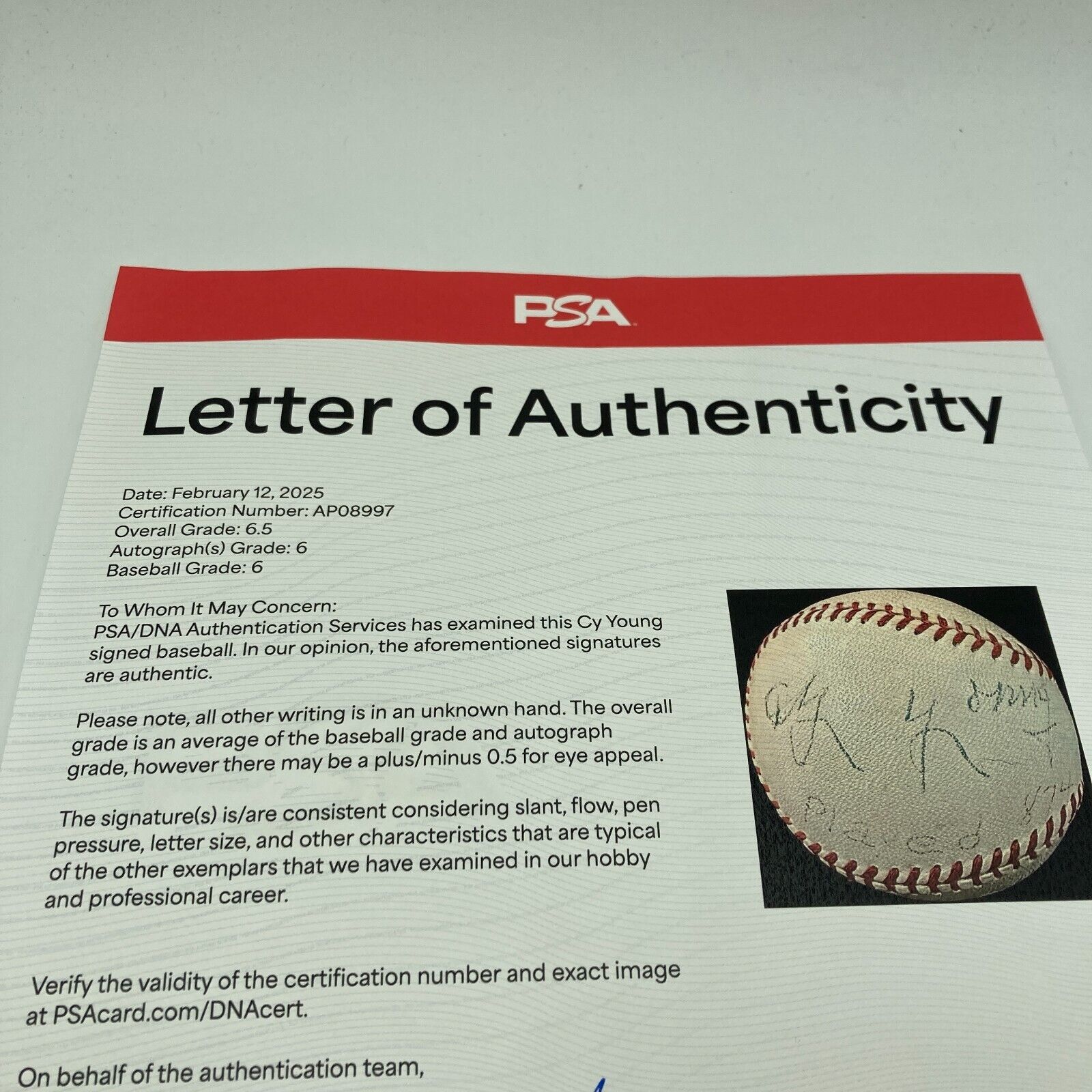 Offered is a Cy Young single-signed baseball. Graded EX-MT+ 6.5 overall by PSA. The great Cy Young signed this Official American League (Harridge) baseball ball on the side panel with a blue ballpoint pen. There are several inscriptions on the ball, that were written in an unknown hand. The inscriptions read, "Won 511," "3036 strike outs," "Cleveland," "St. Louis," "Boston," "3 No Hitters," "Perfect," and "Played 874." The text chronicles key accomplishments in Young's illustrious career. Full LOA from PSA. Also comes with a full LOA from JSA.
