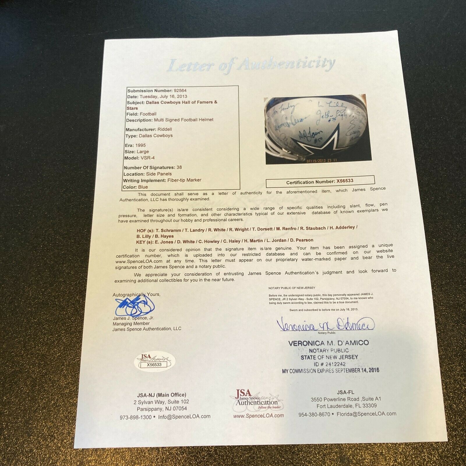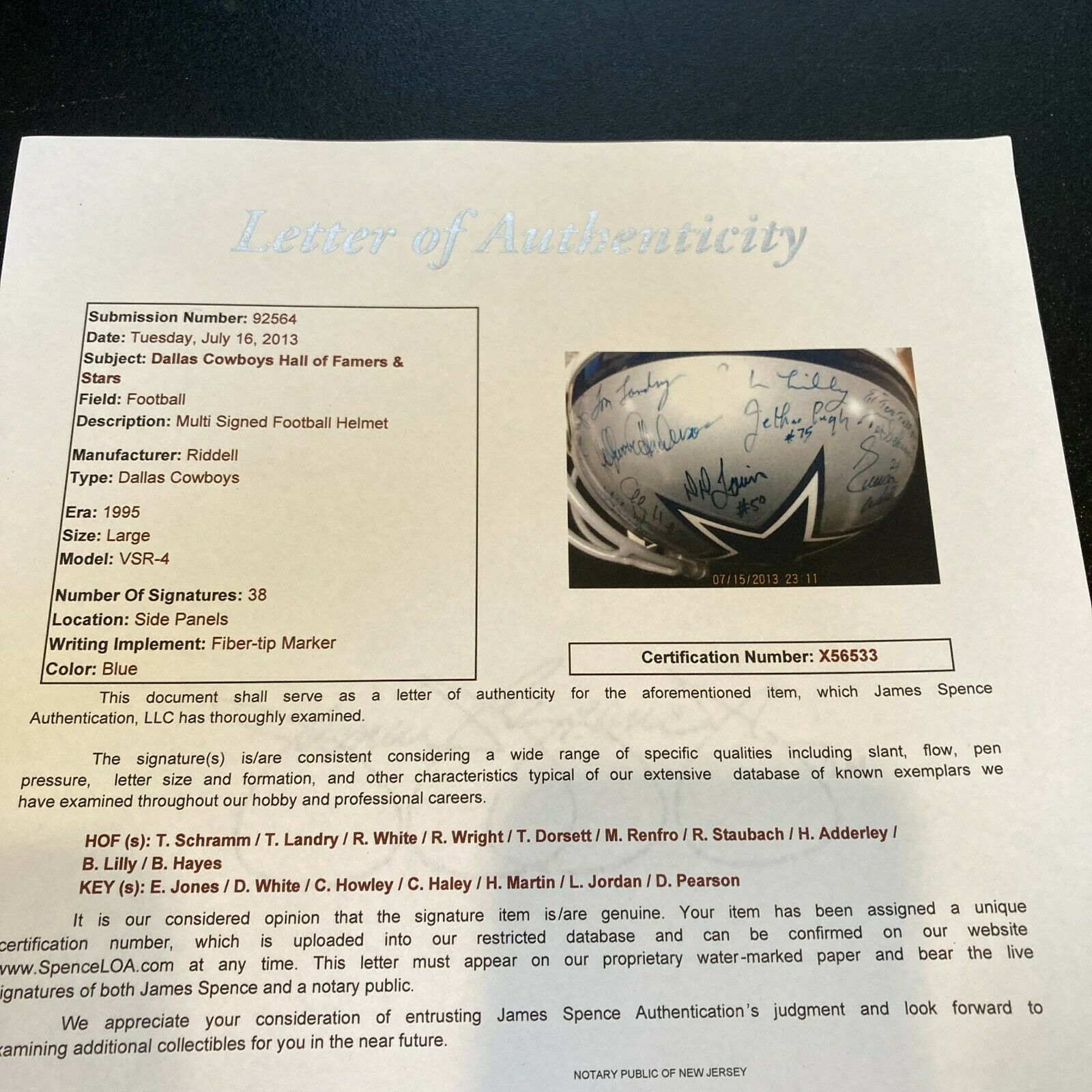 Top of the line VSR-4 full sized helmet by Riddell has been signed by (38) with highlights including Tom Landry, Roger Staubach, Tex Schramm, Tony Dorsett, Bob Lilly, Mel Renfro, Walt Garrison, Preston Pearson, Bob Hayes, Rayfield Wright, Drew Pearson, Herb Adderley, Jethro Pugh, Ed Jones, Randy White, Chuck Howley, LeRoy Jordan, Harvey Martin, and others. Comes with Full LOA from JSA: