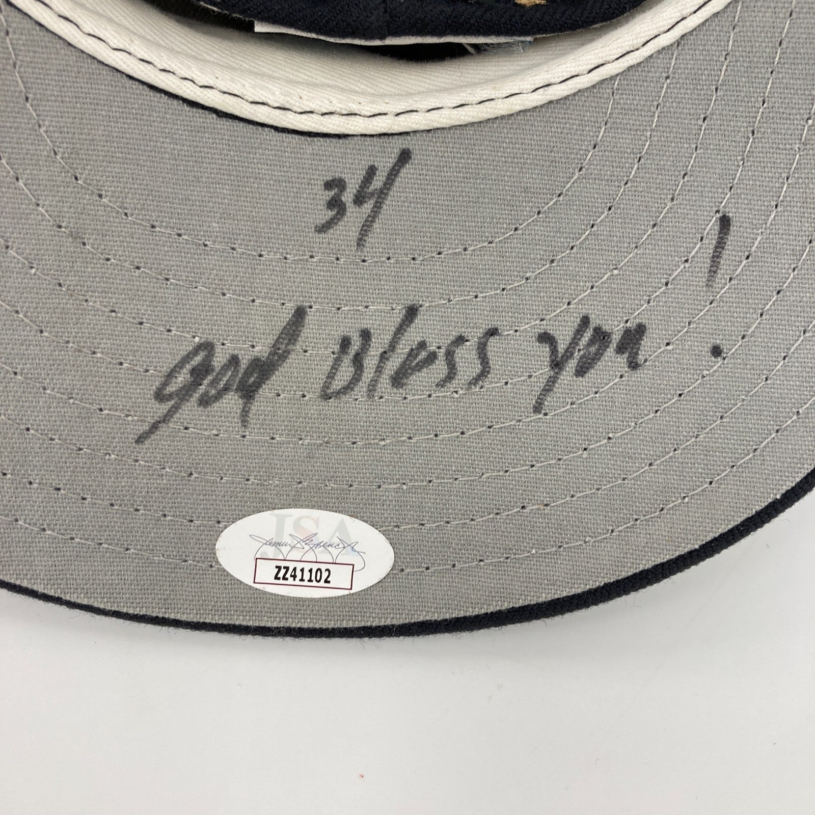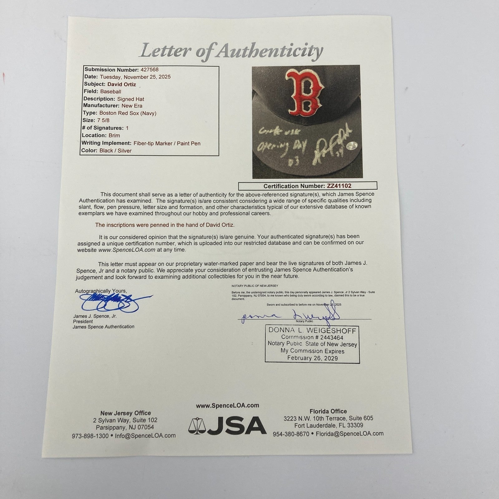 2003 David Ortiz autographed and "Game Use Opening Day" inscribed Boston Red Sox game used professional model hat. This is the first hat which David Ortiz wore in a game as a member of the Red Sox. Classic style done in dark blue with a red and white "B" team logo embroidered on front. "New Era" and size "7 5/8" tags are on the interior band and "34 god Bless you!" is written under the brim in marker. Signed "Game use, Opening Day 03, David Ortiz 34" in silver marker. Ortiz joined the Red Sox for the 2003 season after a rather unremarkable streak of (6) years in Minnesota. He blossomed in Boston and by the following year helped lead them to a long awaited World Series title.
