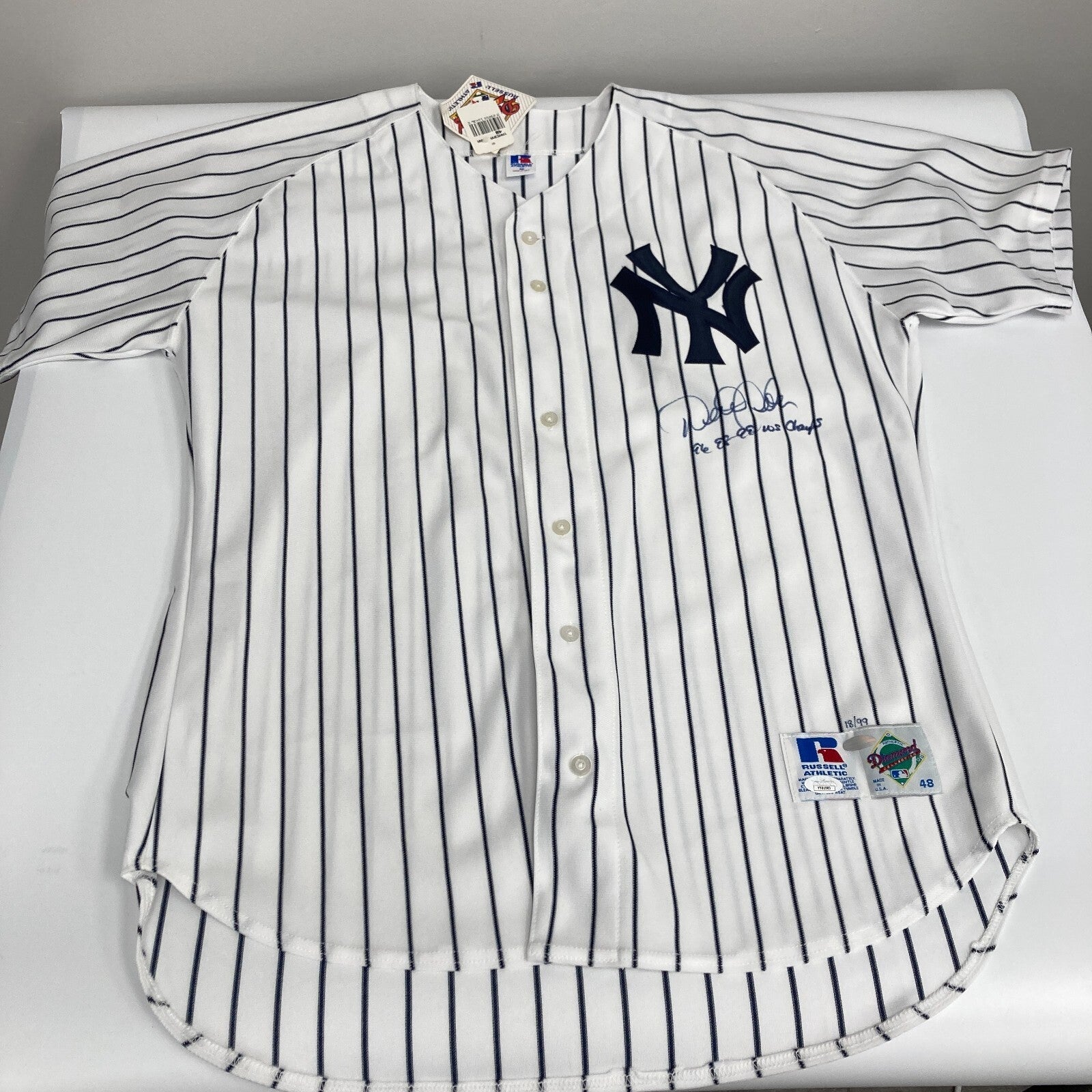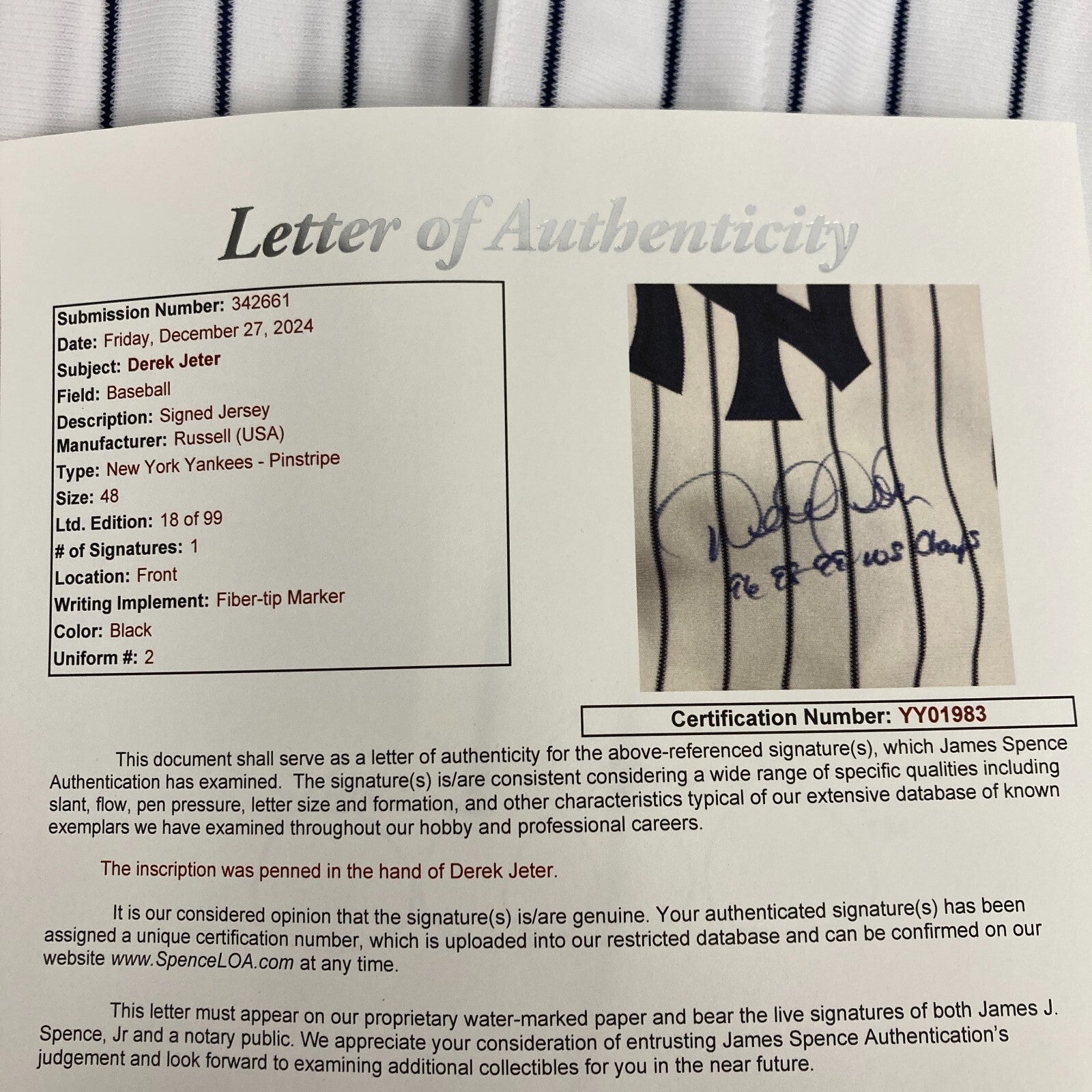 Click or scroll to zoom Tap or pinch to zoom Click or scroll to zoom Tap or pinch to zoom Click or scroll to zoom Tap or pinch to zoom Click or scroll to zoom Tap or pinch to zoom Click or scroll to zoom Tap or pinch to zoom Click or scroll to zoom Tap or pinch to zoom Click or scroll to zoom Tap or pinch to zoom Click or scroll to zoom Tap or pinch to zoom Derek Jeter 1996, 1998, 1999 World Series Champs Signed Yankees Jersey JSA COA Sold out 1 2 3 4 5 6 7 8 9 10+ Quantity Quantity Sold out Derek Jeter 1996, 1998, 1999 World Series Champs Signed Inscribed Authentic Game Model Russell New York Yankees Jersey. Comes with full letter COA from JSA. Section #8