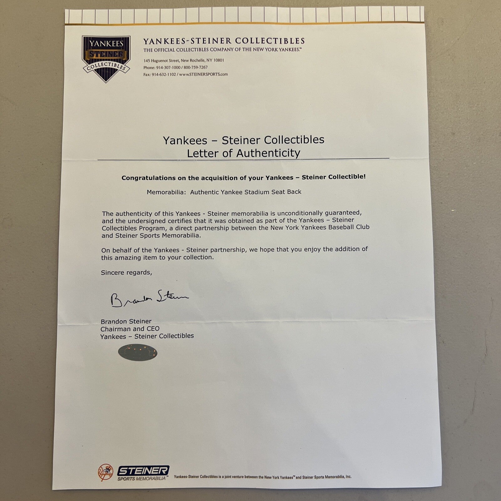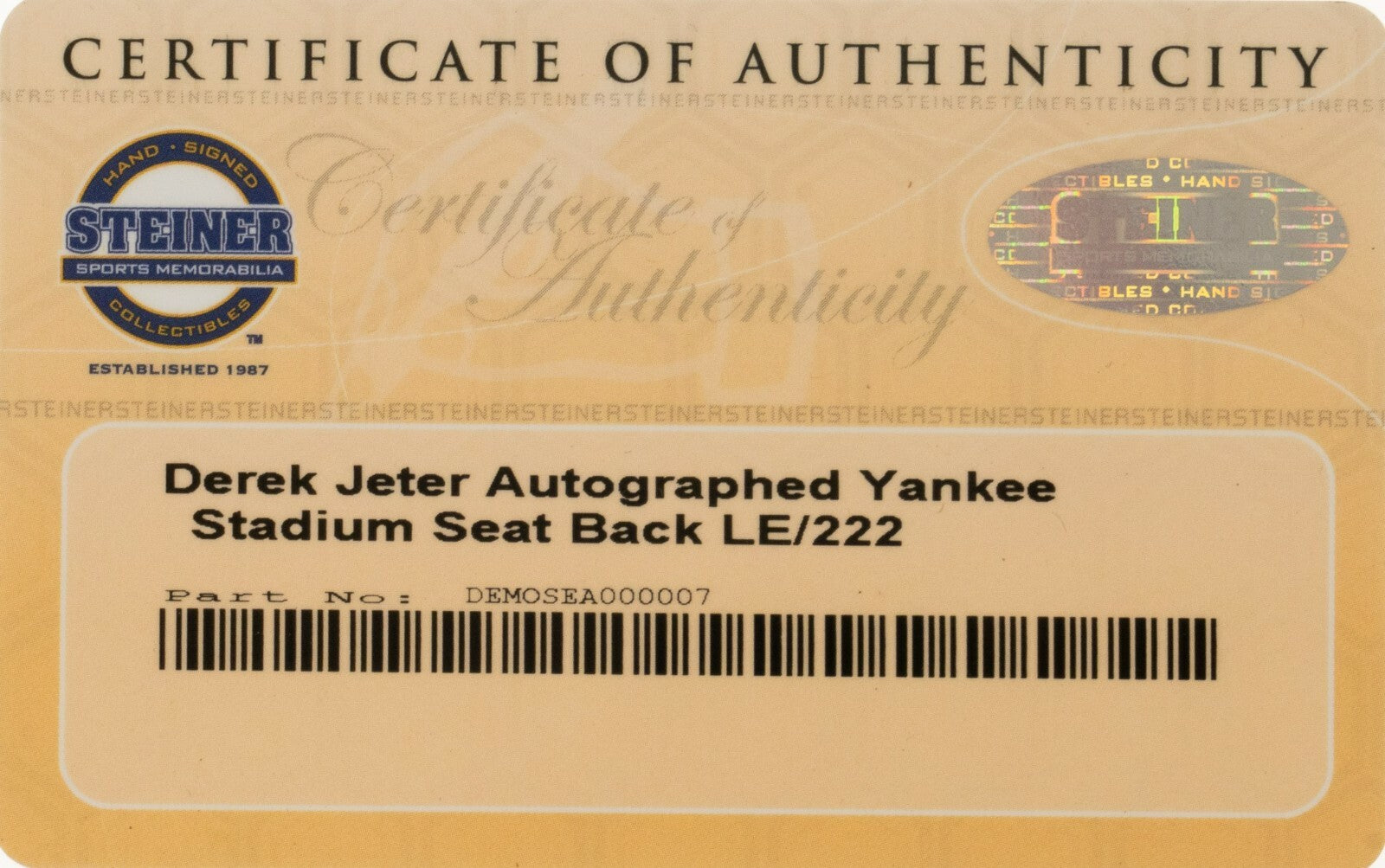 Presented is a Derek Jeter signed Yankees Stadium Game Used seatback. Jeter has signed the seatback in silver Sharpie, with the signature grading "10." Next to the signature someone has inscribed 136/222. The seatback displays a crack along the top-right edge and moderate wear; Very Good condition overall. Full LOA from Steve Grad and Brian Sobrero/Beckett Authentication Services. Also accompanied by a COA and LOA from Steiner.