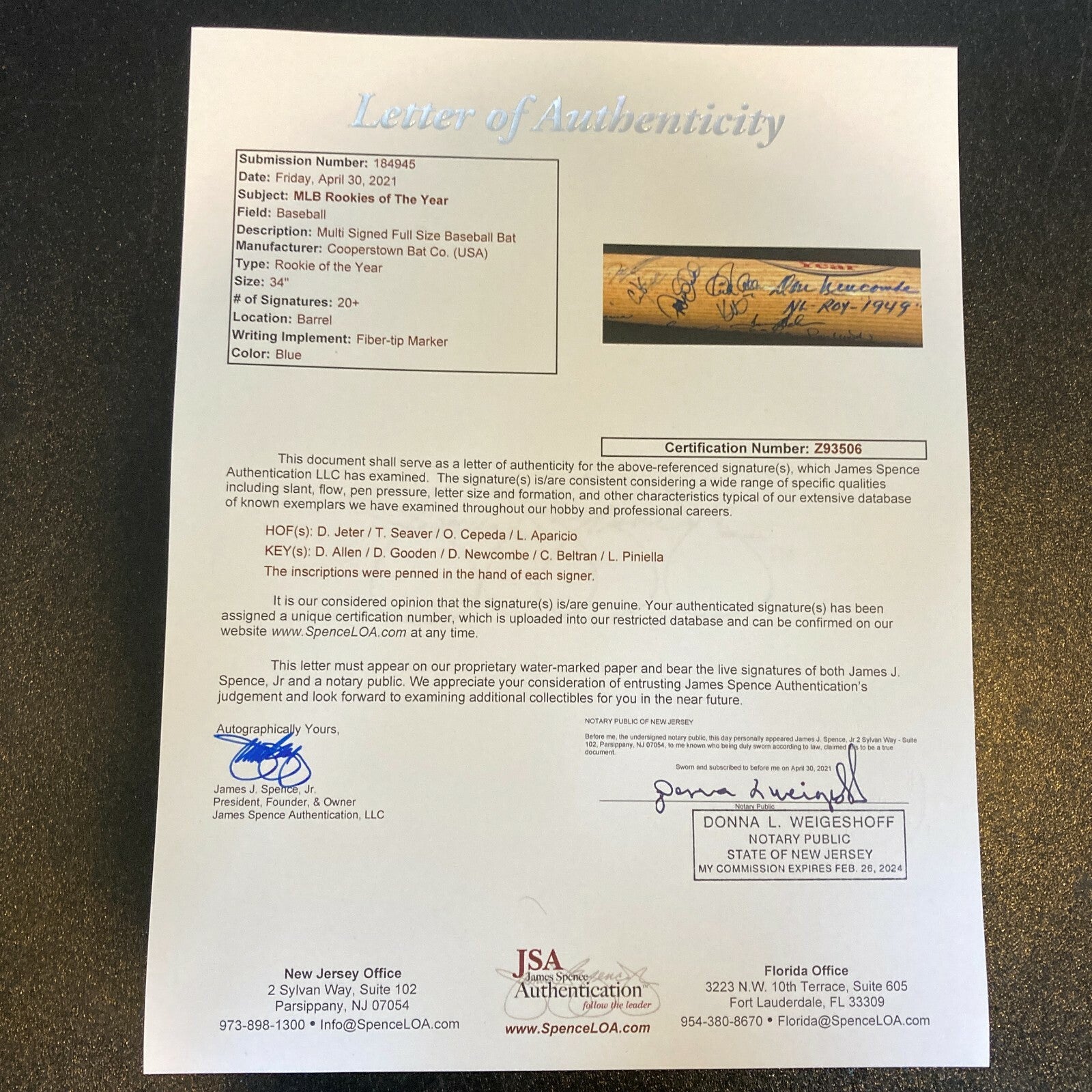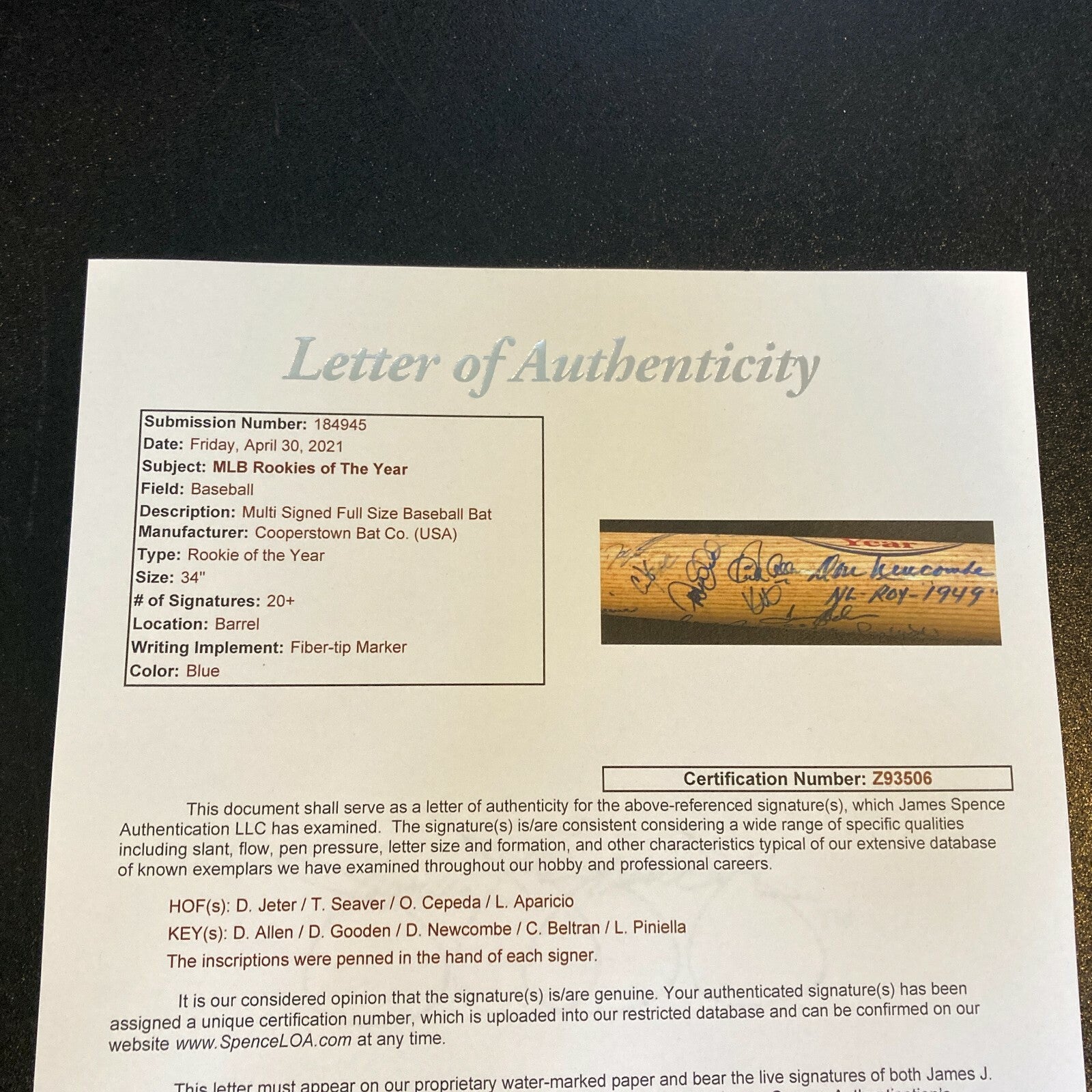 Cooperstown Bat Co. bat with "AL NL Rookie of the Year" logo engraved on the barrel end has been signed by (20) incl. Derek Jeter, Don Newcombe, Dick Allen, Doc Gooden, Tom Seaver, Orlando Cepeda, Al Dark, Carlos Beltran, Bill Virdon, and many others.
