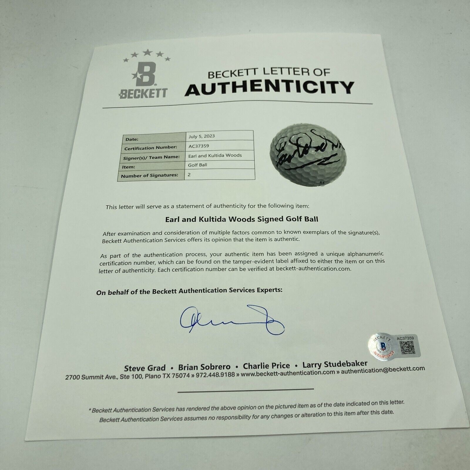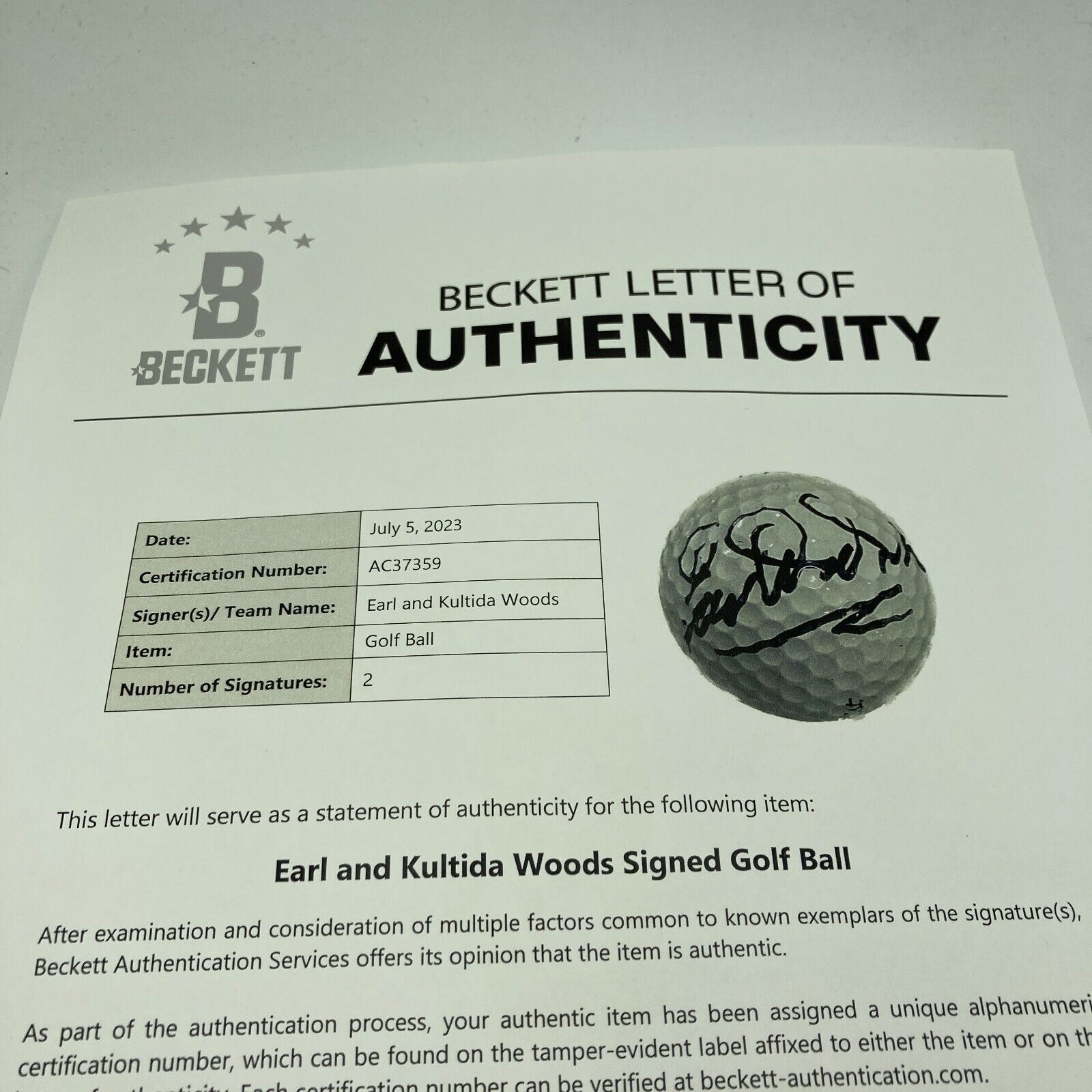 Earl & Kultida Woods Signed Golf Ball Tiger Woods Parents Beckett COA