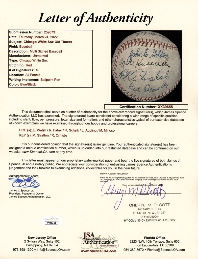 The Chicago White Sox is one of the most stories franchises in Majors League Baseball history, some good, some great, some bad and we all know about the REALLY bad. But through the good and the bad, the White Sox have managed to win six American League pennants and three World Series titles. Offered is a Chicago White Sox veterans team ball, likely signed at an Old Timers Game or special event at Comiskey Park. Signatures include: Joe Kuhel, Joe Benz, Chico Carrasquel, Luke Appling (HOF), Monte Stratton, Red Faber HOF), Orestes Minoso (HOF), Mike Kreevich, Ed Walsh (HOF), Red Omsby (umpire), Lou Fiene, Ray Schalk (HOF), Ted Lyons (HOF) John E. Golden, umpire Red Ormsby and two unidentifiable signatures. The "CHICAGO WHITE SOX" ball remains in fairly good condition with little toning or soiling save for a spot here or there. Mostly handling and viewing wear. Many of these players took the team to those victories and titles! So, own a piece of White Sox history! JSA LOA included.
