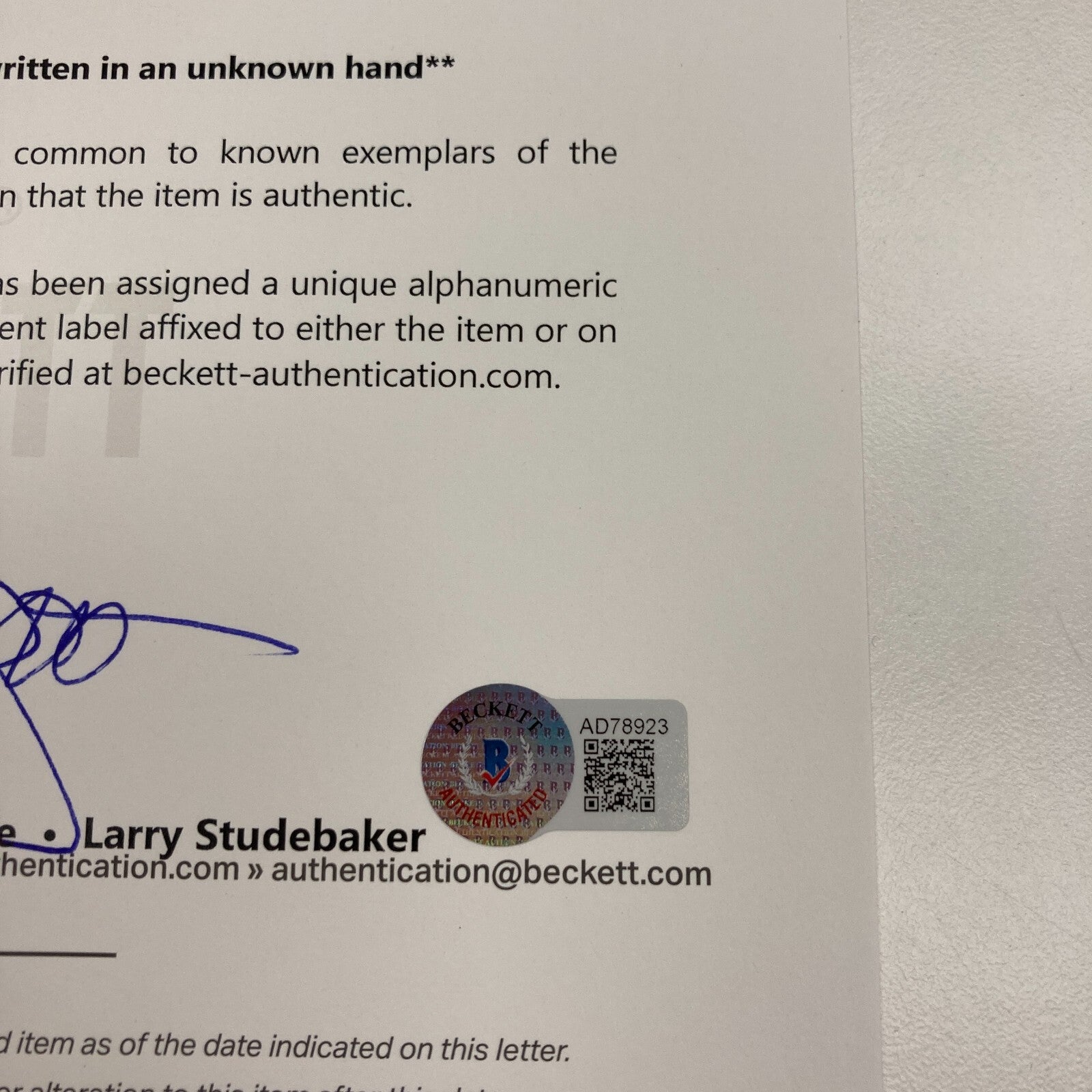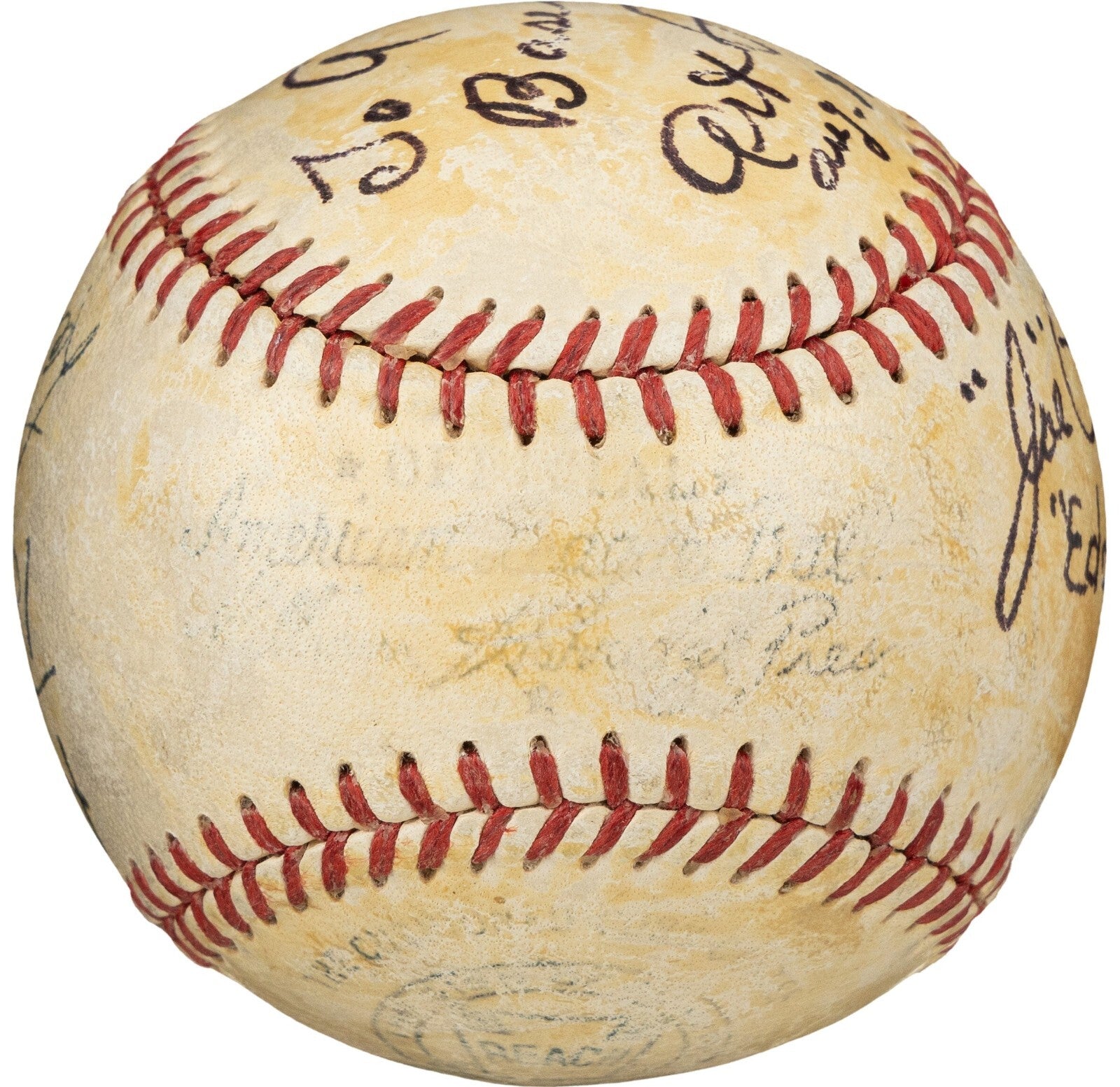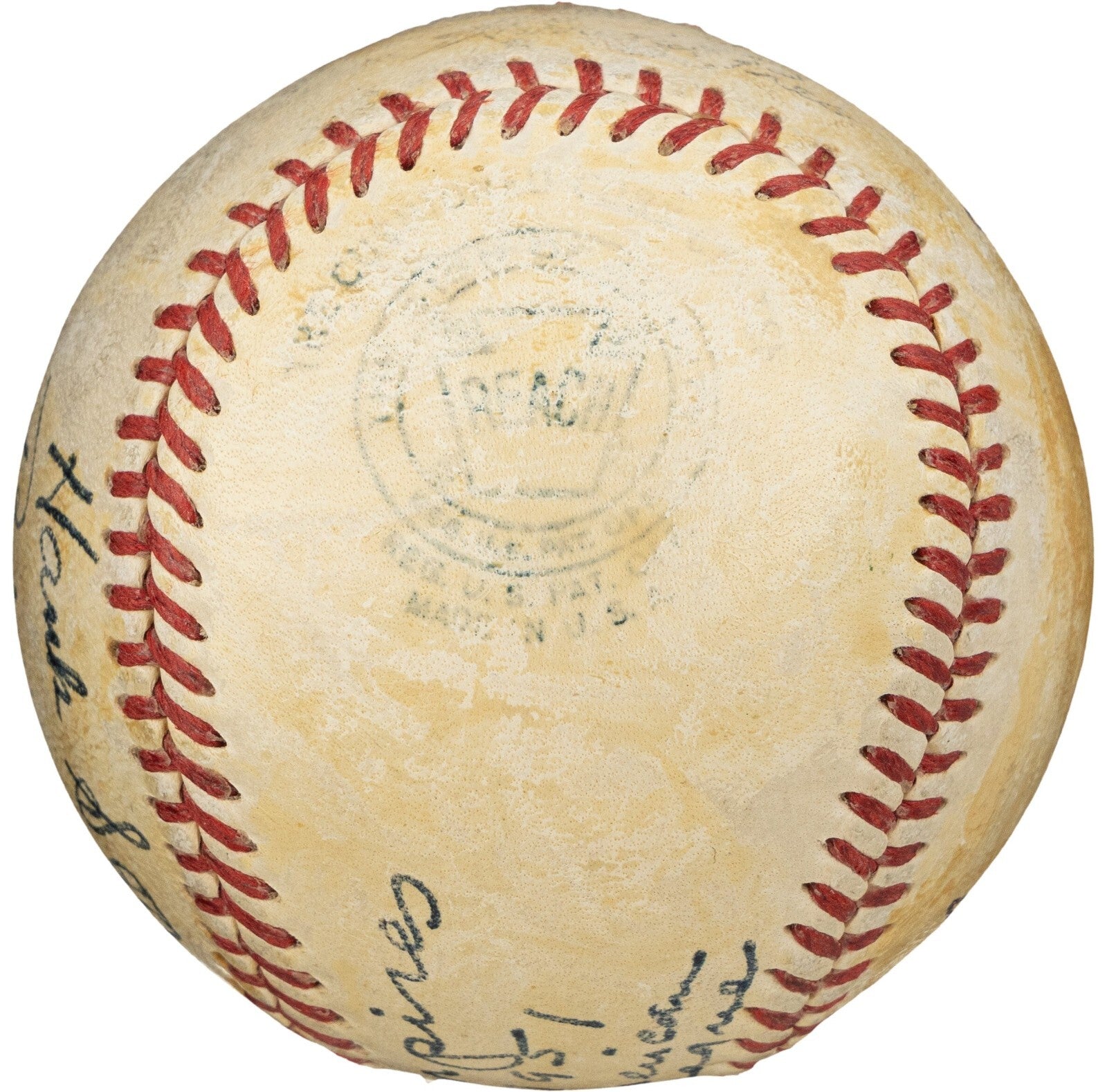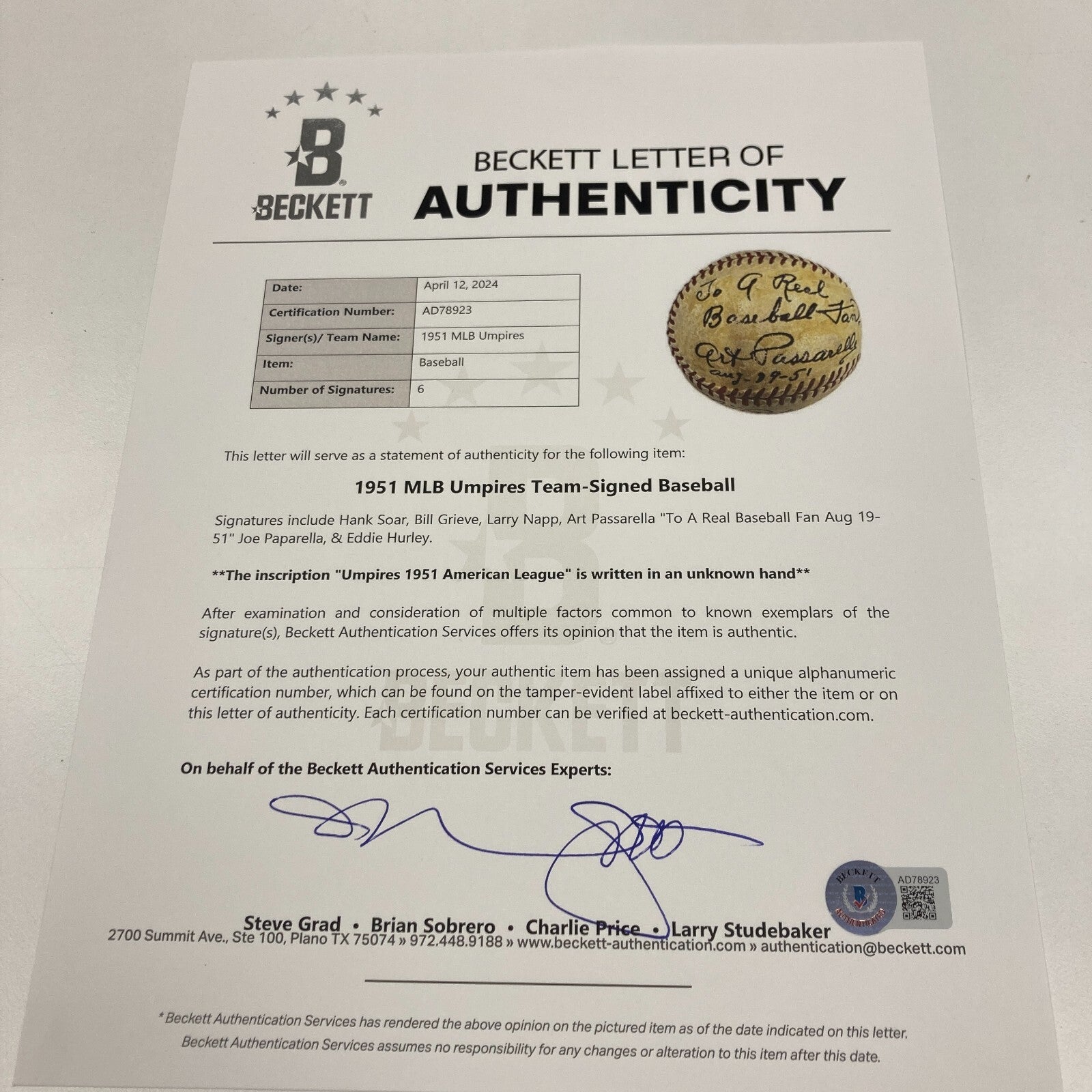 Official American League (Harridge) in bold black ink. Signed by the Umpires who officiated on that famous day. Autographs include: Joe Paparella, Eddie Hurley, Art Passarella (inscribed "To A Real Baseball Fan Aug 19-51"), Hank Soar, Bill Grieve and Larry Napp. Hurley gained prominence as being behind the plate for Eddie Gaedel's infamous at-bat in the 1951 season. Full LOA from Beckett Authentication Services.