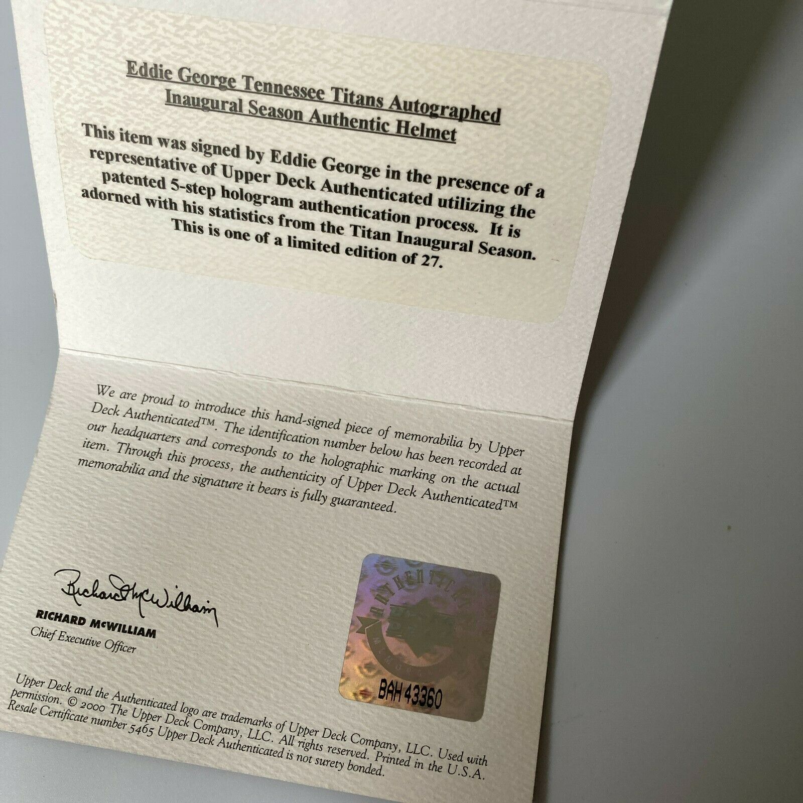Former NFL running back Eddie George has signed this game model Tennessee Titans helmet. George played nine seasons in the National Football League for the Houston Oilers and the Tennessee Titans. He played college football for Ohio State University and won the Heisman Trophy in 1995. He was drafted in the first round of the 1996 NFL Draft and played for the Titans (both in Tennessee and in Houston when the franchise was known as the Houston Oilers). His career totals include 10,441 rushing yards, 268 receptions, 2,227 receiving yards, and 78 touchdowns (68 rushing and 10 receiving). The limited-edition number 26 of 27 Riddell game model authentic helmet features a navy metal facemask. Tennessee Titans logos are located on both sides of the helmet. Two blue stripes run the length of the center of the helmet. An NFL Equipment shield sticker and a “WARNING” sticker are located on the back of this size “L 7-7 1/2” helmet. A Riddell neck guard is located on the back of the helmet. The inside of the helmet features two “WARNING” label stickers. A Riddell “R” logo in black appears on the right side. “1999 INAUGURAL SEASON” and “13 TD’S” appear in blue on the right side of the helmet. George signed and inscribed the number “27” with a blue marker on the right side of the helmet. The helmet comes with a COA from Upper Deck Authenticated (BAH43360) for the signature.