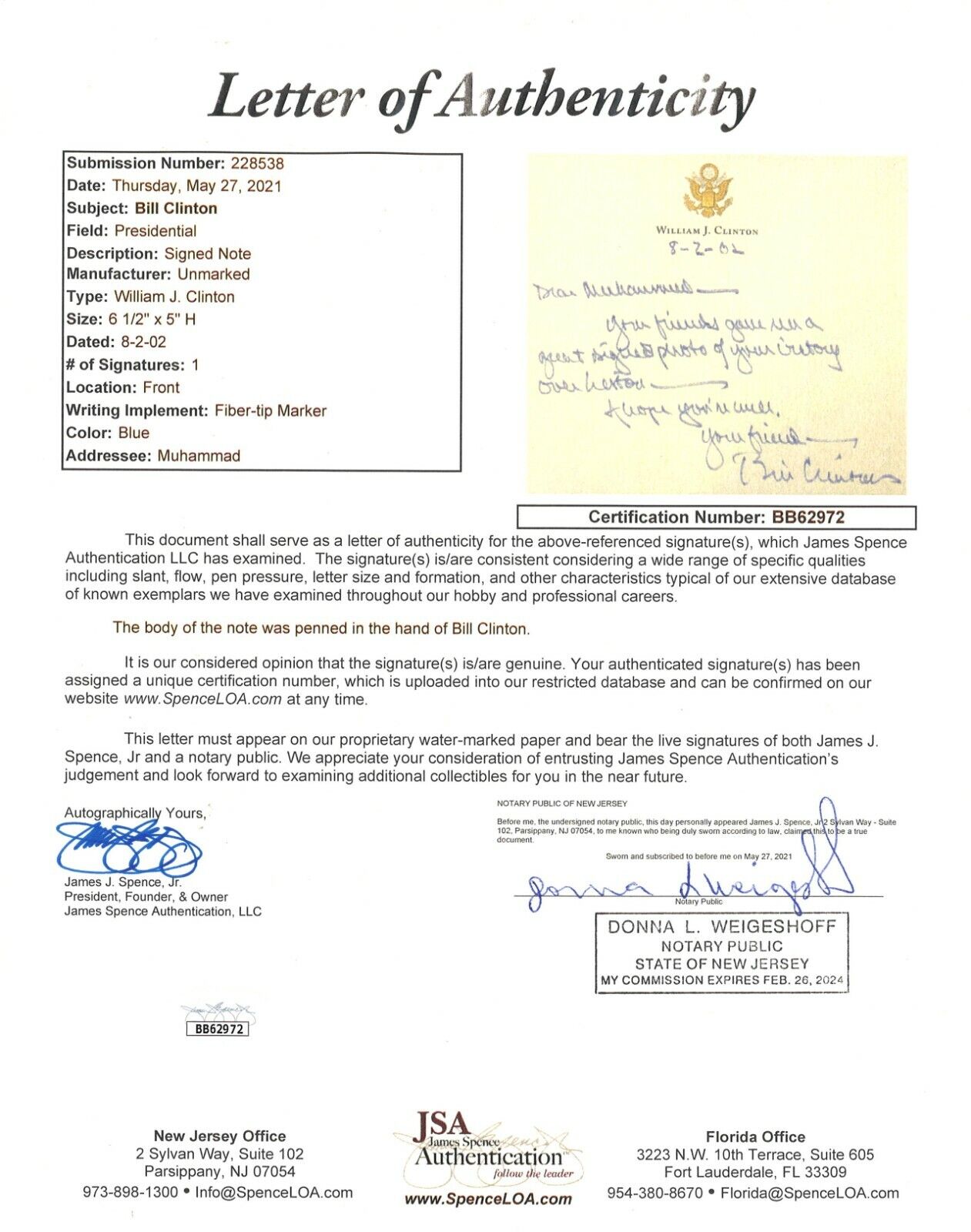This letter to the great Muhammad Ali was handwritten and signed by the 42nd President of the United States, Bill Clinton. Clinton wrote this letter on August 2nd, 2002, as seen on the top of the letter (8-2-02). Bill signed this letter and wrote, "Dear Muhammad, Your Friends gave me a great signed photo of your victory over Liston I hope you're well, your friend- Bill Clinton". Ali and Clinton maintained a close friendship over the years until Ali's passing in 2016. This letter comes with a JSA letter of authenticity.