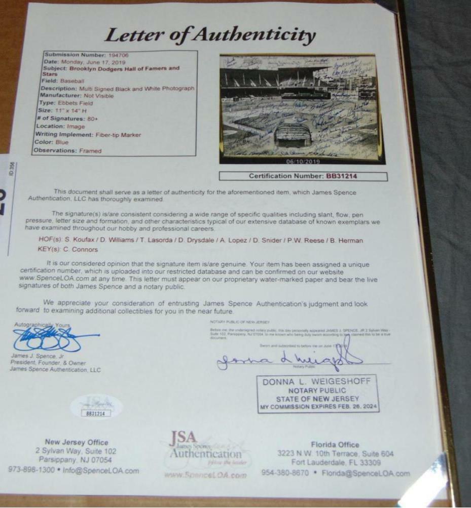 Extraordinary Brooklyn Dodgers Legends Signed Ebbets Field 11x14 Photo. Over 80 signatures with Sandy Koufax, Don Drysdale, Tommy Lasorda, Dick WIlliams, Al Lopez, Duke Snider, Pee Wee Reese, Billy Herman, Chuck Connors and MANY others. Full letter JSA COA.