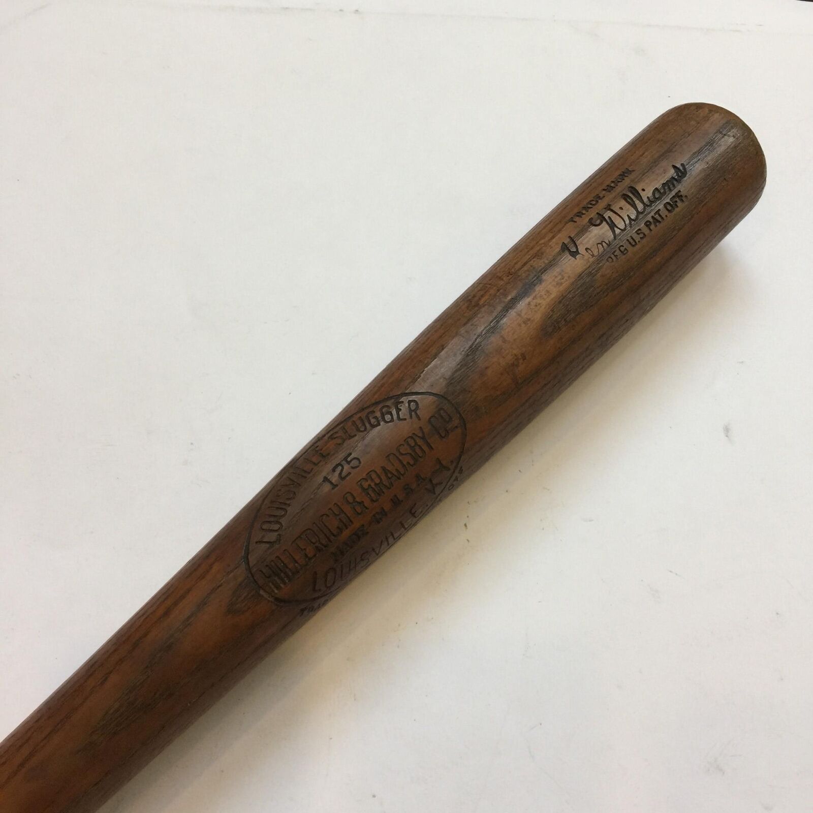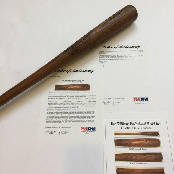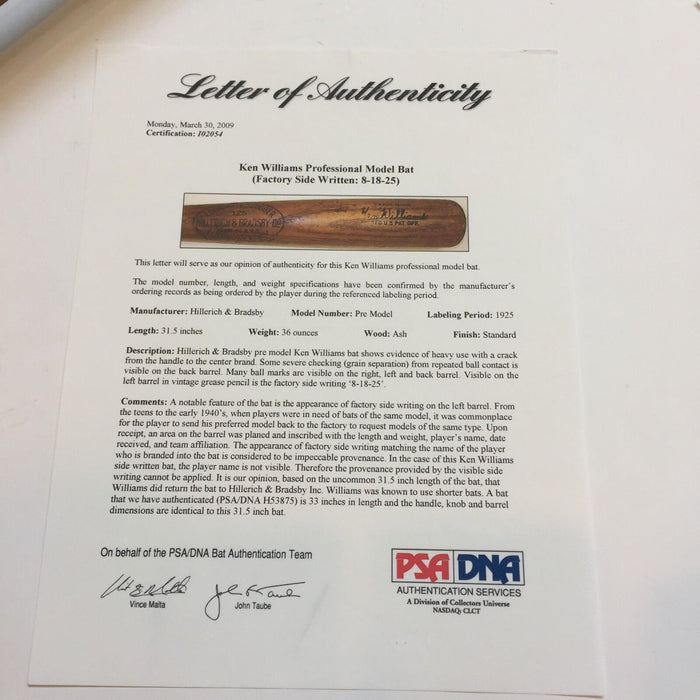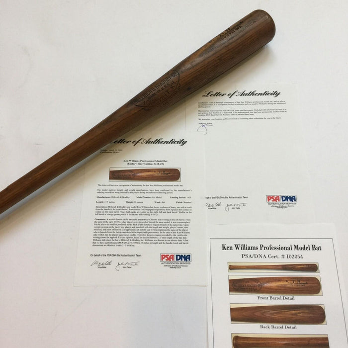 During a fourteen-year stretch from 1918 to 1931, Babe Ruth was almost exclusively without peer in regard to home runs. Capturing 12 of the 14 round-tripper titles (almost always by sizable margins) during that span, Ruth failed to pace the circuit only in 1922 and 1925. The offered Hillerich & Bradsby bat was employed during that latter season by Ken Williams, the only man to equal or surpass Ruth twice during that legendary longball run. The outright league leader in 1922, Williams was aided in his achievement as Ruth was suspended nearly two months for barnstorming infractions. In 1925, with the offered white ash weapon in his arsenal, Williams hit 25 circuit clouts to match Ruth's runner-up total. Not the archetypal war club of Ruthian dimensions, this (36oz/31-1/2) example got the job done, nonetheless. The dark brown patina is accented by a well-defined center brand and Williams' facsimile signature. Heavy use is evident in the form of a plethora of ball marks throughout, checking about the hitting surface and a crack of just under 14 inches that extends upwards from the handle. Sporting a Hornsby-style knob, the bat has a grease pencil notation of 8-18-25 on the barrel. Executed by H&B fixture Henry Morrow, this side writing is an indicator that the player wanted additional examples. Williams was known to employ shorter bats and PSA/DNA has authenticated a previous Williams model with knob and barrel dimensions identical to this lumber. Accompanying is an LOA (cert #I02054) from John Taube PSA/DNA.