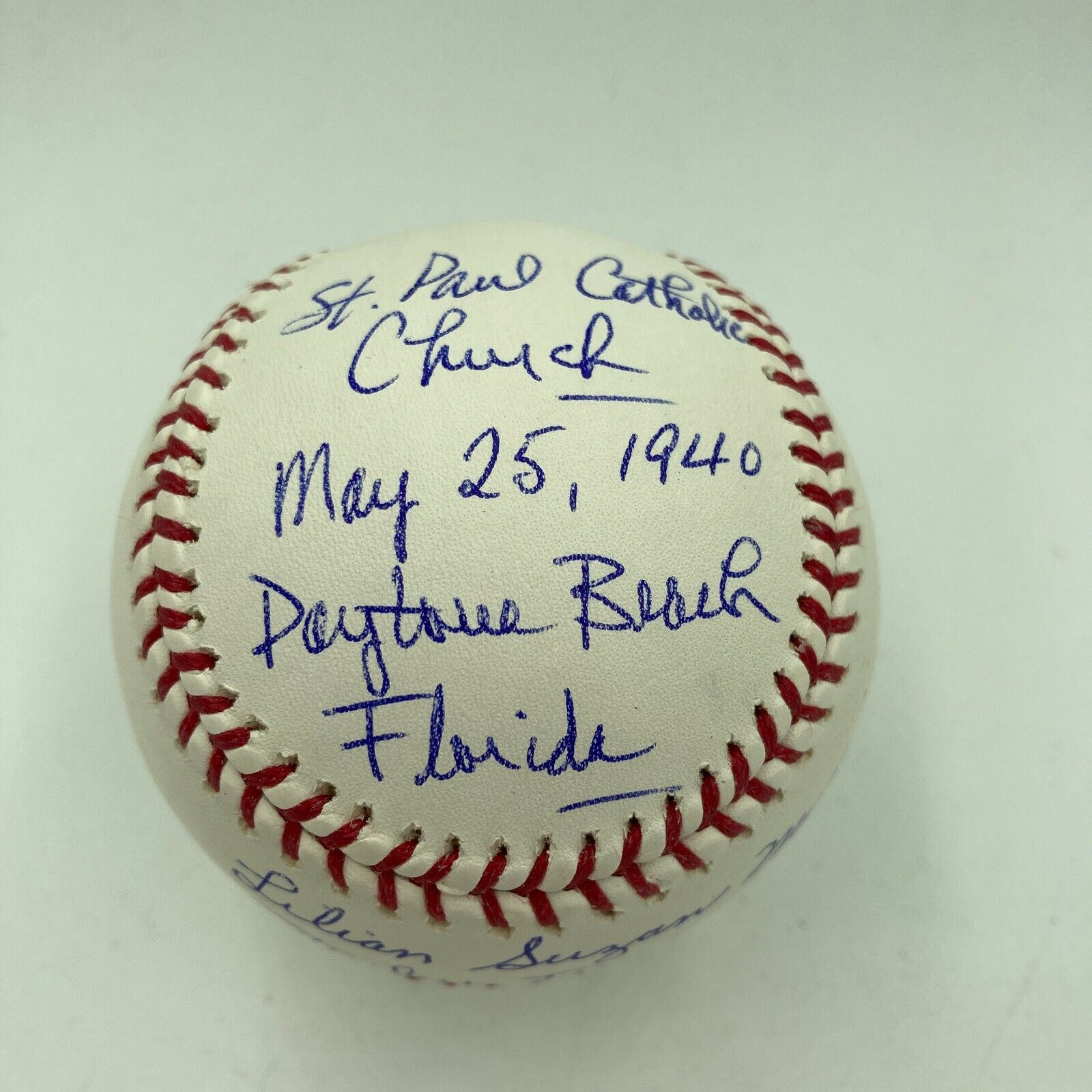 Incredible Stan and Lillian Musial signed heavily inscribed Major League Baseball. Both signed their full names "Stanley Frank Musial" and "Lillian Suzan Musial". Stan inscribed on the ball- "St. Paul Catholic Church May 25, 1940, Daytona Beach Florida". Ball is in mint condition. Comes with PSA DNA COA and Stan Musial.