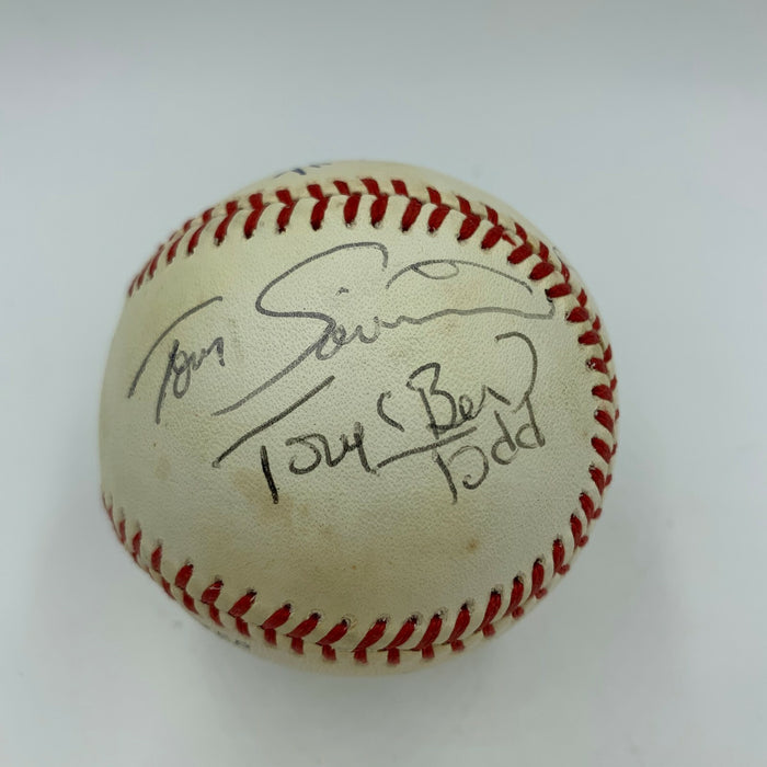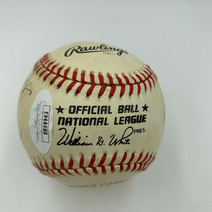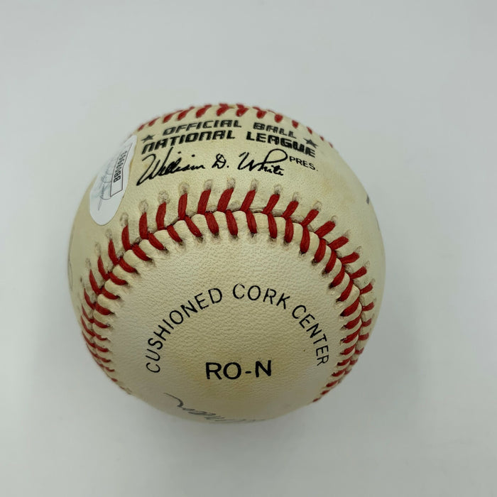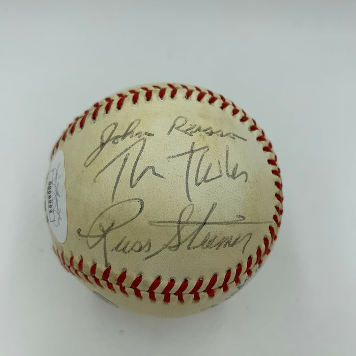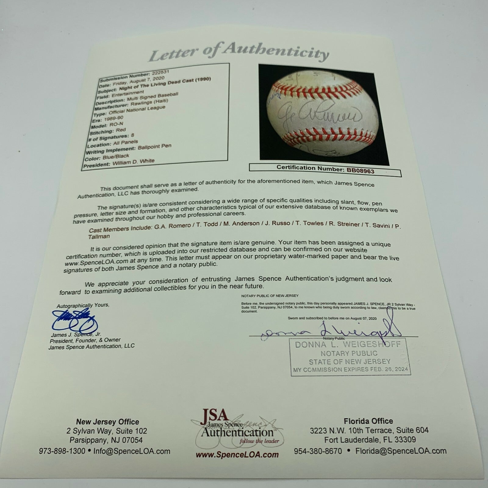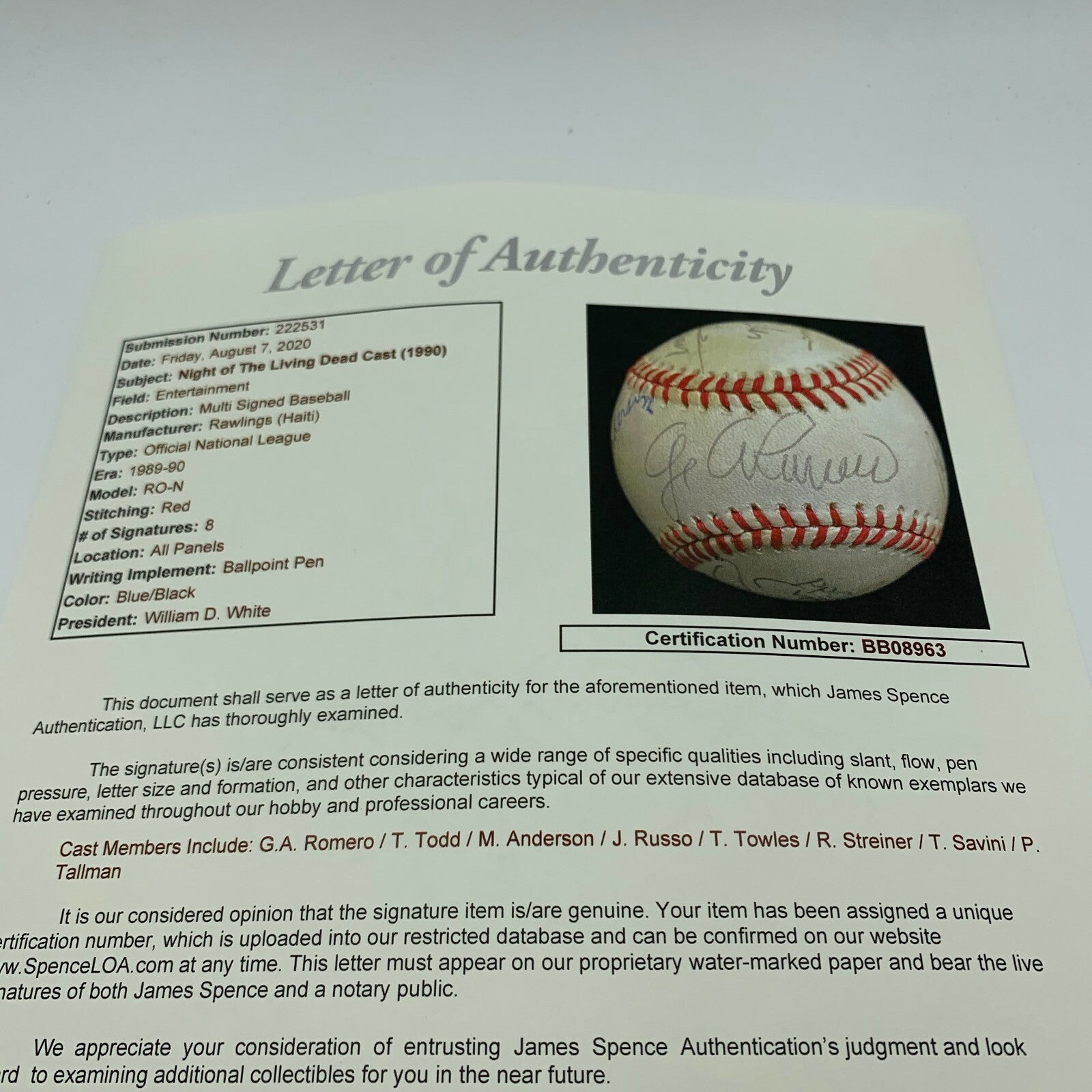 Very rare Night Of The Living Dead Cast Signed Official National League Baseball. Signed by George Romero, T. Todd, M. Anderson, John Russo, T. Towles, Russell Streiner, T. Savini and P. Tallman. Full letter JSA COA.
