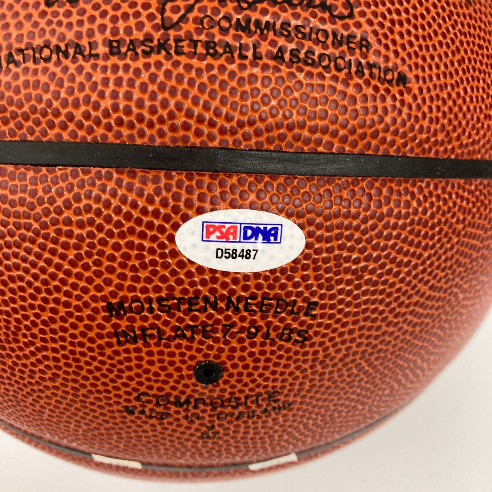 The first true NBA superstar, Hall of Famer George Mikan was a pioneer that helped shape the modern game. Presented is a Spalding NBA basketball, signed by Mikan in black marker with a "HOF /'59" inscription and graded a 9. LOA from PSA/DNA.