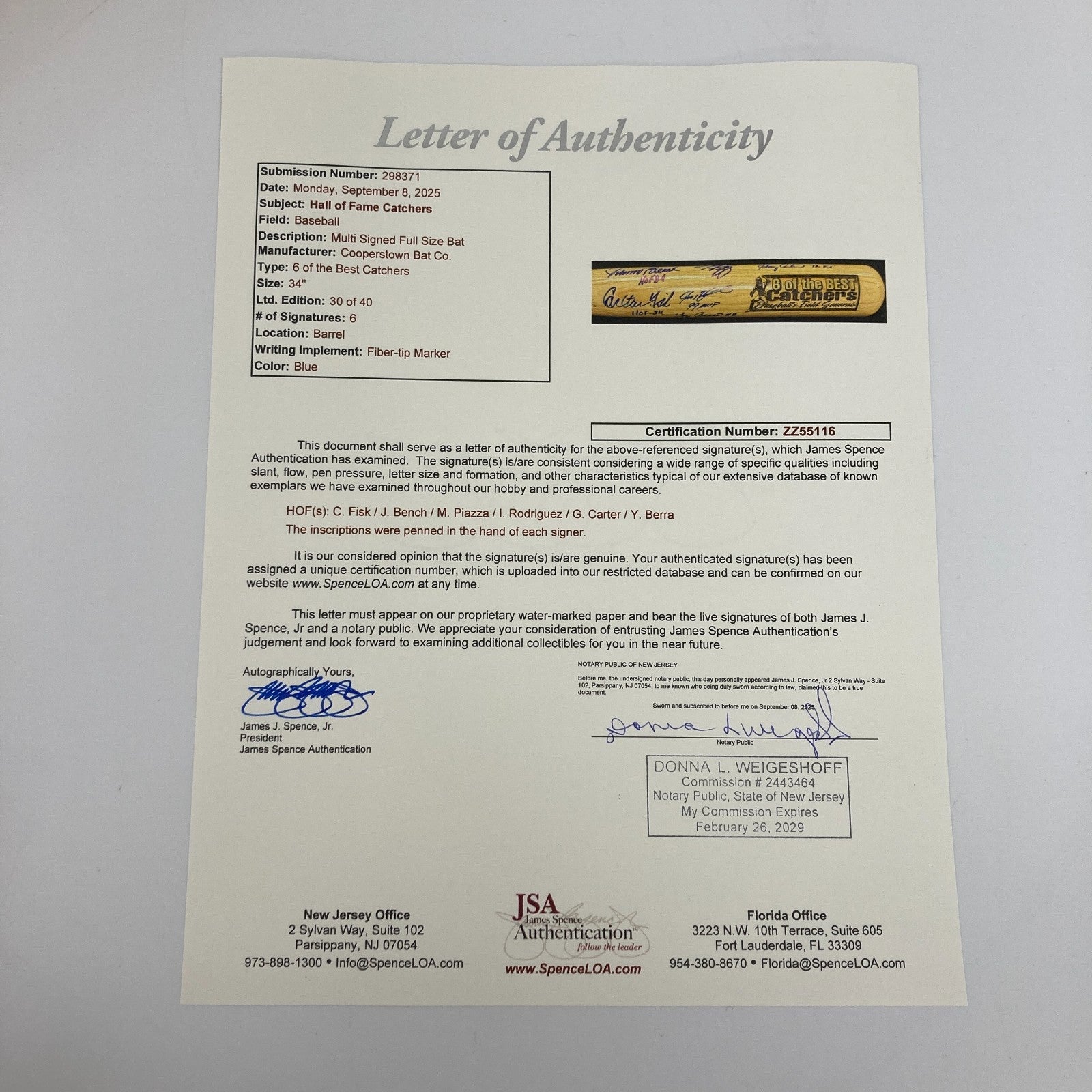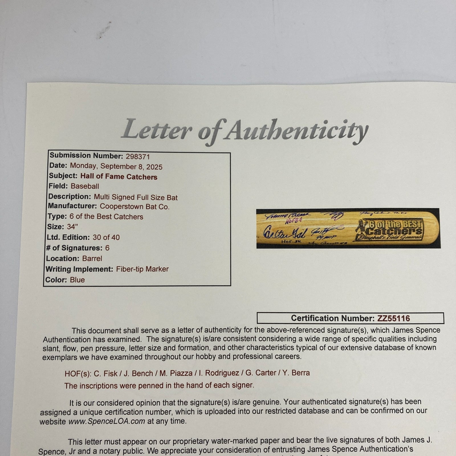 Cooperstown Bat Co. “Six of the Best Catchers - Baseball's Field Generals” commemorative bat, 30 of 40, in Near-Mint condition with beautiful (“9-10”) signatures, all but one with inscriptions. Johnny Bench (HOF 84), Mike Piazza, Gary Carter (“The Kid”), Carlton Fisk (HOF-2K), Ivan Rodriguez (99 MVP), Yogi Berra (#8).
