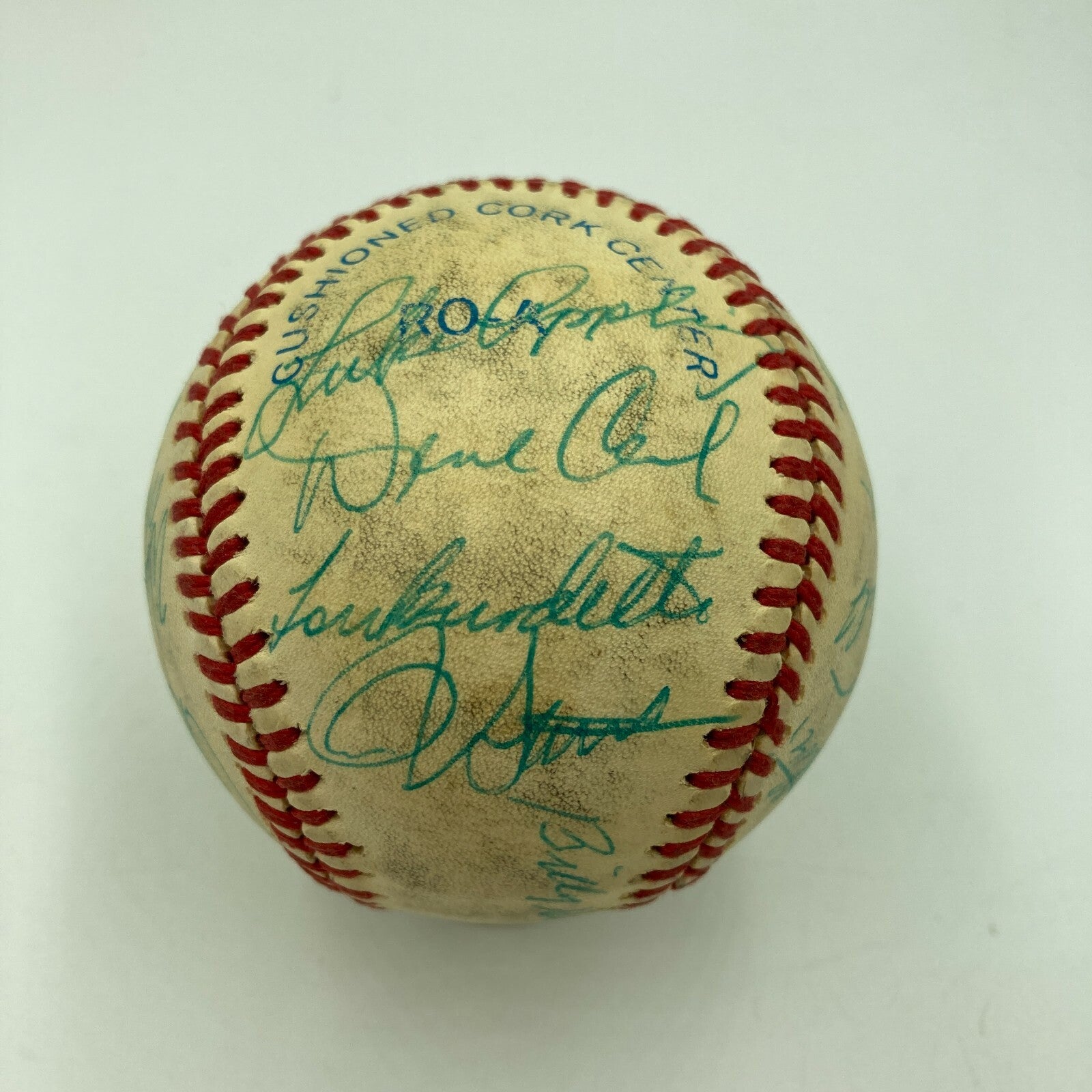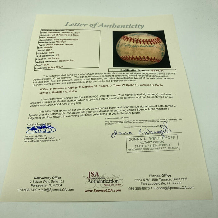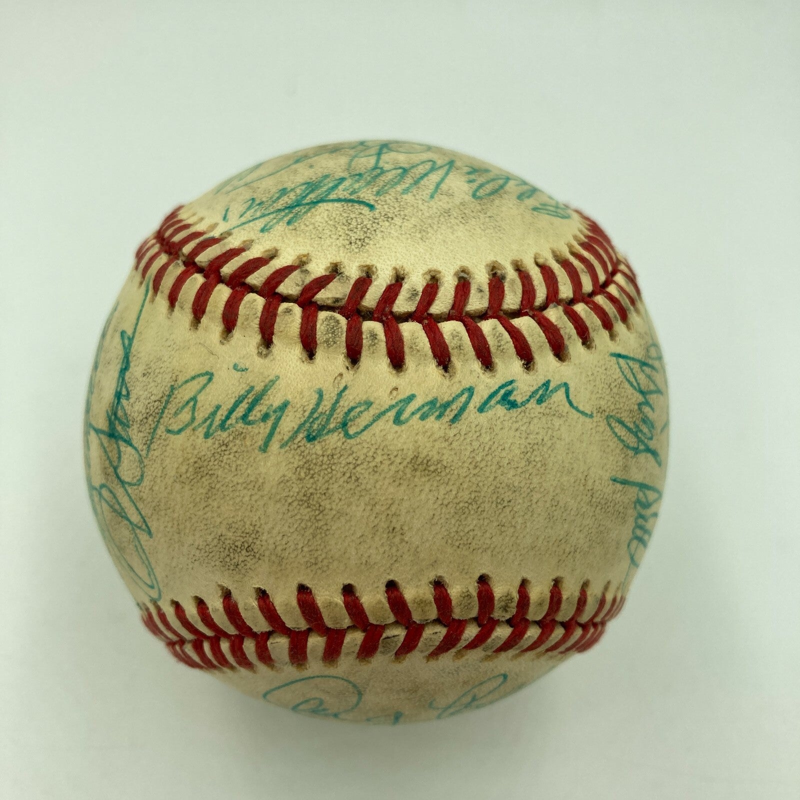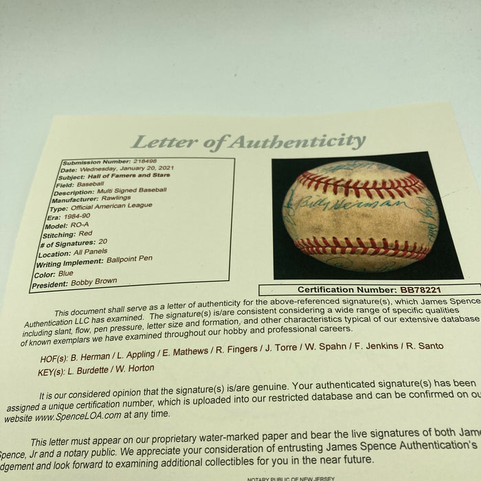 Hall Of Fame Greats Multi Signed Baseball with Eddie Mathews, Warren Spahn, Billy Herman, Luke Appling, Rollie Fingers, Joe Torre, Fergie Jenkins, Ron Santo and others.