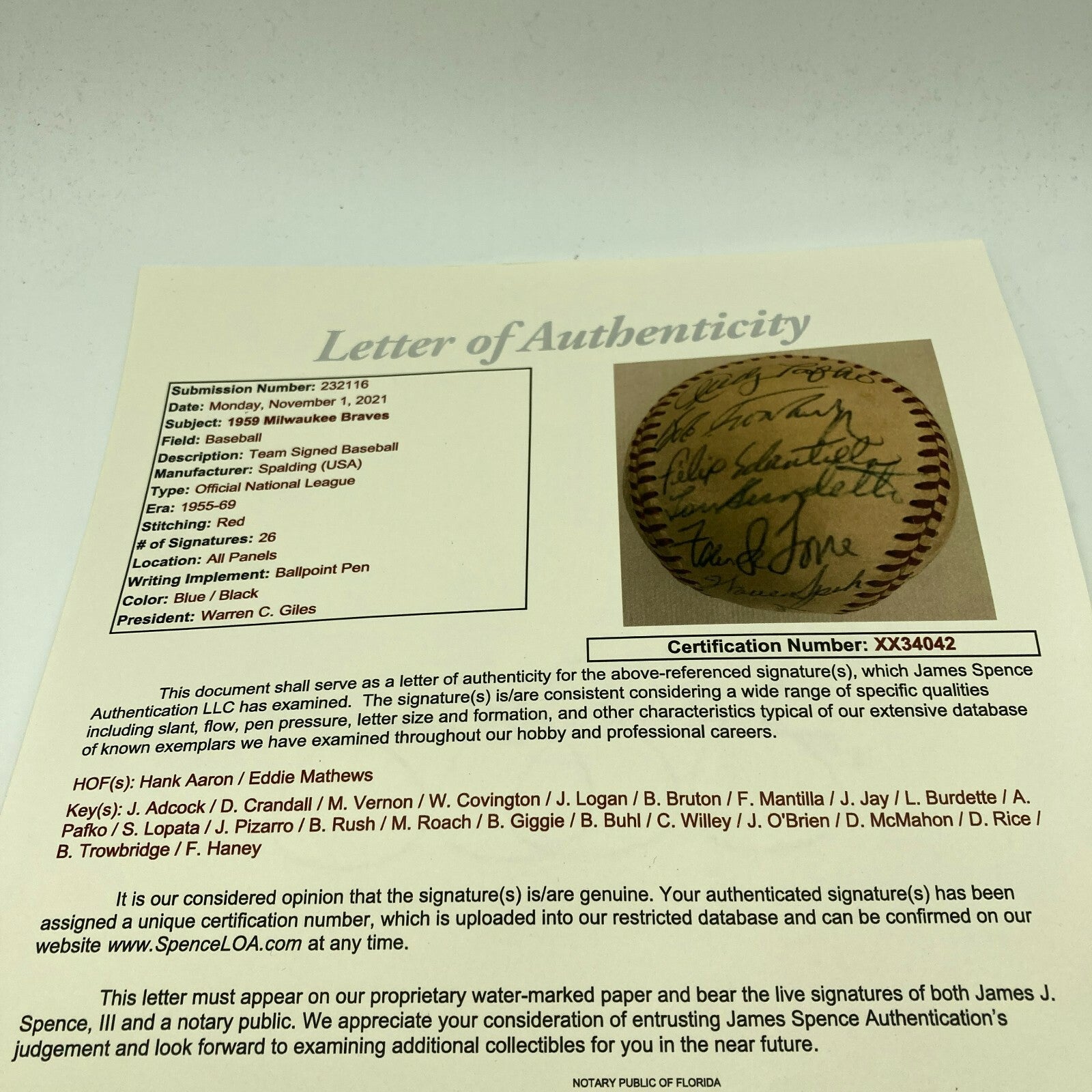 1959 Milwaukee Braves Team Signed National League (Giles) Baseball. 26 signatures with Hank Aaron, Eddie Mathews and the rest of the team.