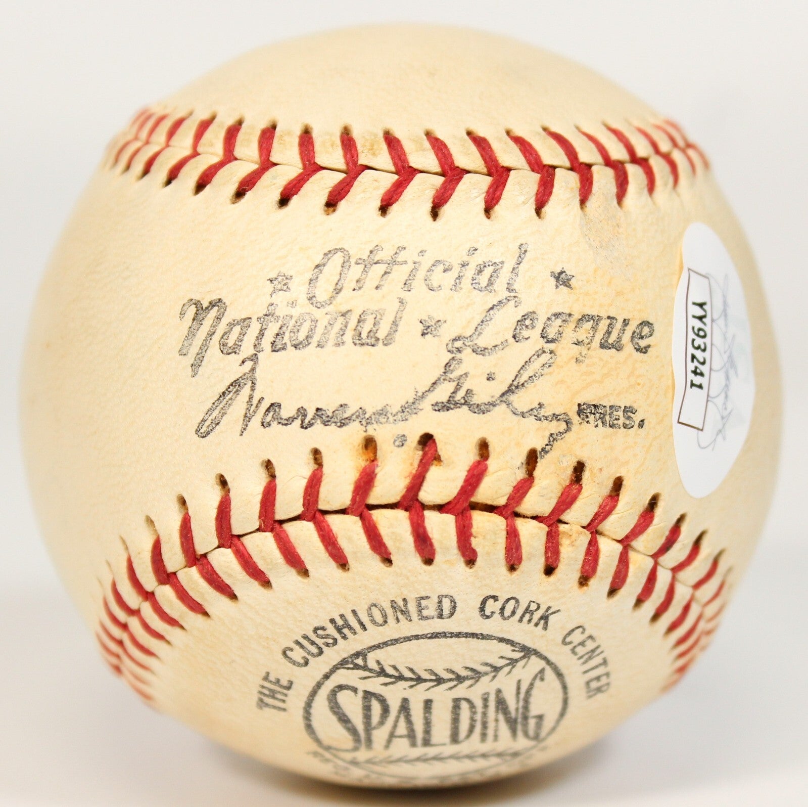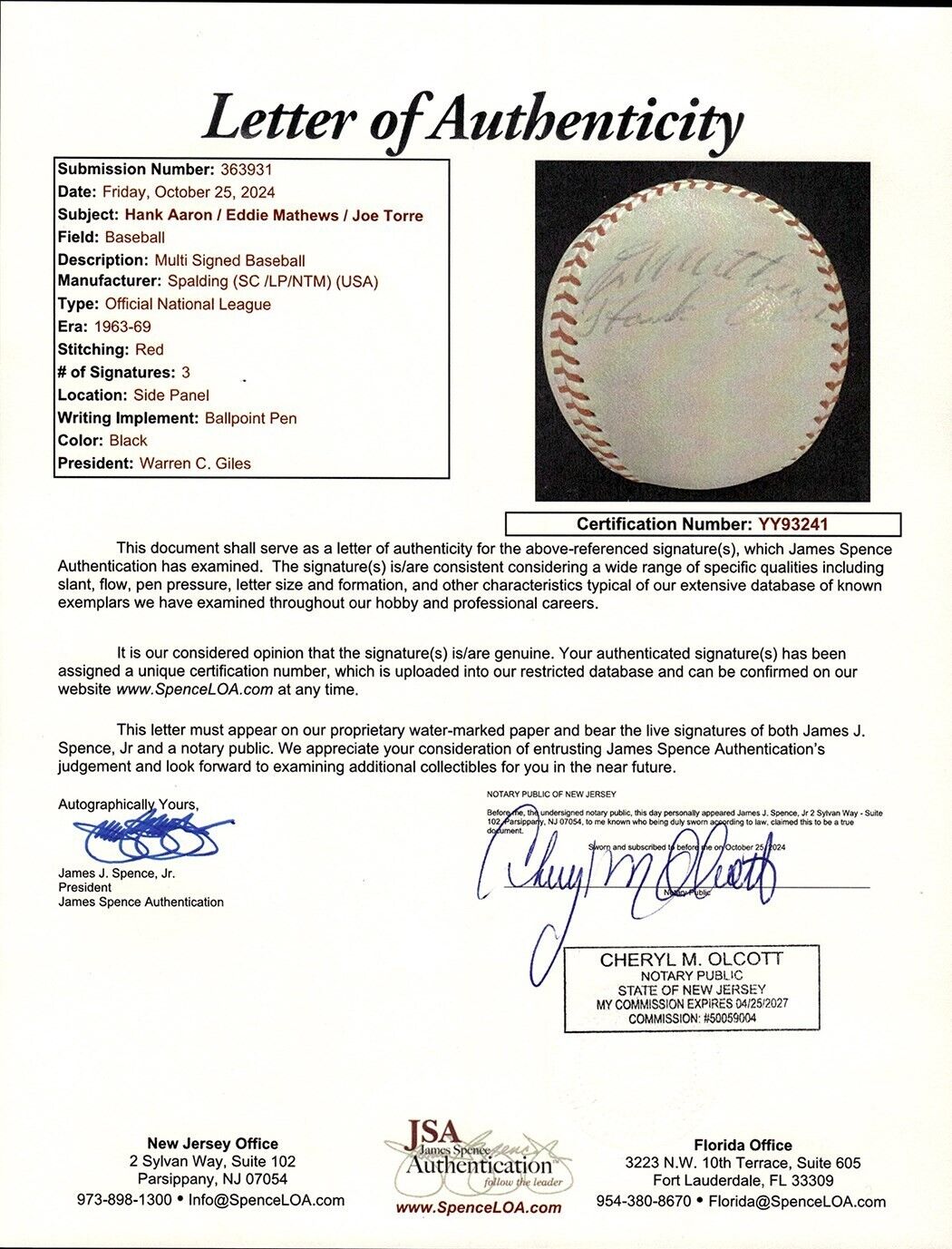 Spalding Official National League (Giles), signed by three members of the Atlanta Braves, all of whom have been inducted into the Hall of Fame. The baseball originates from the collection of Clyde King, who was not with the team when these three players were all together (King was the manager of the 1974 Braves, and worked in their farm system as early as 1971). The three signatures on the baseball, Hank Aaron, Eddie Mathews and Joe Torre, were together on the team as late as 1968, roughly the period during which this baseball was manufactured. Full LOA from James Spence Authentication.