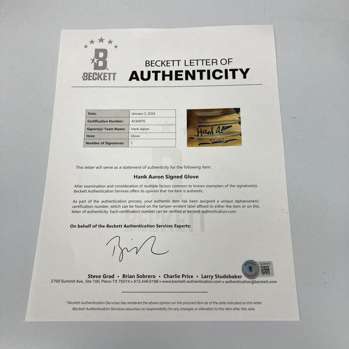 Hank Aaron is one of baseball's greatest and most beloved figures; the former home run king who made a staggering 25 MLB All-Star teams and clubbed 755 home runs. Over his 23-season career, Aaron earned universal respect as a five-tool superstar. He remains baseball's all-time leader in RBI (2,297) and total bases (6,856), towering as a near-mythical figure still omnipresent in Major League Baseball. Aaron was elected to the National Baseball Hall of Fame in 1982, appearing on 406 of a possible 415 ballots. Sadly, the baseball legend passed away in January 2021. The piece comes with an LOA from Beckett Authentication for the signature.