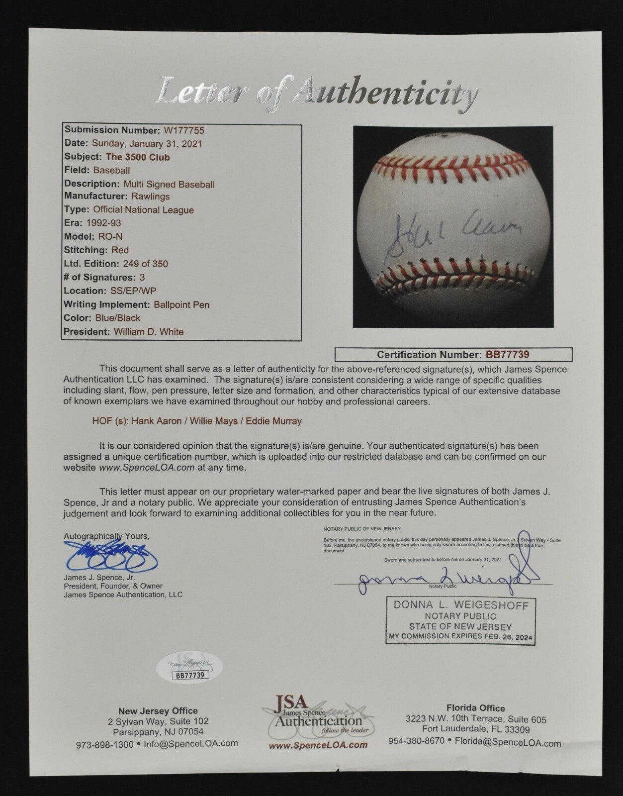 Willie Mays, Hank Aaron and Eddie Murray autographed limited edition 3,500 Club ONL William White baseball (3,000 Hits AND 500 HR's). Limited edition #249/350. Full letter JSA COA.