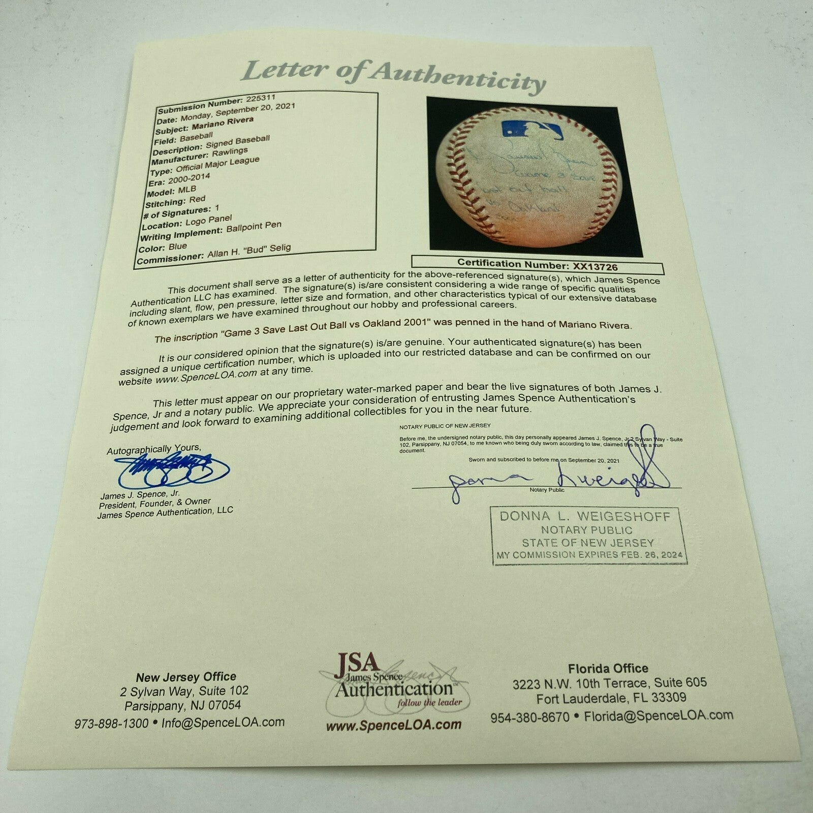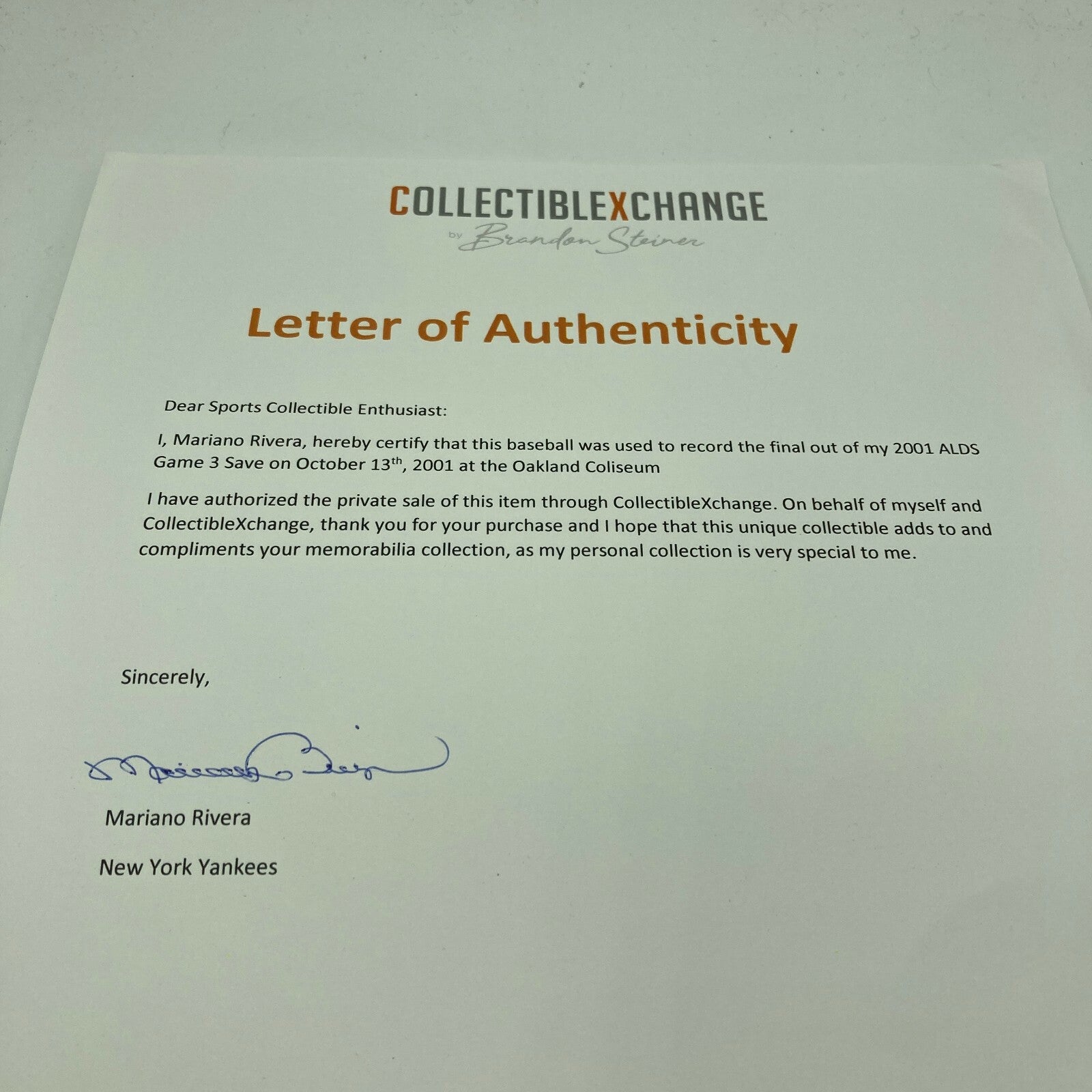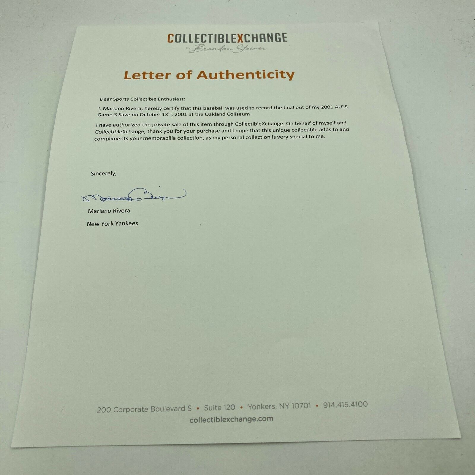 This game used last out ball from Mariano Rivera's 2001 ALDS Game 3 Save (the Derek Jeter Flip Play Game) vs the Oakland Athletics was given to Brandon Steiner by Mariano Rivera after the 2001 season. Derek Jeter autographed the sweet spot and inscribed "Flip Play October 13, 2001". Rivera autographed the ball as well and inscribed "Game 3 save last out ball vs Oakland 2001". Rivera used this ball to retire Athletics DH Jeremy Giambi (groundout to 2nd) to win Game 3 of the American League Division Series, earning him another postseason save. This was the first of three consecutive New York Yankees victories after facing elimination down 2-0 in the series. Game 3 will forever be remembered because of Derek Jeter's iconic "Flip Play" which preserved the Yankees lead and catapulted them to three consecutive wins to advance to the ALCS. This baseball comes with a signed Mariano Rivera letter of authenticity. This game used baseball is one of a kind and you will not find it anywhere else. Possibly the finest Derek Jeter game used baseball in existence!