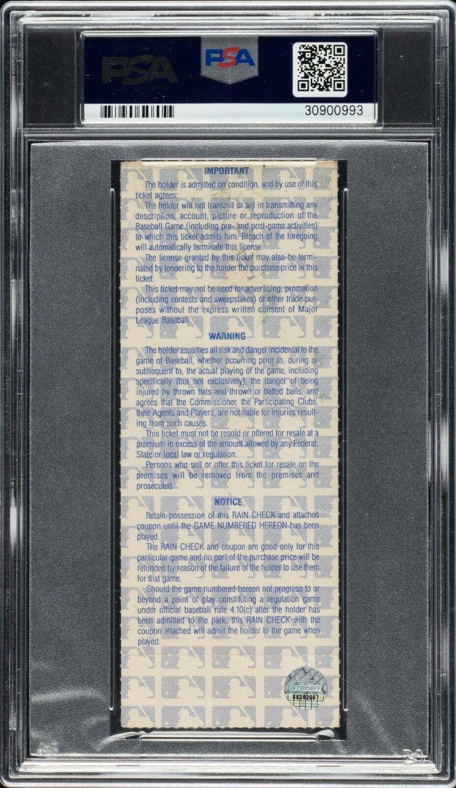 Original authentic New York Mets ticket stub issued for Game 6 of the 1986 World Series, signed by Mookie Wilson and Bill Buckner. PSA/DNA has encapsulated the ticket stub and certified the signatures as "Authentic." Game 6, won by the Mets 6-5, is best remembered for first baseman Bill Buckner's error in the bottom of the 10th inning on a slow roller by Mookie Wilson that allowed the Mets' winning run to score. The Mets' victory forced a deciding Game 7, which the Mets won 8-5. Bucker and Wilson each signed in blue Sharpie.