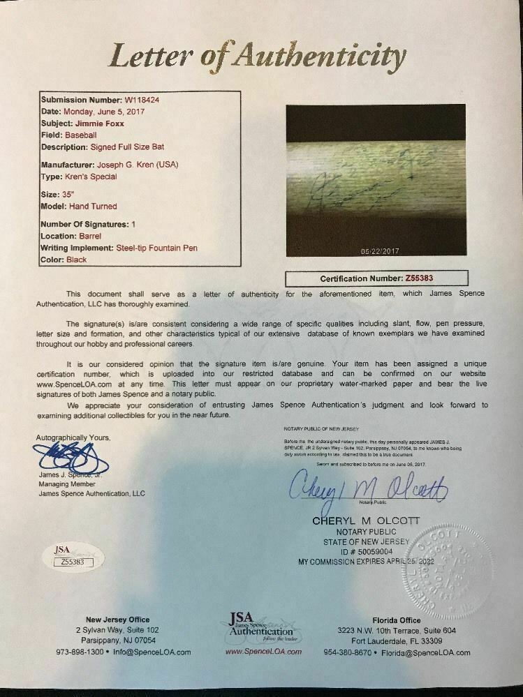 Click or scroll to zoom Tap or pinch to zoom Click or scroll to zoom Tap or pinch to zoom Click or scroll to zoom Tap or pinch to zoom Click or scroll to zoom Tap or pinch to zoom Click or scroll to zoom Tap or pinch to zoom Click or scroll to zoom Tap or pinch to zoom Click or scroll to zoom Tap or pinch to zoom Click or scroll to zoom Tap or pinch to zoom Incredible Jimmie Foxx Single Signed Autographed 1930's Baseball Bat JSA COA $14,995.00 1 2 3 4 5 6 7 8 9 10+ Quantity Quantity Add to cart This item is a recurring or deferred purchase. By continuing, I agree to the cancellation policy and authorize you to charge my payment method at the prices, frequency and dates listed on this page until my order is fulfilled or I cancel, if permitted. Incredible Jimmie Foxx Single Signed Autographed 1930's Baseball Bat. Possibly the only single signed Foxx bat in the hobby. Comes with full letter JSA COA.