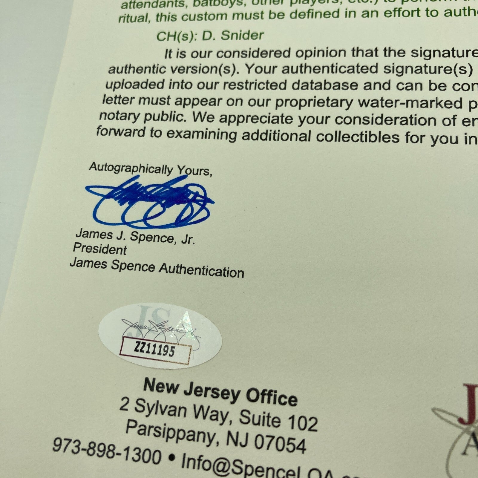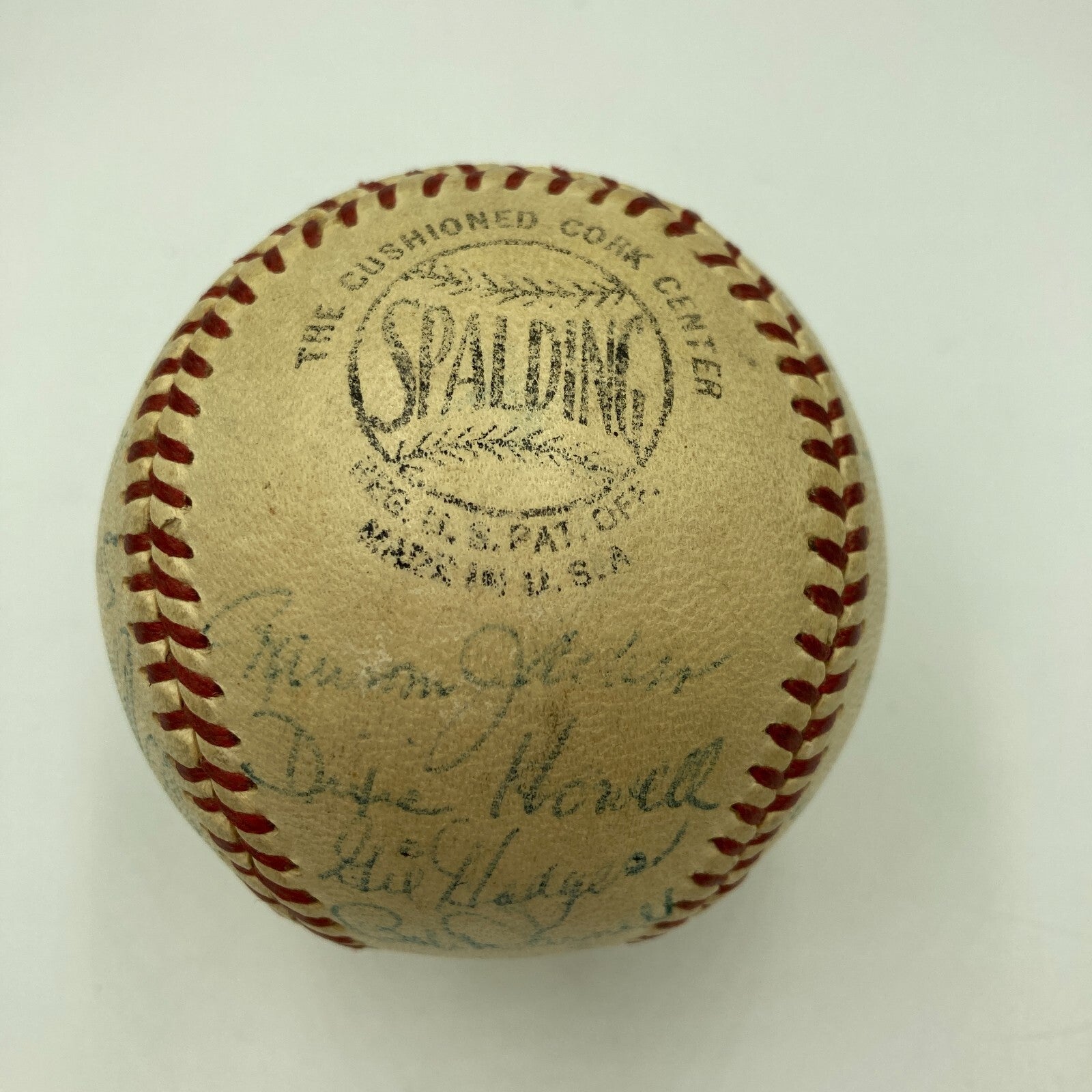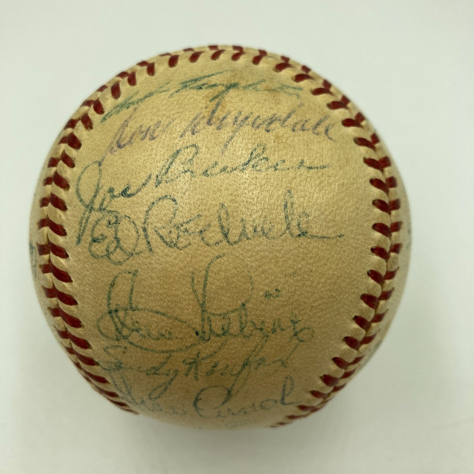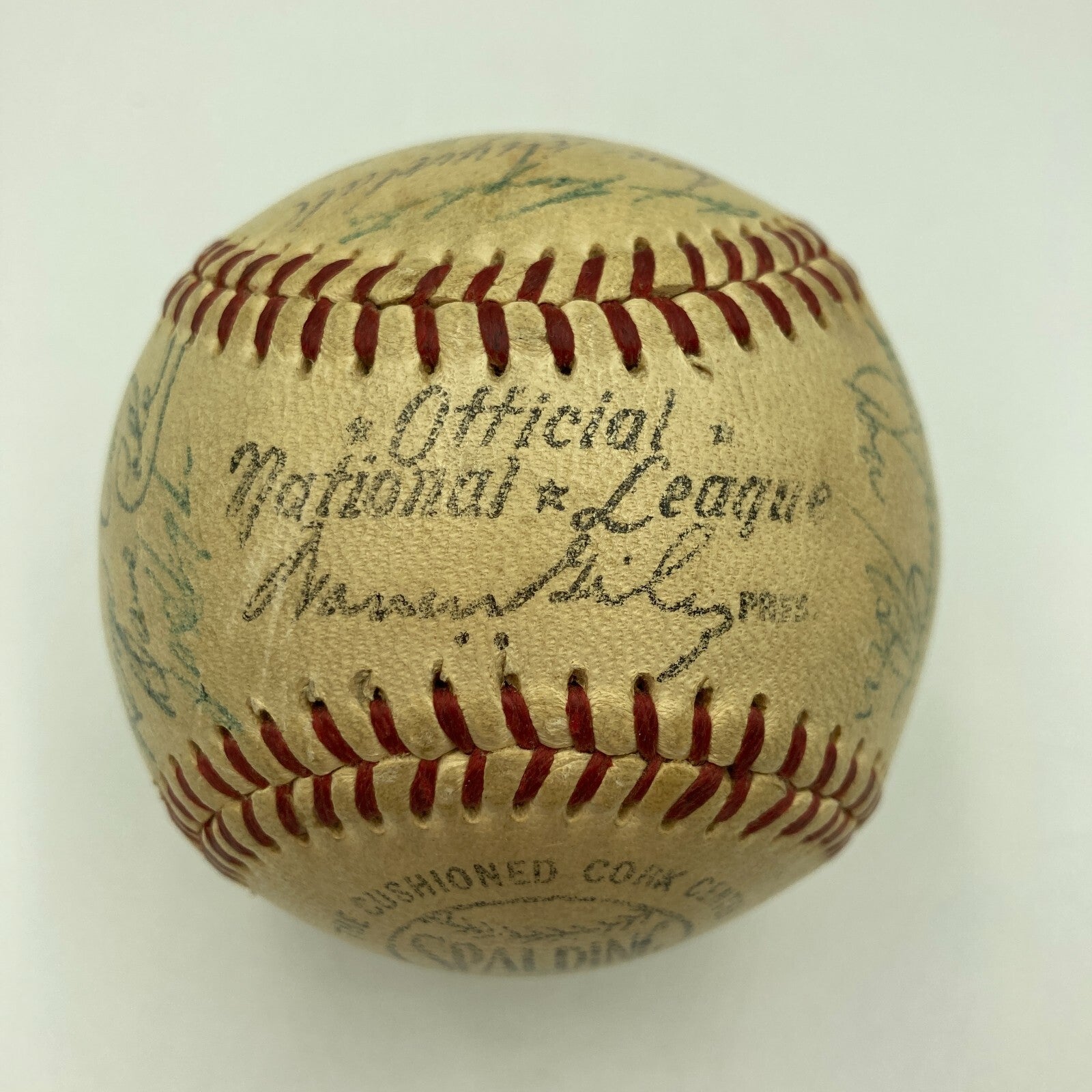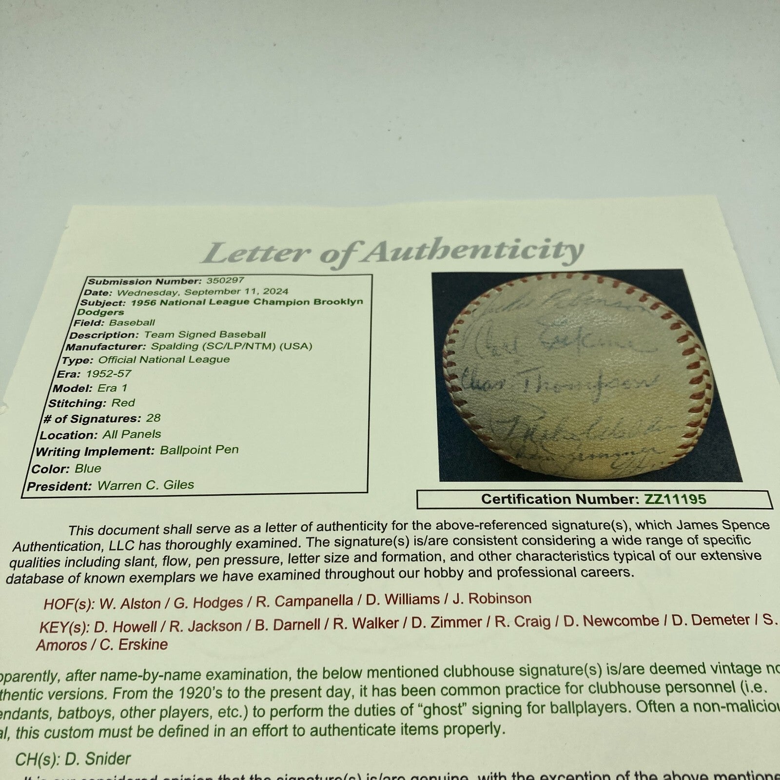 This offered Official National League Warren Giles baseball is signed by 28 members of the '56 squad in blue ink. Key signatures on the ball include those of Hall of Famers Jackie Robinson, Roy Campanella, Gil Hodges, and Dick Williams, with additional signatures from Dixie Howell, Randy Jackson, Bob Darnell, Rube Walker, Don Zimmer, Roger Craig, Don Newcombe, Don Demeter, Sandy Amoros, and Carl Erskine. The signature of Duke Snider has been deemed a clubhouse by JSA. Accompanied by an LOA from JSA for the signatures.