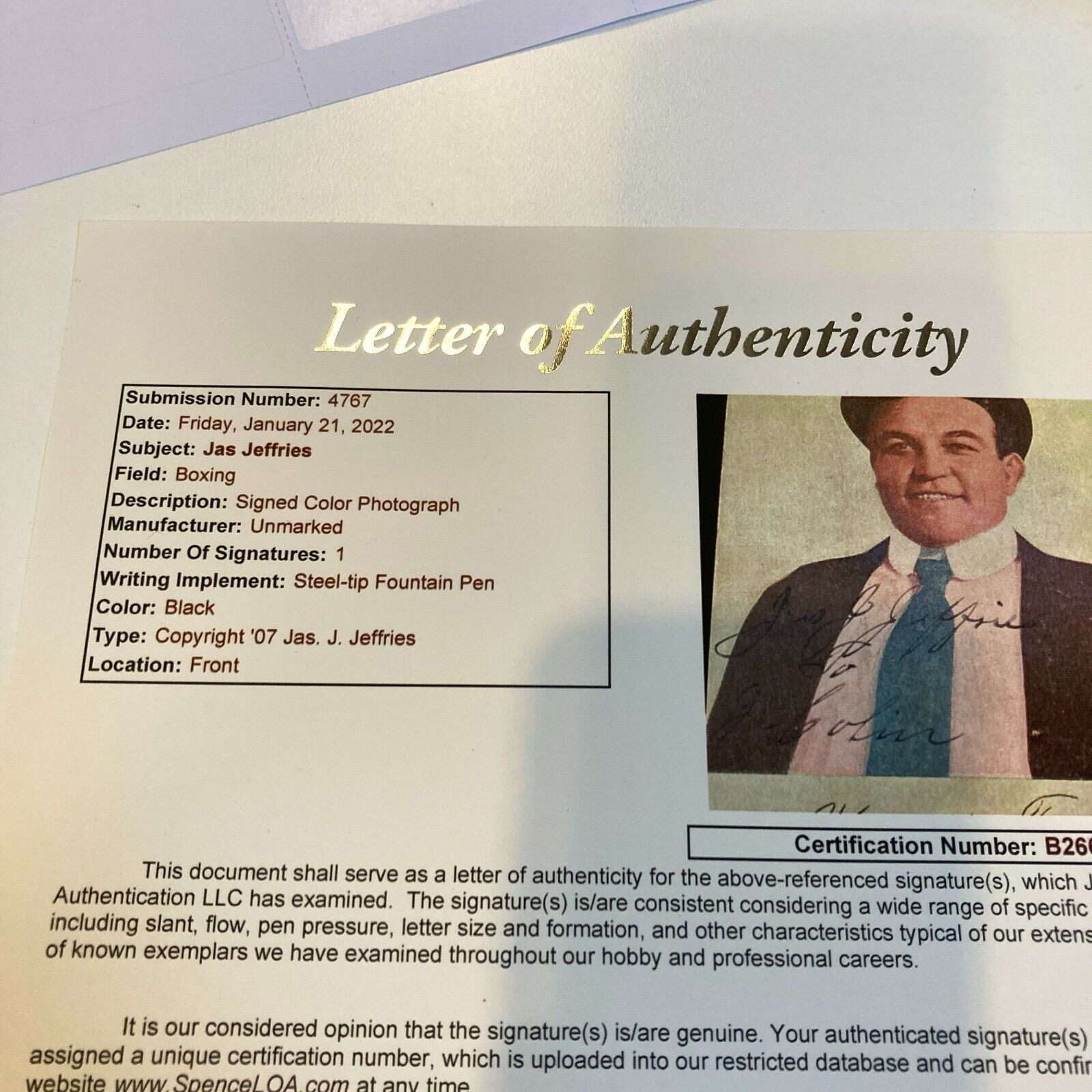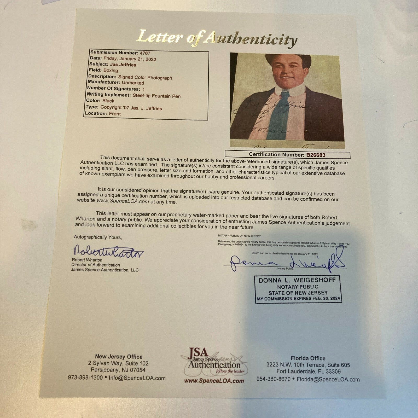 A stunning 1907 James Jeffries boxing fan card with autograph. This vibrant colorized card is marked Copyright '07 Jas. J. Jeffries #1022. The card appears to have been a private commissioned souvenir by Jeffries and is on thick stock and is hand cut. It is signed Yours Truly Jas. J. Jeffries. Jeffries was a legendary heavyweight champion but is perhaps best known for coming out of retirement to battle Jack Johnson. Jeffries died in 1953 and his signature is highly prized by boxing collectors. The card is in EX condition and has a James Spence sticker #B26683 on reverse for authentication. Full letter JSA COA.