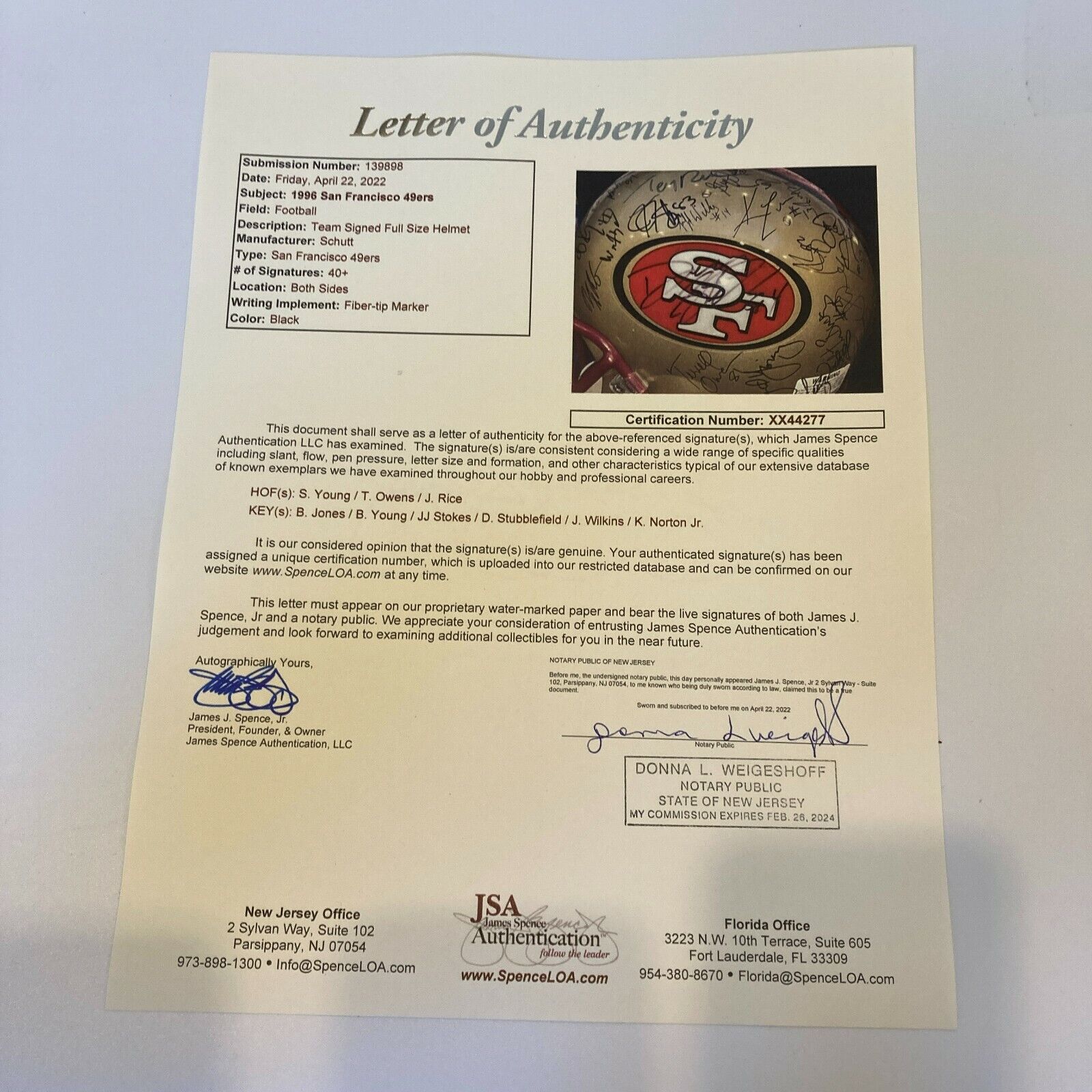 1996 San Francisco 49ers Team Signed Helmet - Rice, Young, Owens! Offered is a full-sized Air authentic San Francisco 49ers helmet signed by members of the 1996 squad. Signees include Jerry Rice, Steve Young, Terrell Owens, Bryant Young, Brent Jones, J.J. Stokes, Steve Israel, Dana Stubblefield, Gary Plummer, Kevin Mitchell, Curtis Buckley, Sean Manuel and Randy Kirk, among others.