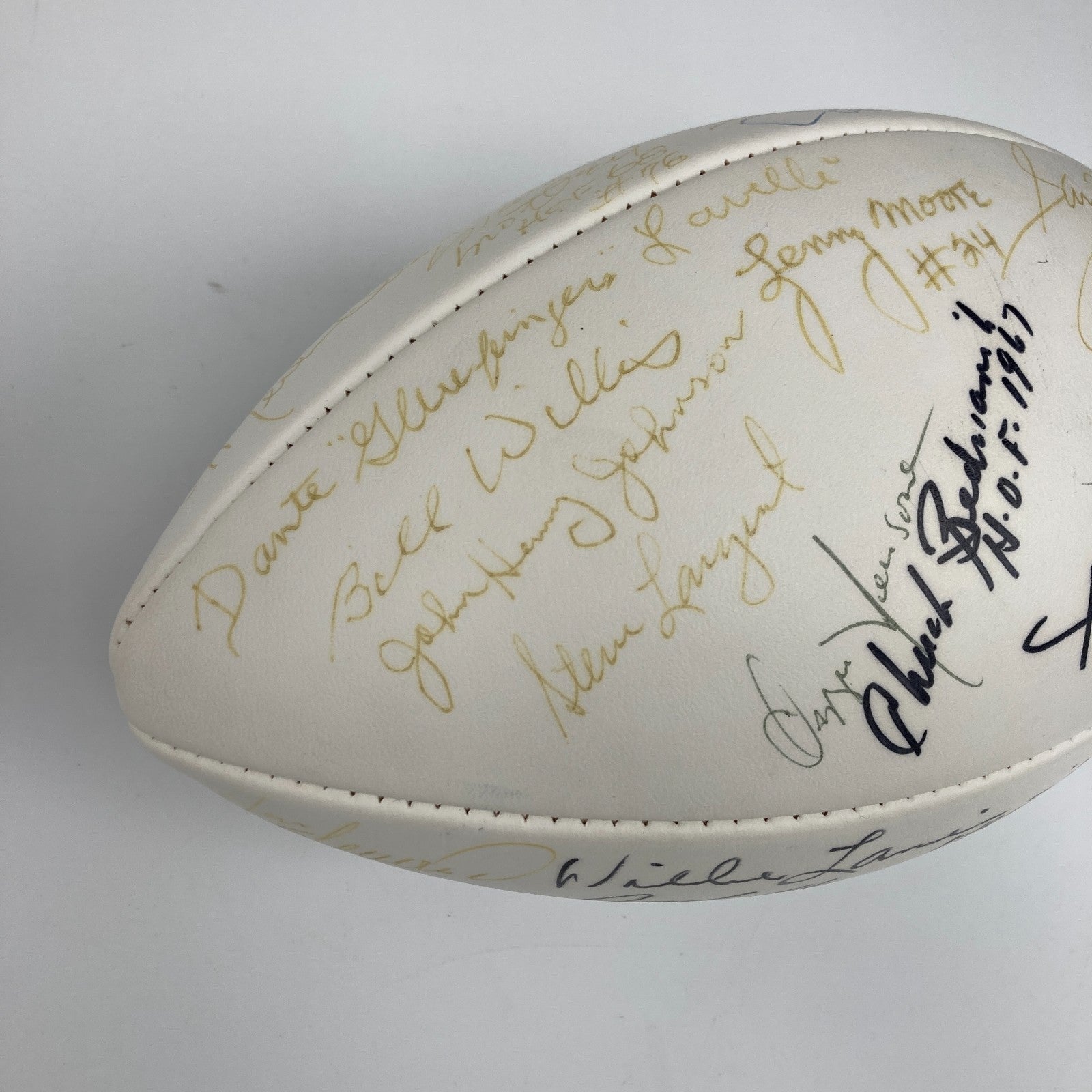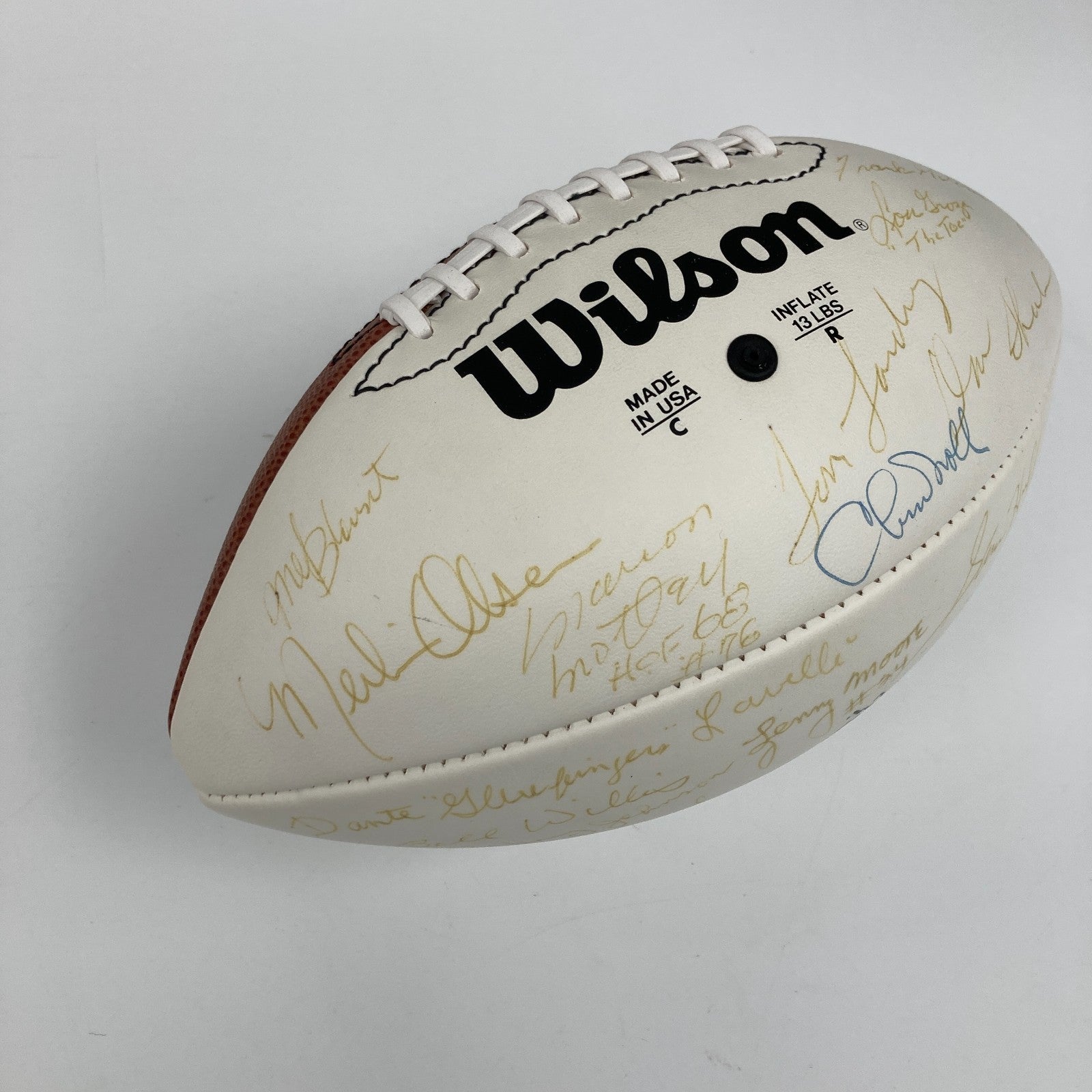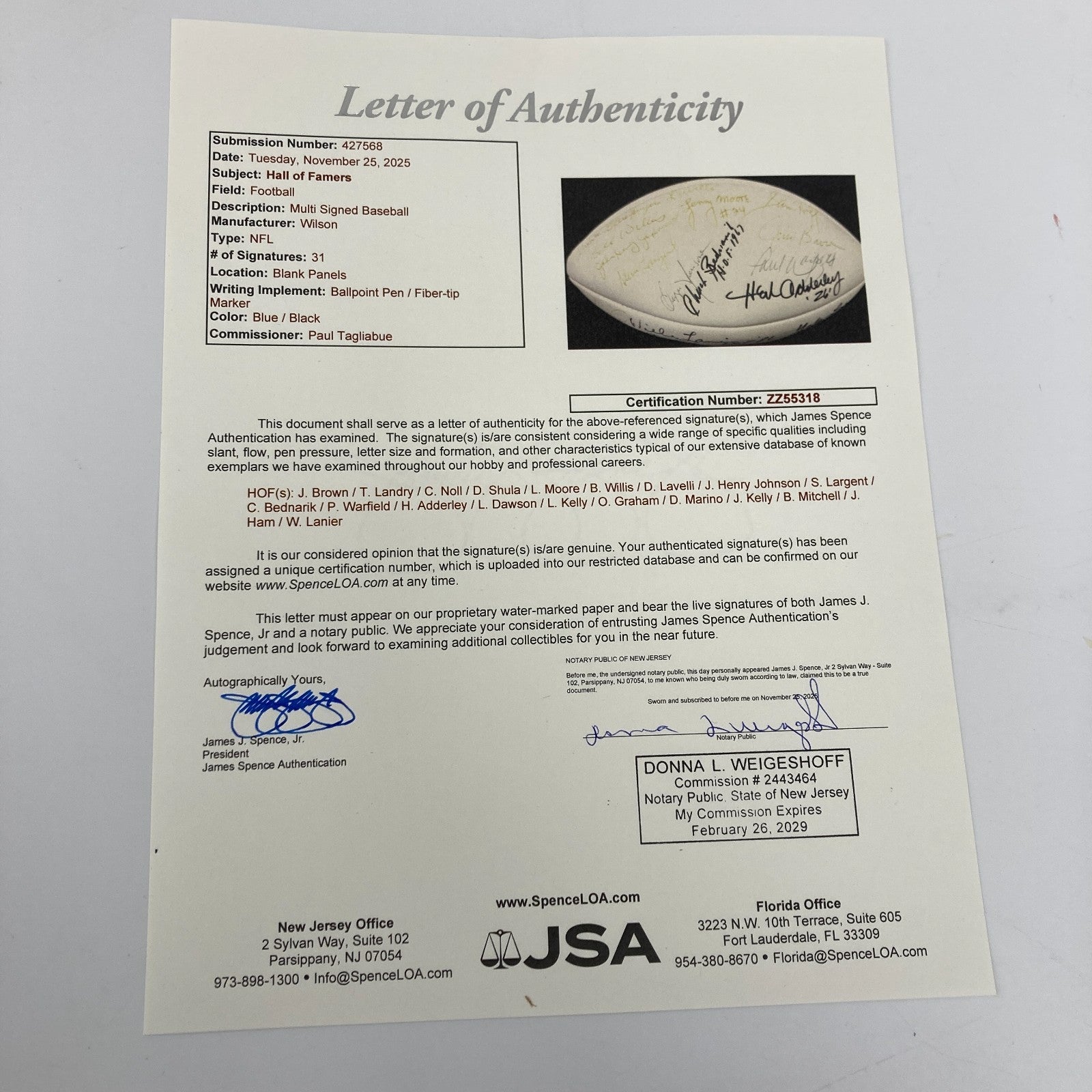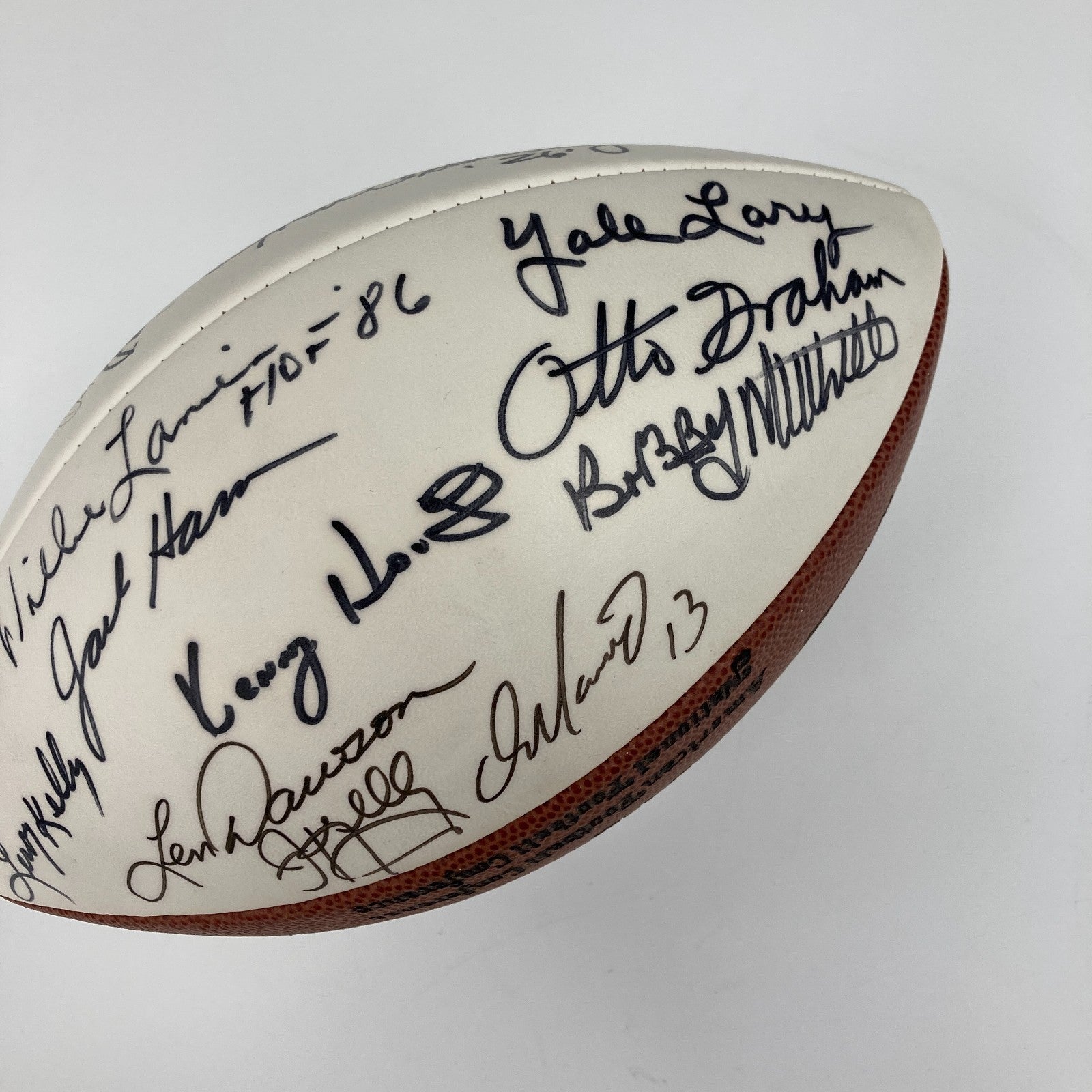 31 signatures with: Jim Brown, Tom Landry, Chuck Noll, Don Shula, Lenny Moore, Buck Willis, Dante Lavelli, John Henry Johnson, Steve Largent, Chuck Bednarik, Paul Warfield, Herb Adderley, Len Dawson, Leroy Kelly, Otto Graham, Dan Marino, Jim Kelly, Bobby Mitchell, Jack Ham, Willie Lanier and many others. Comes with full letter JSA COA.
