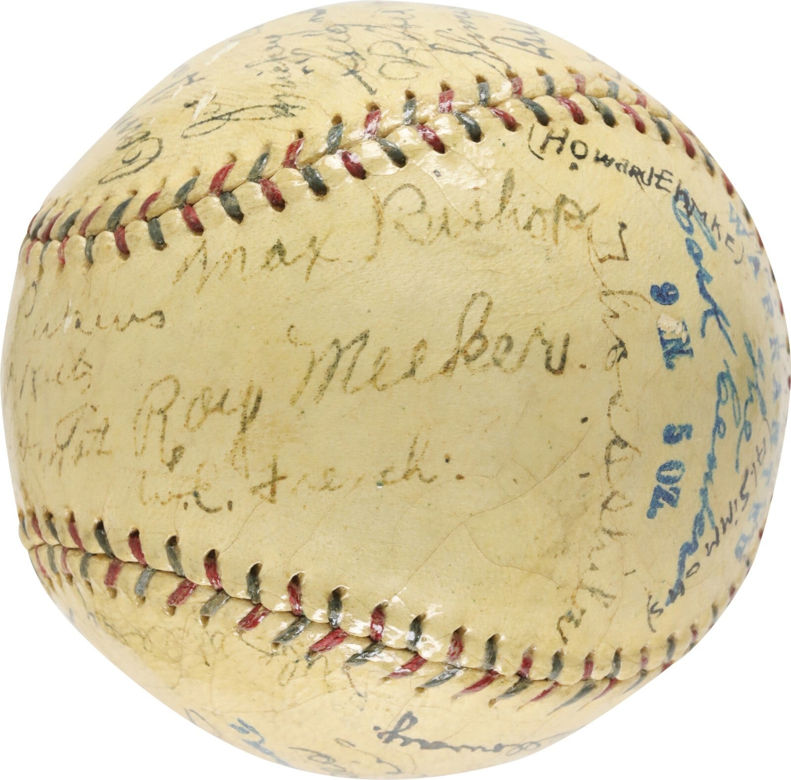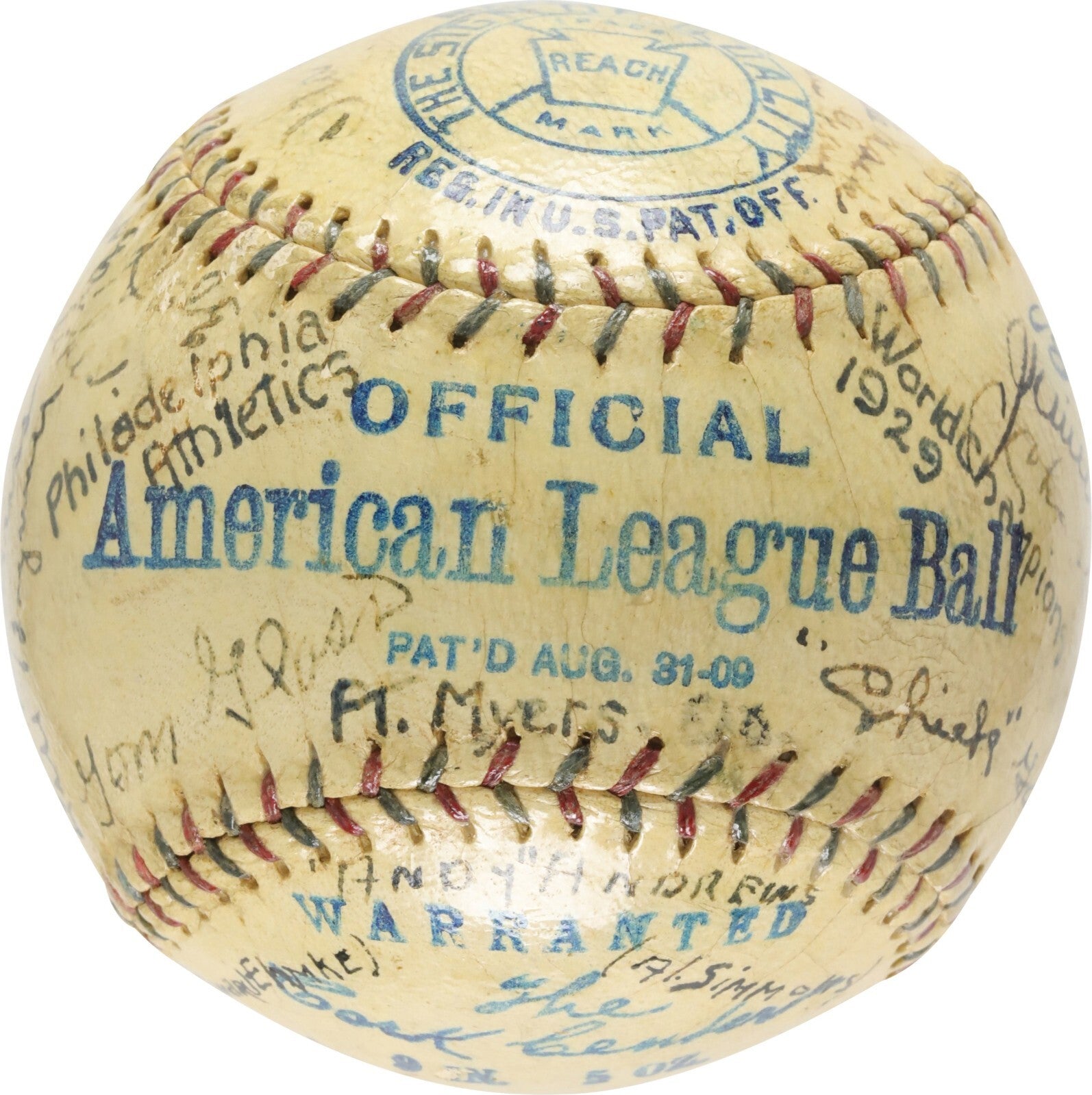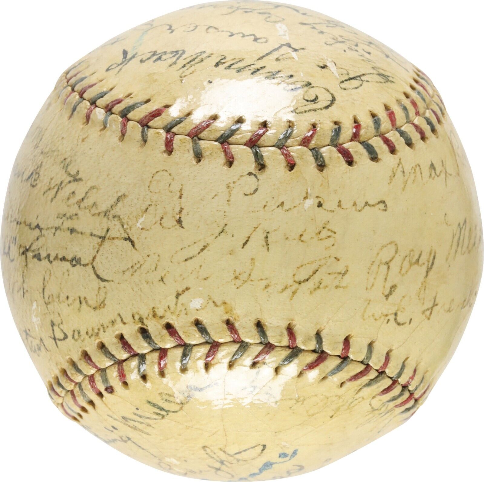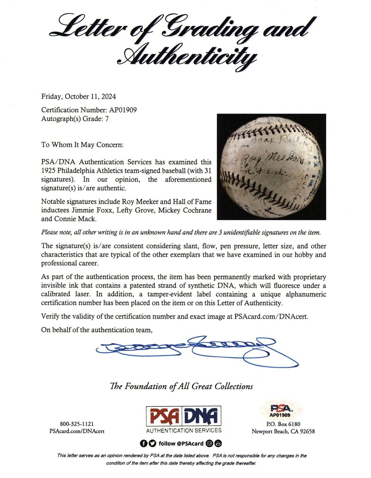 Official American League (Johnson) ball signed in black fountain pen by thirty-one members of the 1925 Philadelphia Athletics. PSA has graded the signatures NEAR MINT 7 on average. This ball is notable because it might be the earliest known baseball featuring the signature of Jimmie Foxx, who was just 17 years old at the time. Foxx dropped out of high school during his senior year to join the Athletics for spring training in 1925. Foxx began the 1925 season with Philadelphia, but manager Connie Mack sent him to the minors for more seasoning. He returned to the club in September and never returned to the minors.