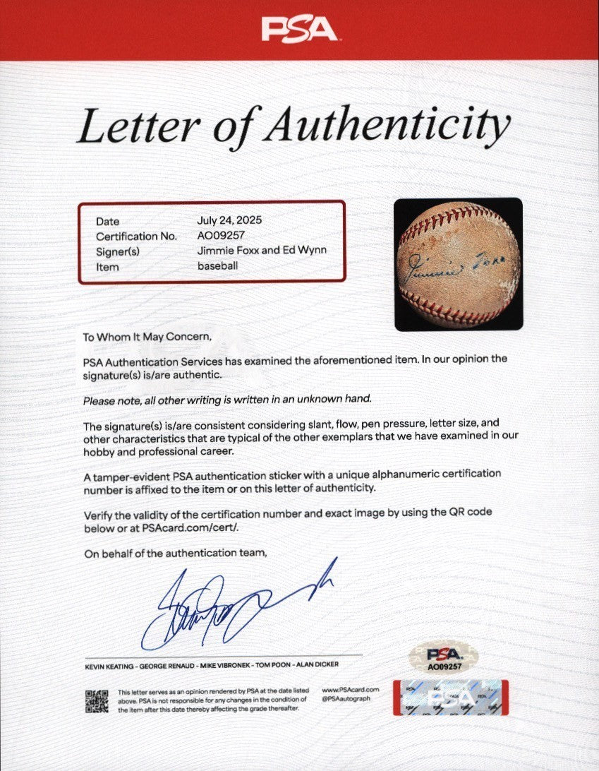 Jimmie Foxx signed and dated baseball from August 15, 1939. Foxx signed this GoldSmith Official League ball on the side panel in blue ink. There are two other signatures on the baseball as well. One signature appears to be of Ed Wynn. There is another signature, from an unknown person that includes the inscription, "To my sweetheart." All signatures are on the side panel of the baseball. Also written on one of the side panels is the details of a game between the Belmar Braves and Cuban Stars. The inscription reads, "Aug 15, 1939, Belmar Braves 6, Cuban Stars 0." The Braves and Stars are former Negro League teams. The baseball is in good condition overall. Full LOA from PSA.