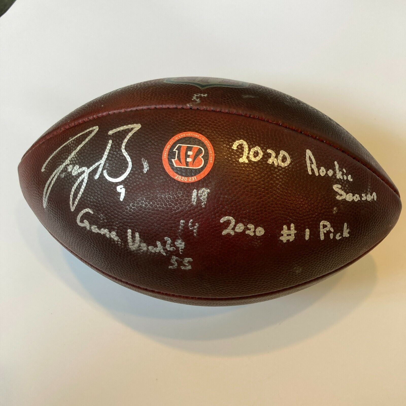 Wilson R.Goodell Official NFL football was used in the Bengals September 13th, 17th, and 27th games along with their October 4th, 2020 games. This includes Joe Burrow's debut game and the game in which he threw his first touchdown pass. Signed "Joe Burrow" and inscribed "Game Used, 2020 Rookie Season, 2020 #1 Pick" in silver marker. An included Certificate of Authenticity from the Bengals confirms that it was used in the games and the Bengals logo is imprinted on the side panel. Additional markings above and below were applied by the team. The ball shows game use and there are a pair of Fanatics authentication holograms affixed. One of the only team certified balls to have surfaced from this series of games (and possibly the only one). These games included not only Burrow's NFL debut but also the first game in which he threw for a touchdown pass. His 2021 season has proved to be one of the most impressive and historic in recent years having led the Bengals to an improbable Super Bowl appearance.