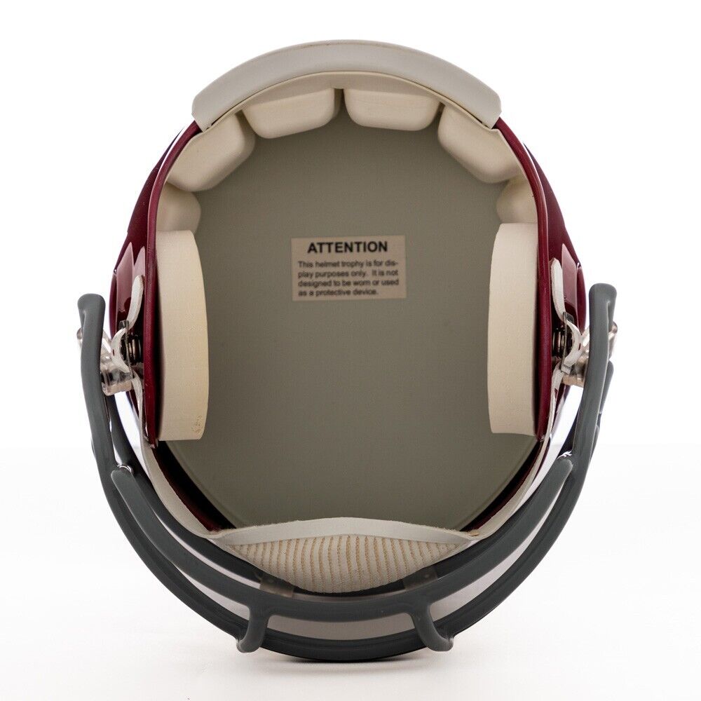 Before he became known as “Broadway Joe” and led the New York Jets to victory in Super Bowl III, Joe Namath would lead the Alabama Crimson Tide to a 10-1 record in 1964, earning the school it’s seventh National Championship. Offered here, is this Alabama Crimson Tide signed by Namath. A full-size Riddell made throwback replica model in Alabama’s crimson colour, Namath’s number “12” appears over each side in white numerals while a white stripe runs front to back over the top and a “Bama” wordmark logo graces the front bumper. Remaining in excellent condition with just a couple of small spots present throughout, the helmet comes complete with all its padding on the interior as well as the chin strap/cup. Signed by Namath in silver ink with his full name of “Joe Willie Namath” over the numerals on the right side, the autograph displays with no issues whatsoever. Having had a PSA/DNA sticker numbered “4A97629” applied over the lower reverse, a matching PSA/DNA COA will accompany the piece.