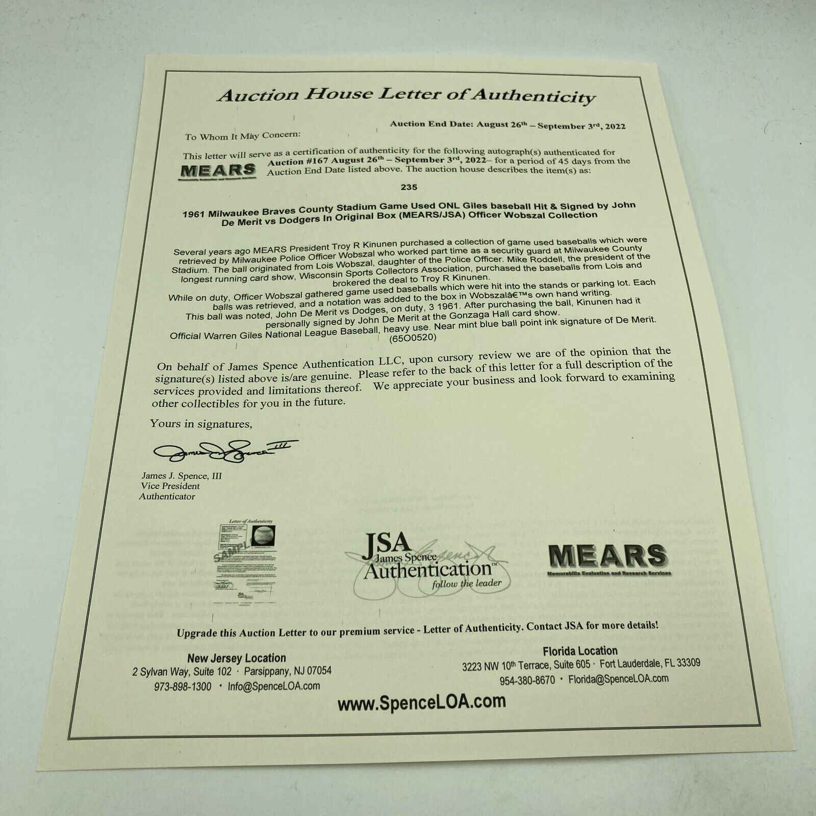 John De Merit Signed 1961 Actual Hit Game Used Baseball Milwaukee Braves JSA COA