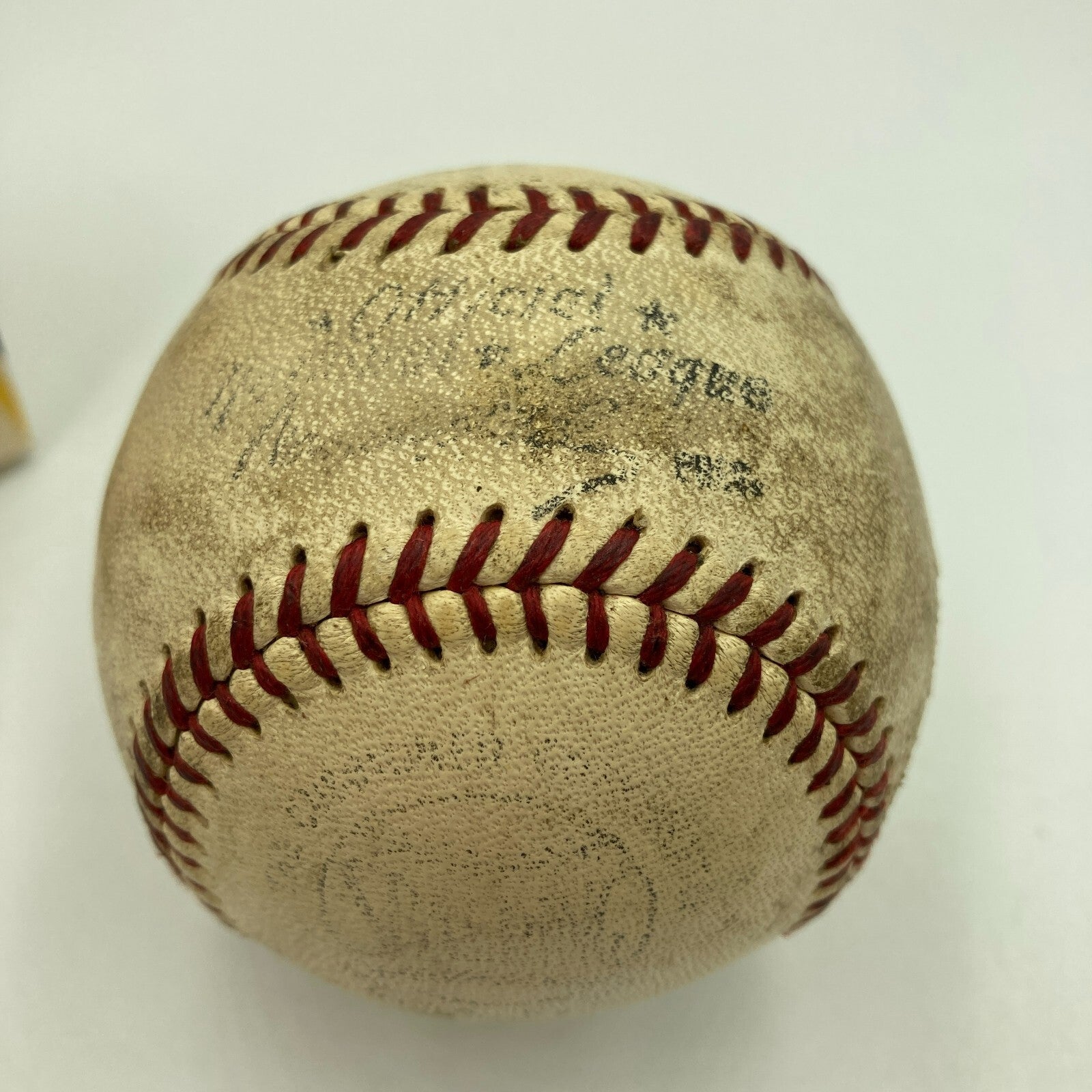 This ball was noted, John De Merit vs Dodges, on duty, 3 1961. After purchasing the ball, Kinunen had it personally signed by John De Merit at the Gonzaga Hall card show.