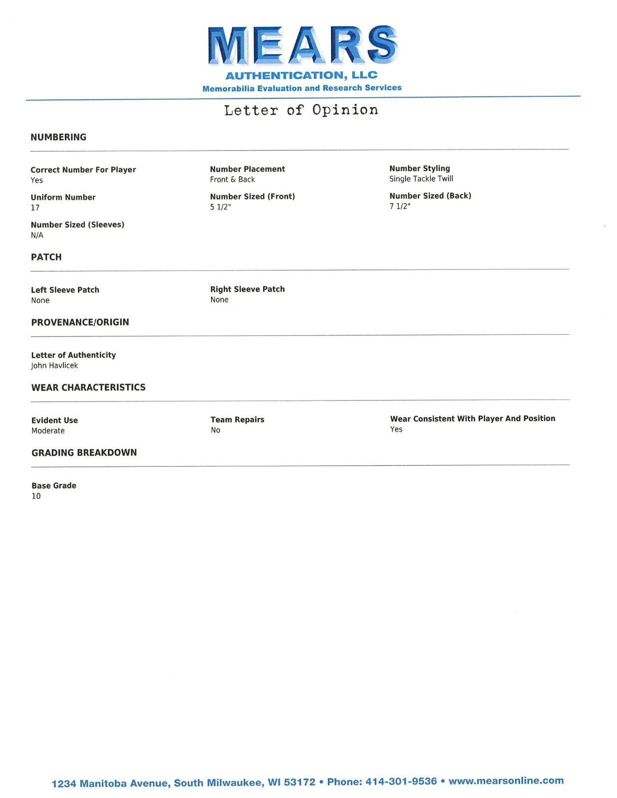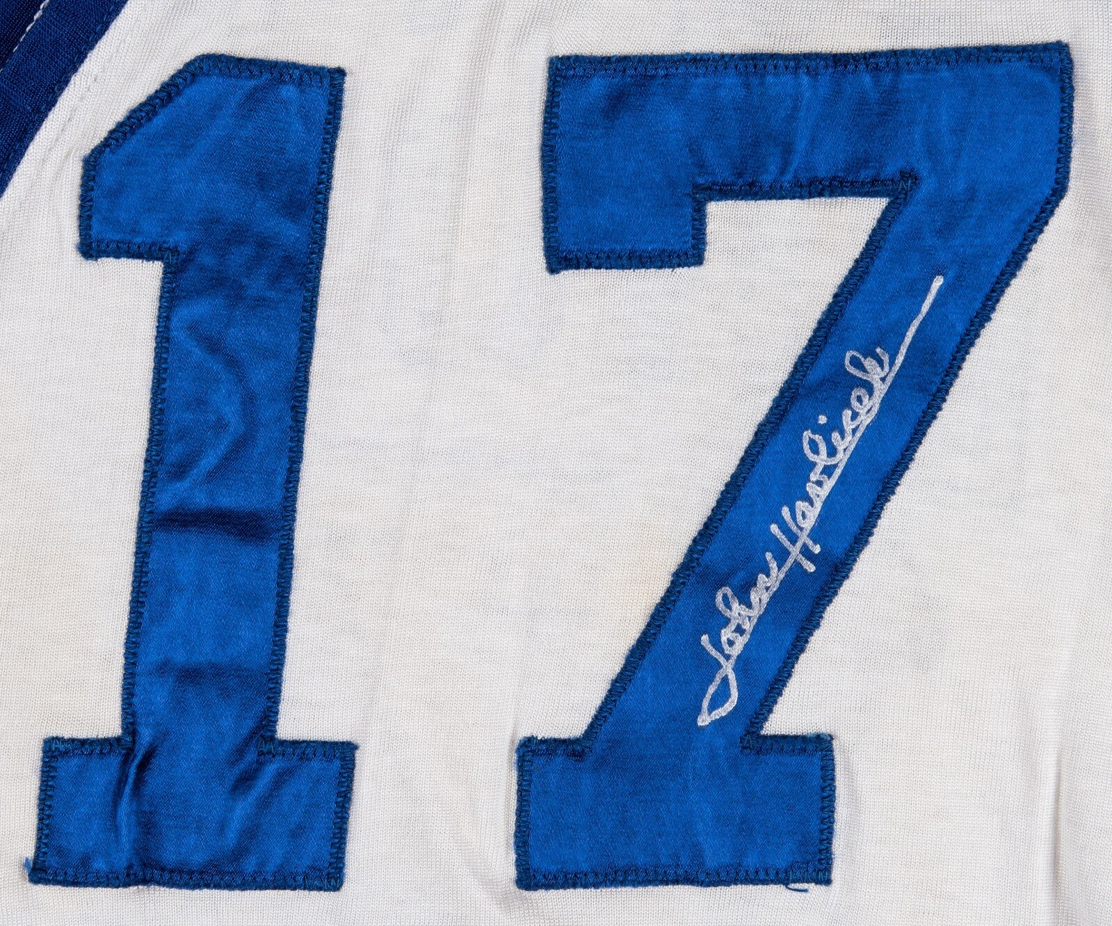 The offered Wilson uniform worn by Havlicek during his first All-Star Game appearance is made of Durene fabric. The jersey features blue trim on the collars, sleeves, and sides, with three white tackle twill stars also adorning each side. "EAST" appears across the chest in blue tackle twill, while the number "17" appears in blue tackle twill on the chest and back of the jersey. A Wilson size "44" tag is sewn onto the left front tail. The jersey displays moderate evidence of game use. Havlicek penned his flowing signature across the number "7" on the back of the jersey. The signature is bold and clear.