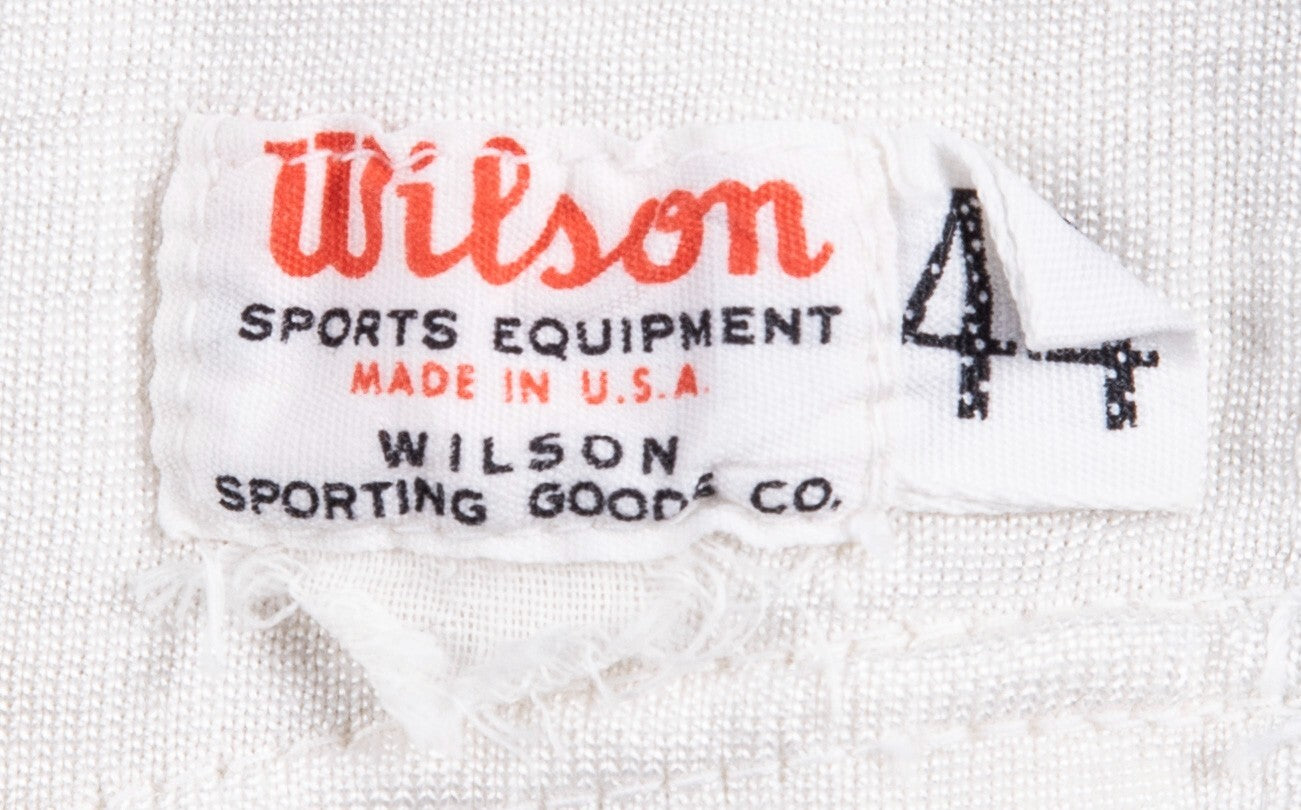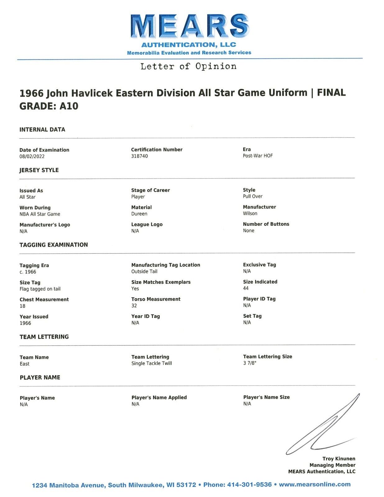 The white Wilson shorts are made from the same Durene fabric and feature blue trim across the waistband and on the legs. Each side of the shorts features a blue stripe with three white tackle twill stars. A Wilson tag with a size "36" flag rests on the inside waistband. The shorts display moderate evidence of game use. The entire uniform worn by John Havlicek during the 1966 NBA All-Star Game comes with an LOA from MEARS (318740), which has given the jersey the highest possible grade of A10. An LOA signed by John Havlicek also accompanies the uniform. Additionally, the jersey comes with an LOA from JSA for Havlicek's signature.