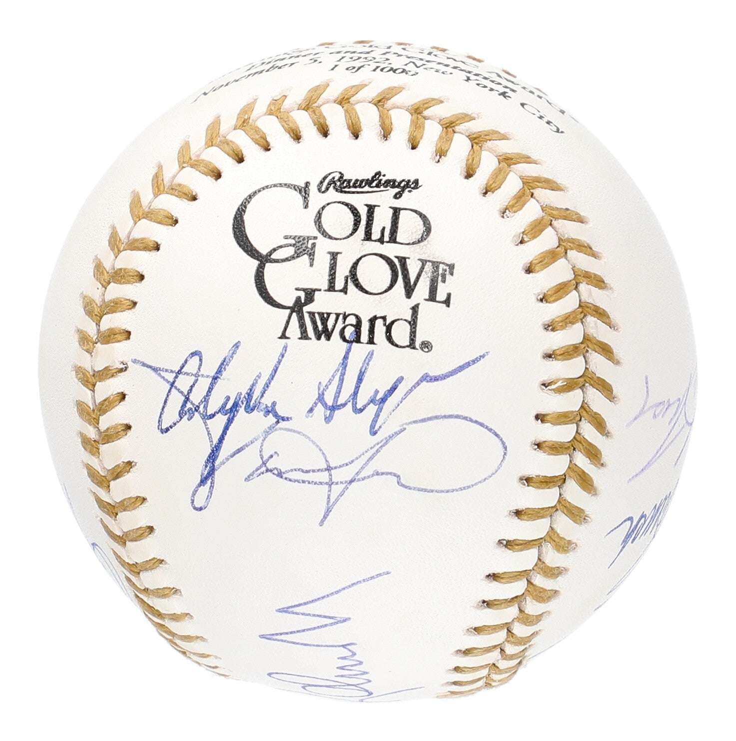 Offered is a Rawlings Gold Glove baseball signed by nine Hall of Famers and MLB stars. The ball includes blue ink signatures from Hall of Famers Johnny Bench, Andre Dawson, Brooks Robinson, Ozzie Smith, and Ivan Rodriguez, with additional signatures from Tom Tresh, Jose Lind, and Andy Van Slyke. The ball comes with an LOA from PSA/DNA (AM04955) for the signatures.