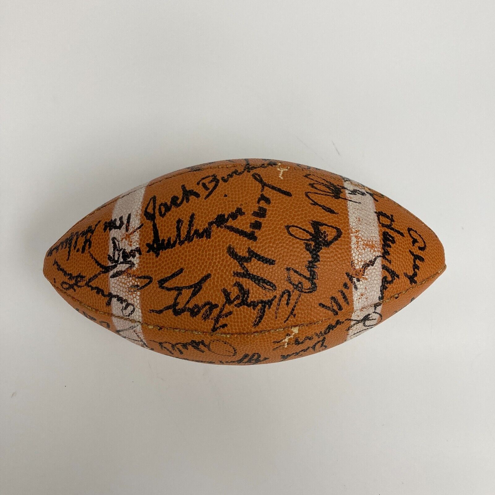 Bold autographs decorate this 1962 Baltimore Colts team-signed football. This Collette Official Size College 373 ball hosts (25+) autographs, which are bold black felt-tip pen applications. Key signers are Hall of Famers Unitas, Marchetti, and Parker. The inclusion of taxi-squad member Keckin pinpoints the team to 1962, his only season with the Colts. The balance of signers are Braase, Mackey, Szymanski, Owens, Clemens, Feagin, Lyles, Hawkins, Gilburg, Burkett, Sullivan, Shinnick, Smith, Sandusky, Pyle, Thompson, Saul, Preas, Harris, and several undetermined.