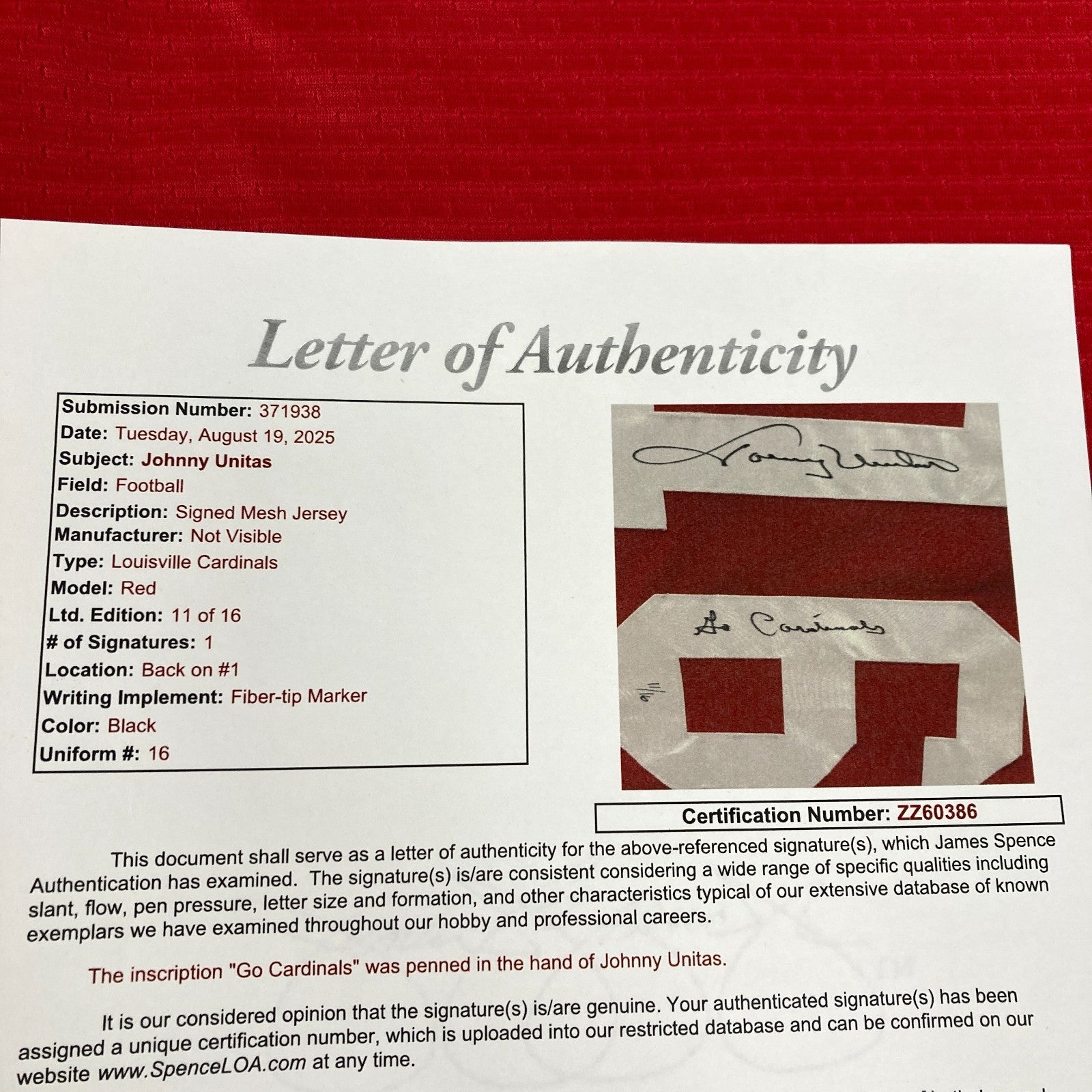 Louisville Cardinals jersey number 16, signed and inscribed by Hall of Famer Johnny Unitas. Numbered 11/16. Likely part of a small, private signing, the jersey has a Mounted Memories hologram. Full LOA from James Spence Authentication.