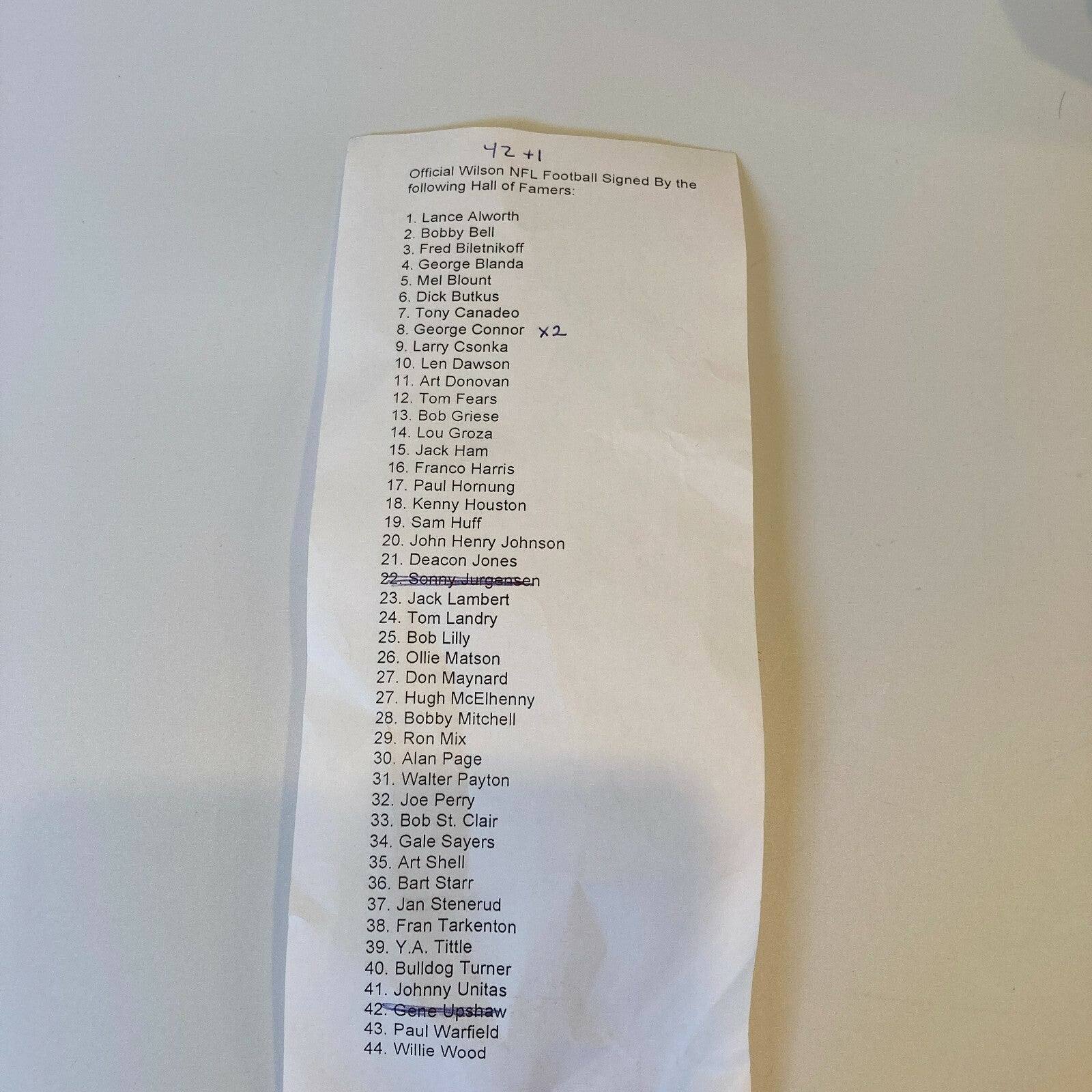 This Wilson white panel football is signed by 41 NFL HOFers, led by Johnny Unitas, Bart Starr and Walter Payton. Other signatures include: Lance Alworth, Bobby Bell, Fred Biletnikoff, George Blanda, Mel Blount, Dick Butkus, Tony Canadeo, George Connor, Larry Csonka, Len Dawson, Art Donovan, Tom Fears, Bob Griese, Lou Groza, Jack Ham, Franco Harris, Paul Hornung, Sam Huff, John Henry Johnson, Deacon Jones, Jack Lambert, Tom Landry, Bob Lilly, Ollie Matson, Don Maynard, Hugh McElhenny, Bobby Mitchell, Ron Mix, Alan Page, Joe Perry, Bob St. Clair, Gale Sayers, Art Shell, Jan Stenerud, Fran Tarkenton, Y.A. Tittle, Bulldog Turner, Paul Warfield, Willie Wood and others.