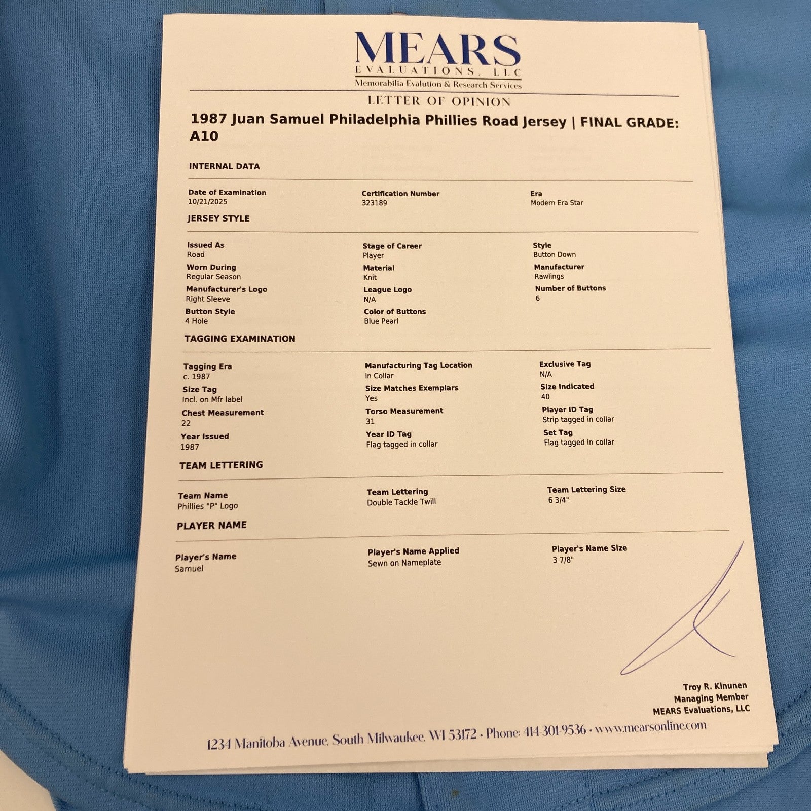 Juan Samuel 1987 Game Used Philadelphia Phillies Jersey MEARS A10 The Finest